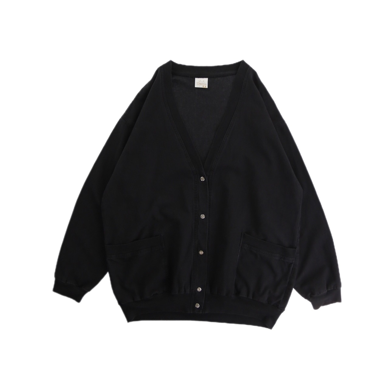 古着市場でも極めて珍しいコットンファブリックのカーディガン。ざっくり開いたフロントにスナップボタン。ブラックに映えるシルバーの色味がいいアクセントに◎