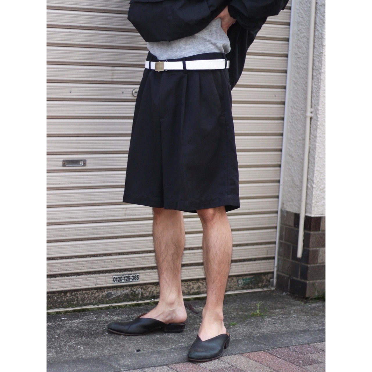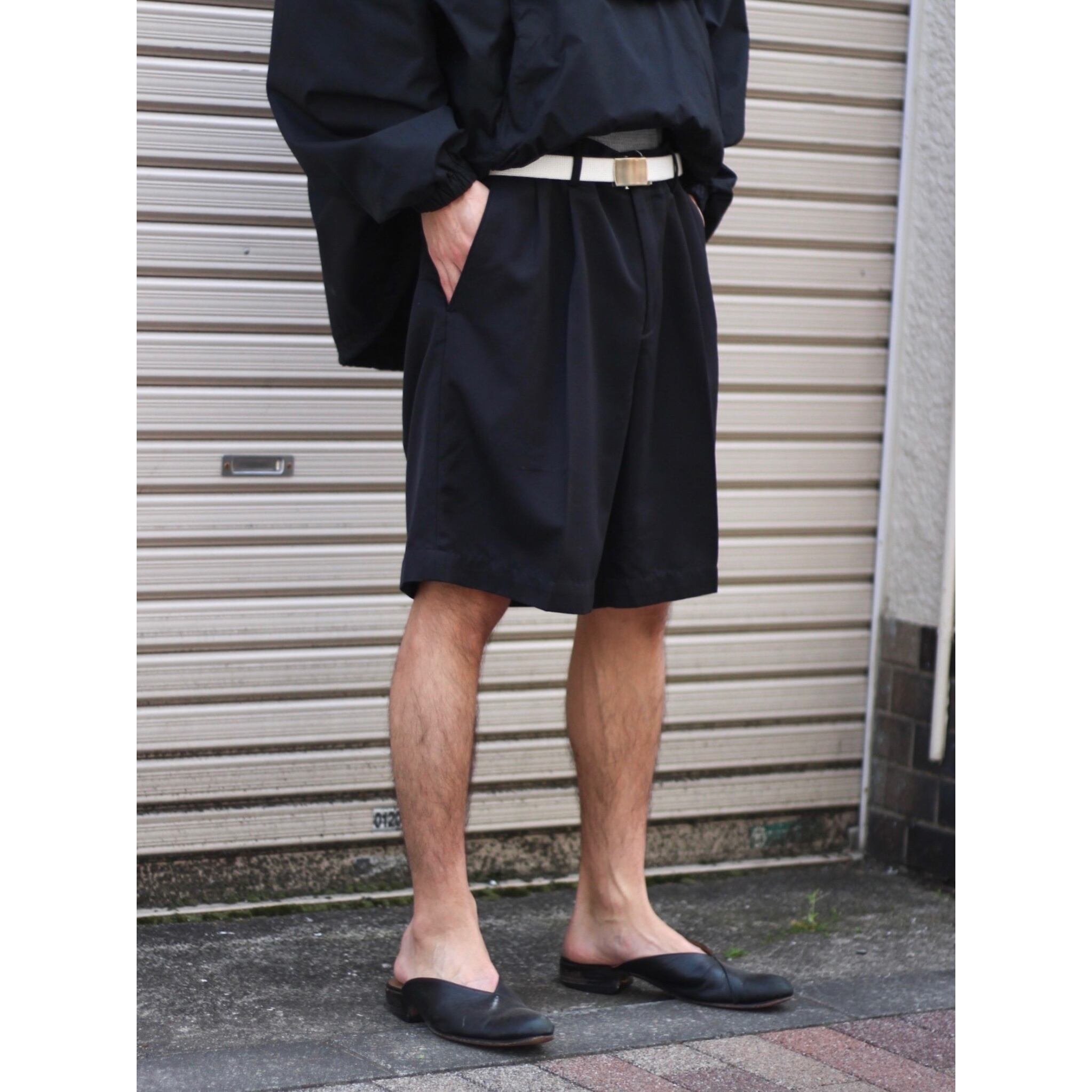 ブラックカラーの2タックショーツ。素材はマイクロポリで軽快で滑らかでコシのあるスムース地に仕立てたファブリック。とても軽やかでストレスのない着心地
