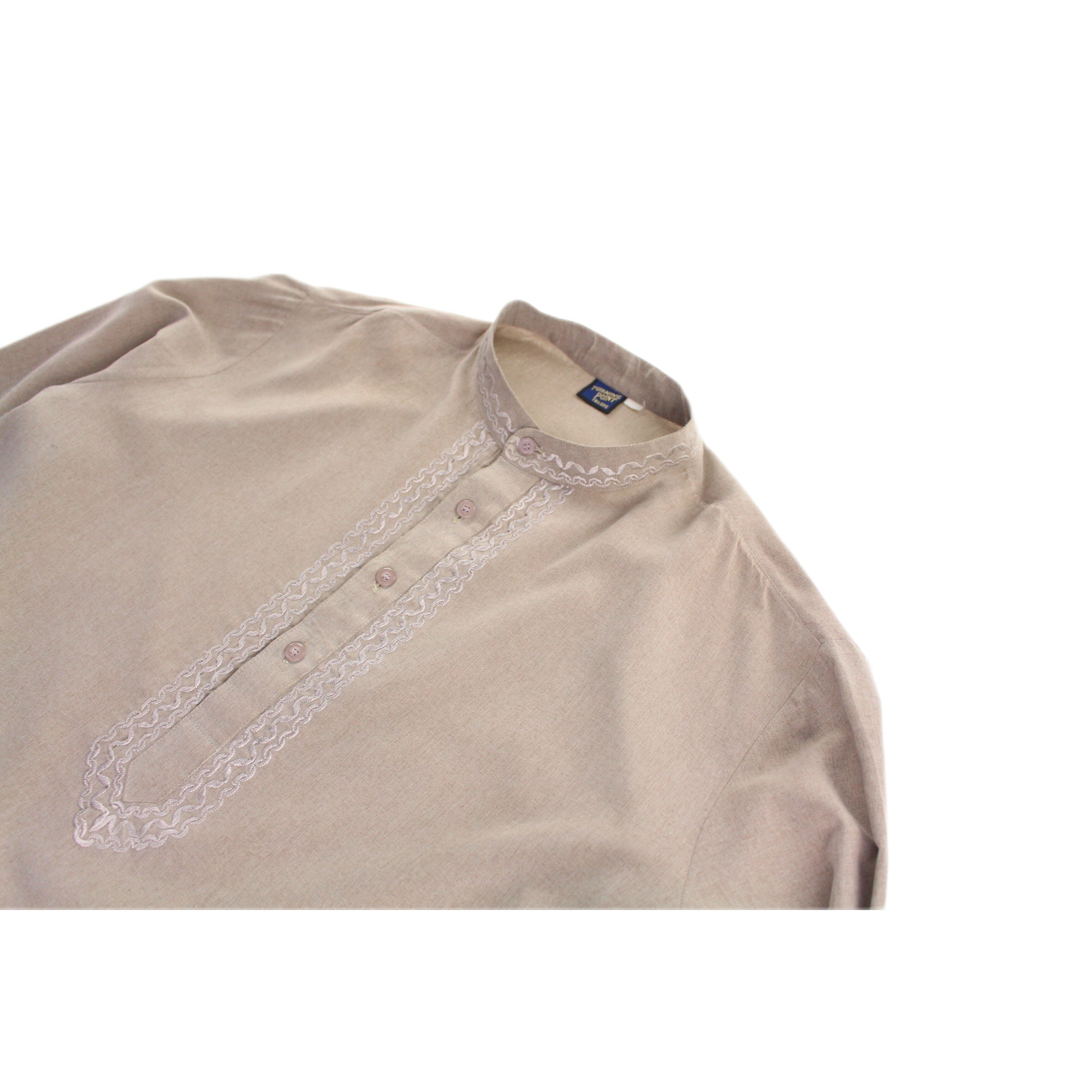 襟元はバンドカラーになってて、4ボタンのプルオーバータイプ。首元と袖口にさり気なく同色で刺繍デザインが控えめなのですが良い雰囲気です☺︎