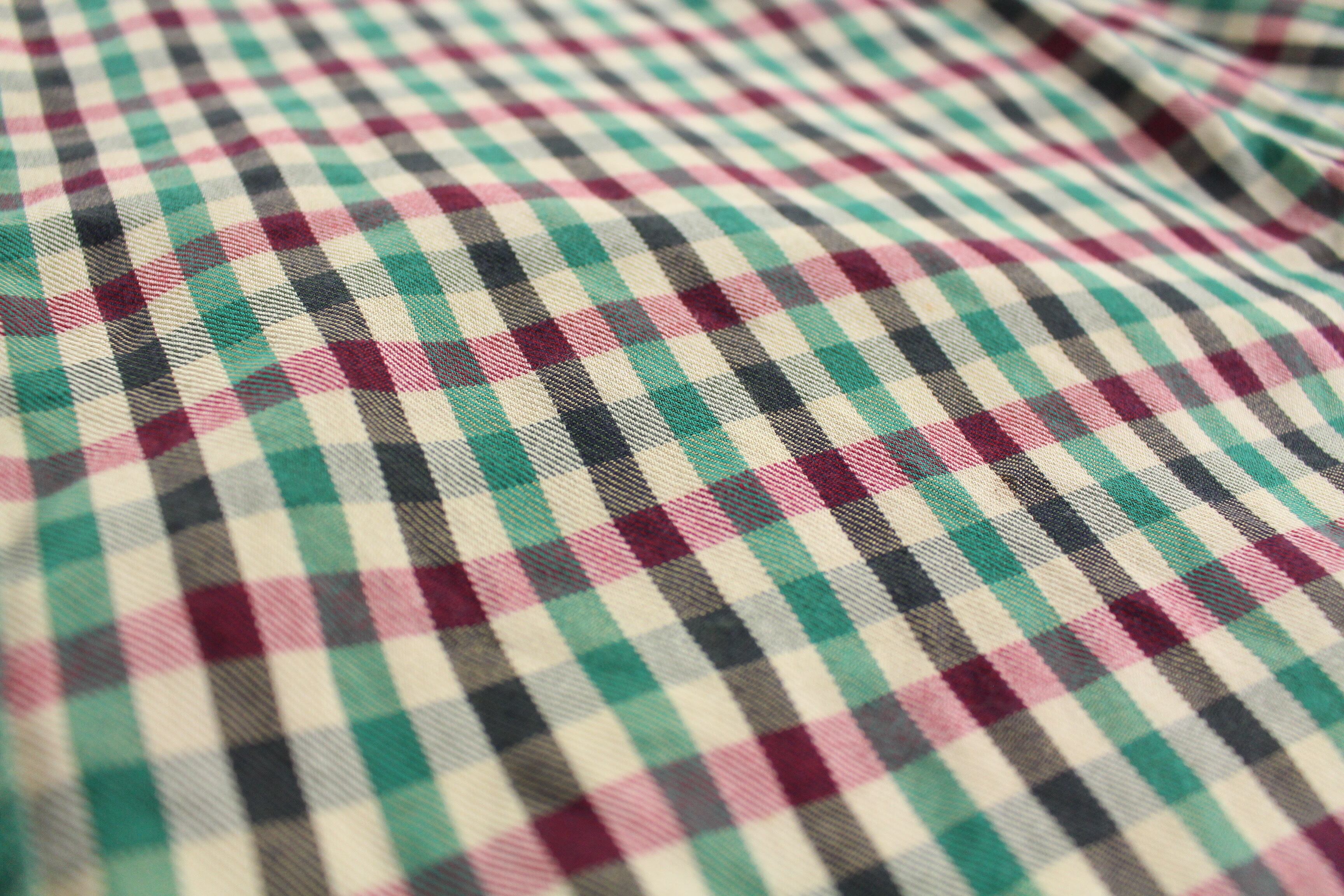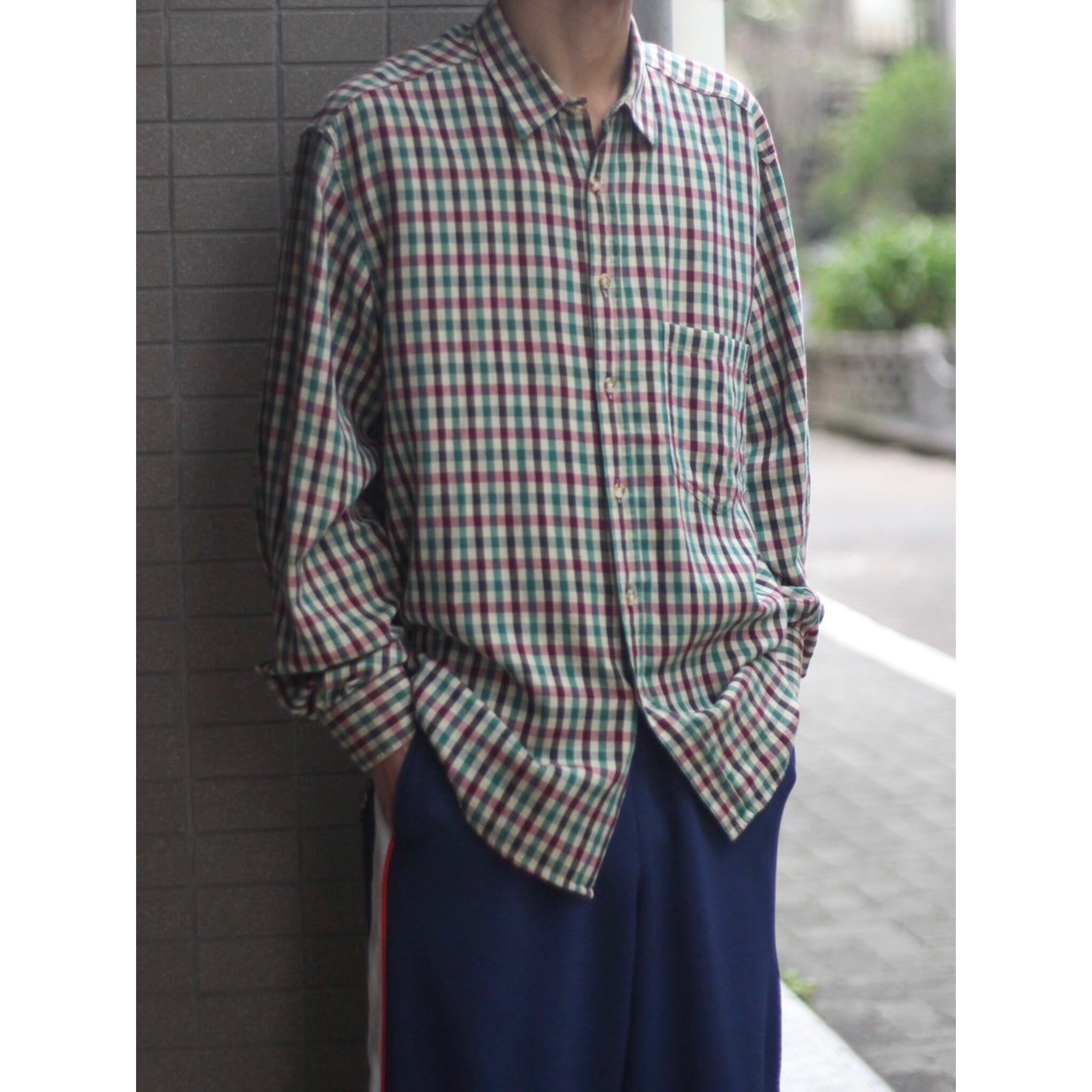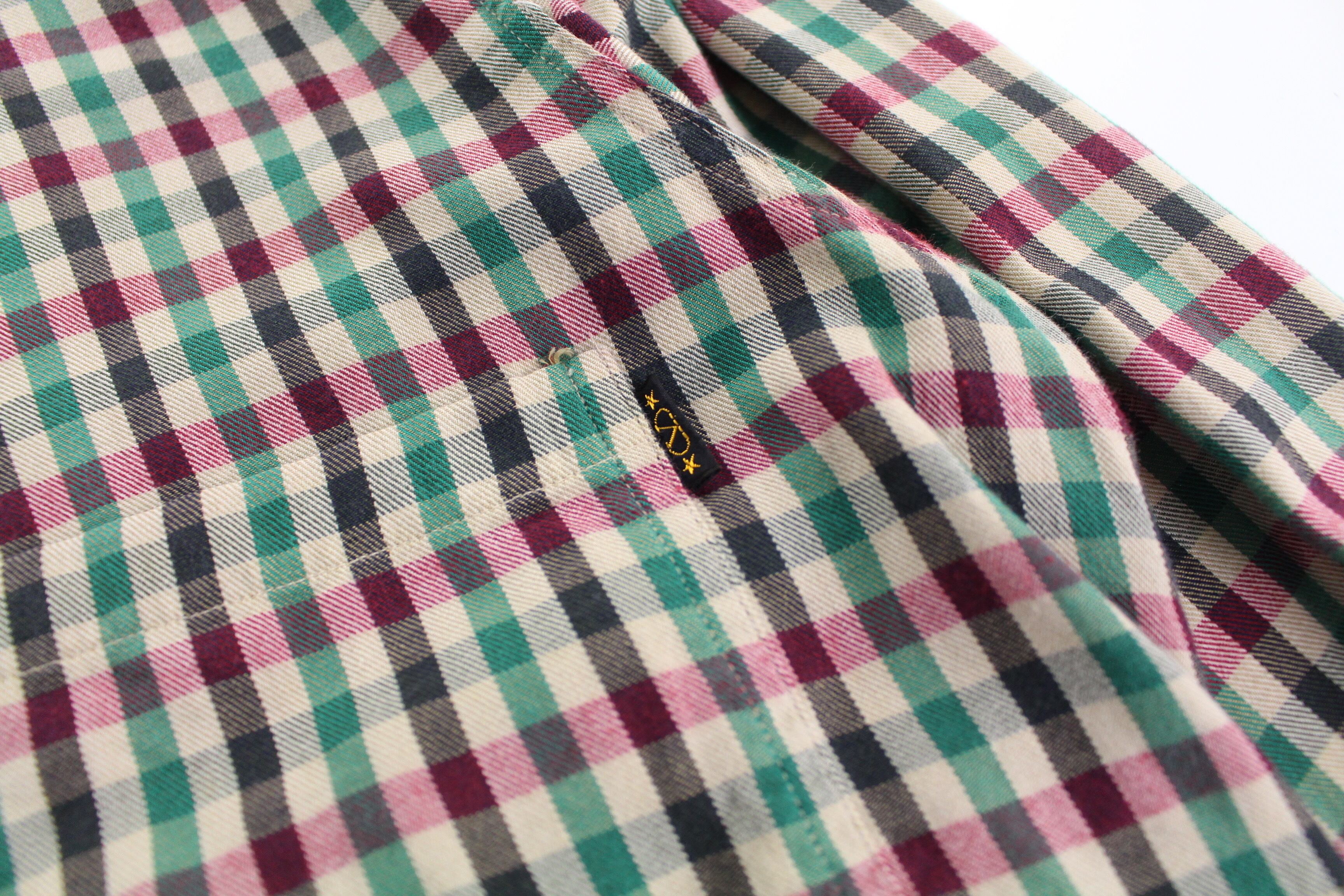 ベージュベースにグリーン、レッドの洒落たチェック柄が上品なシャツです