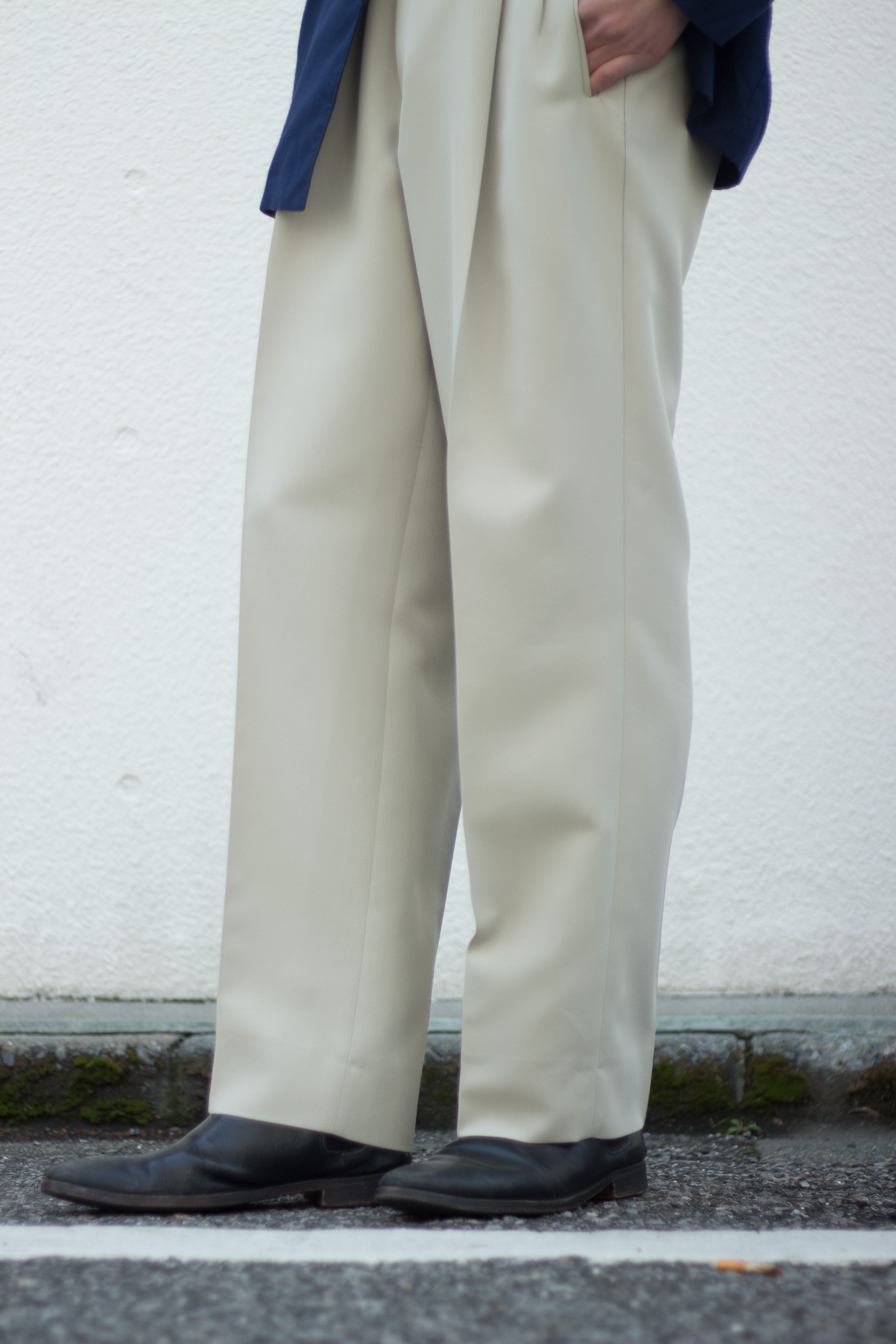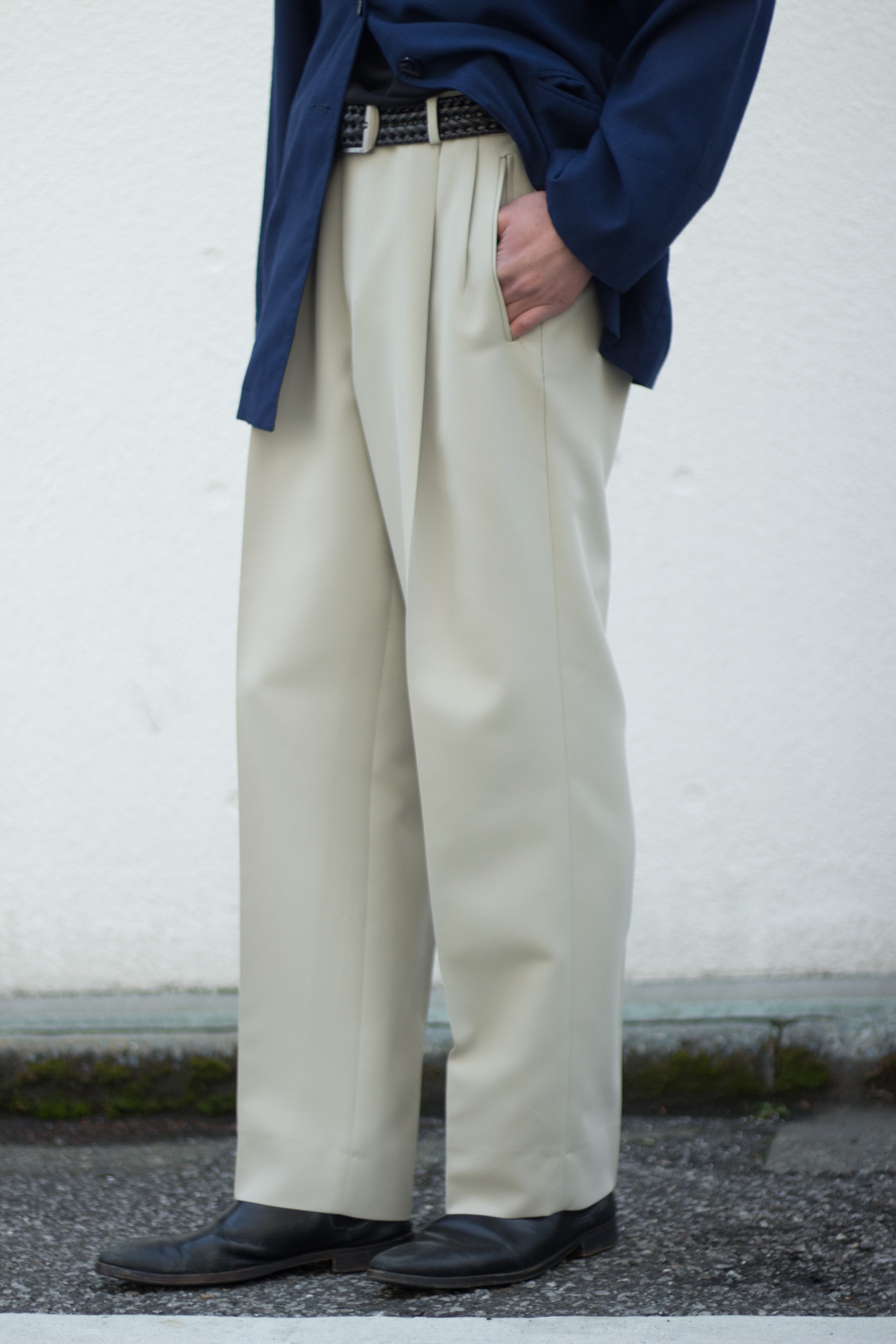 ウエストは2タック仕様に程良いワイドシルエットにクセのない綺麗な弱テーパード。どんなトップスにも合わせやすい汎用性高いスラックスです
