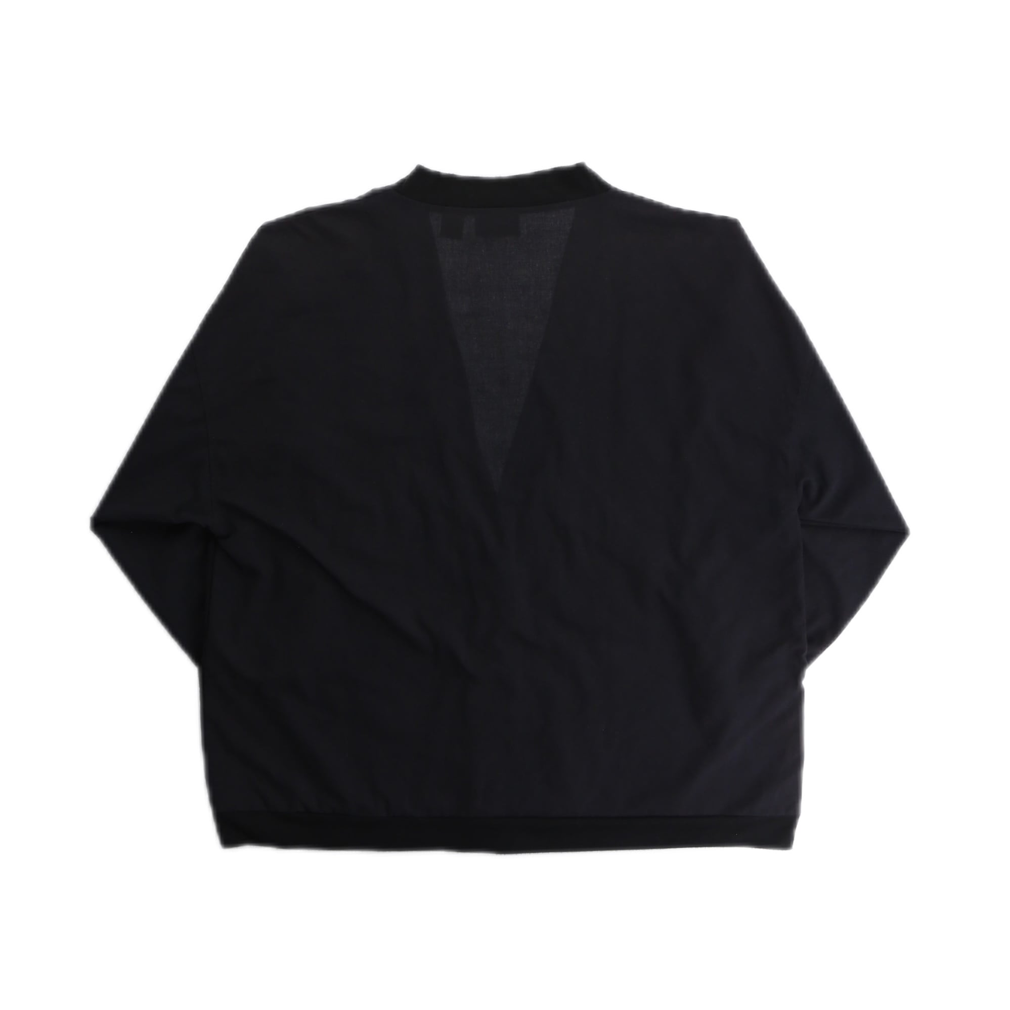 フロントはノーカラーに4ボタンで開閉。首元、袖口、裾はリブ仕様に両サイドはハンドポケットが付くカーディガンデザイン。