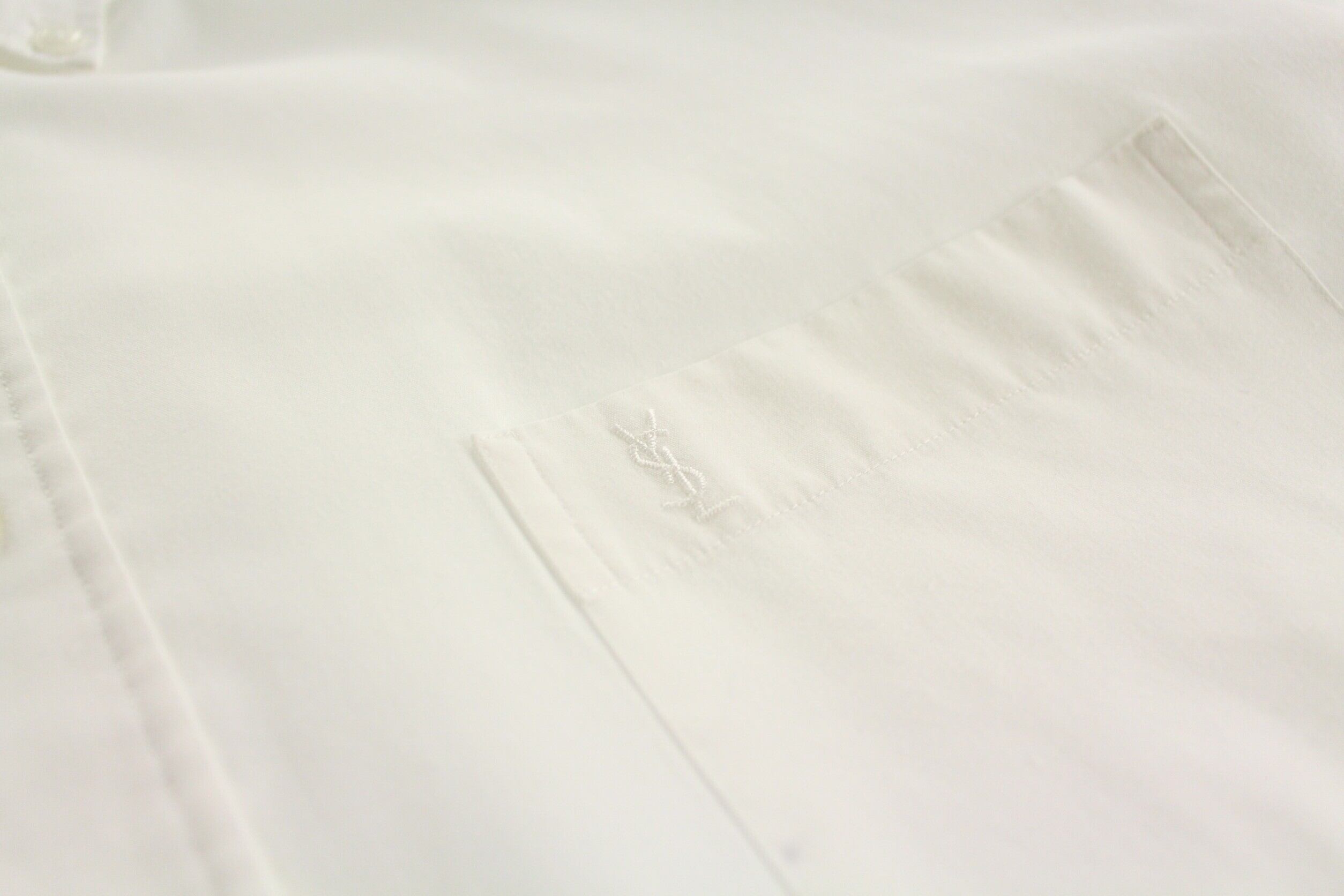 イヴ・サンローランの半袖白シャツ。ブランドらしいポリコットンのサラサラとした生地感に透け感ある生地がとても上品で色気あるファブリック