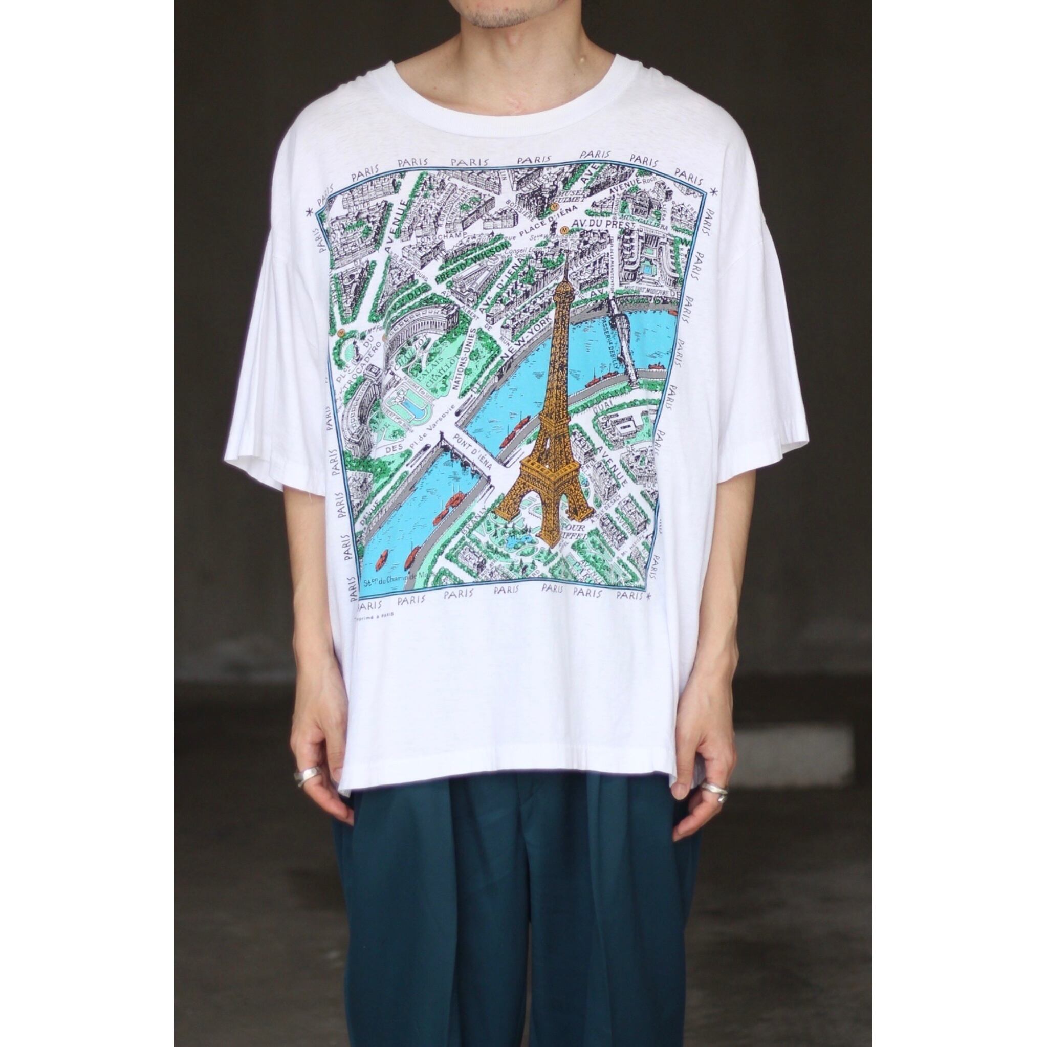 絵柄はフランスのマッププリント。パリの象徴であるエッフェル塔と周辺が細かく描かれたアートな1枚。背面にもプリントがありとても存在感のあるTシャツだと思います☺︎