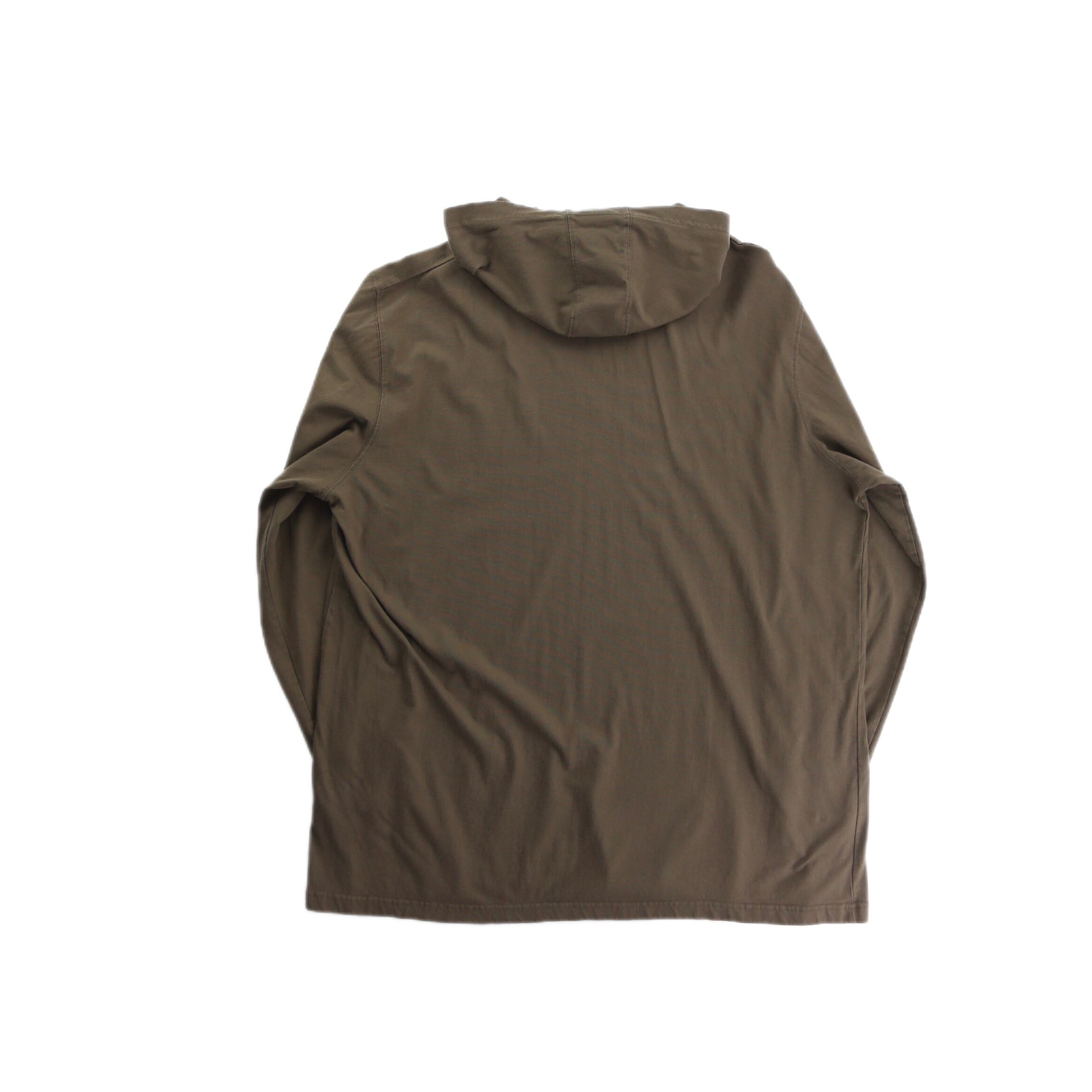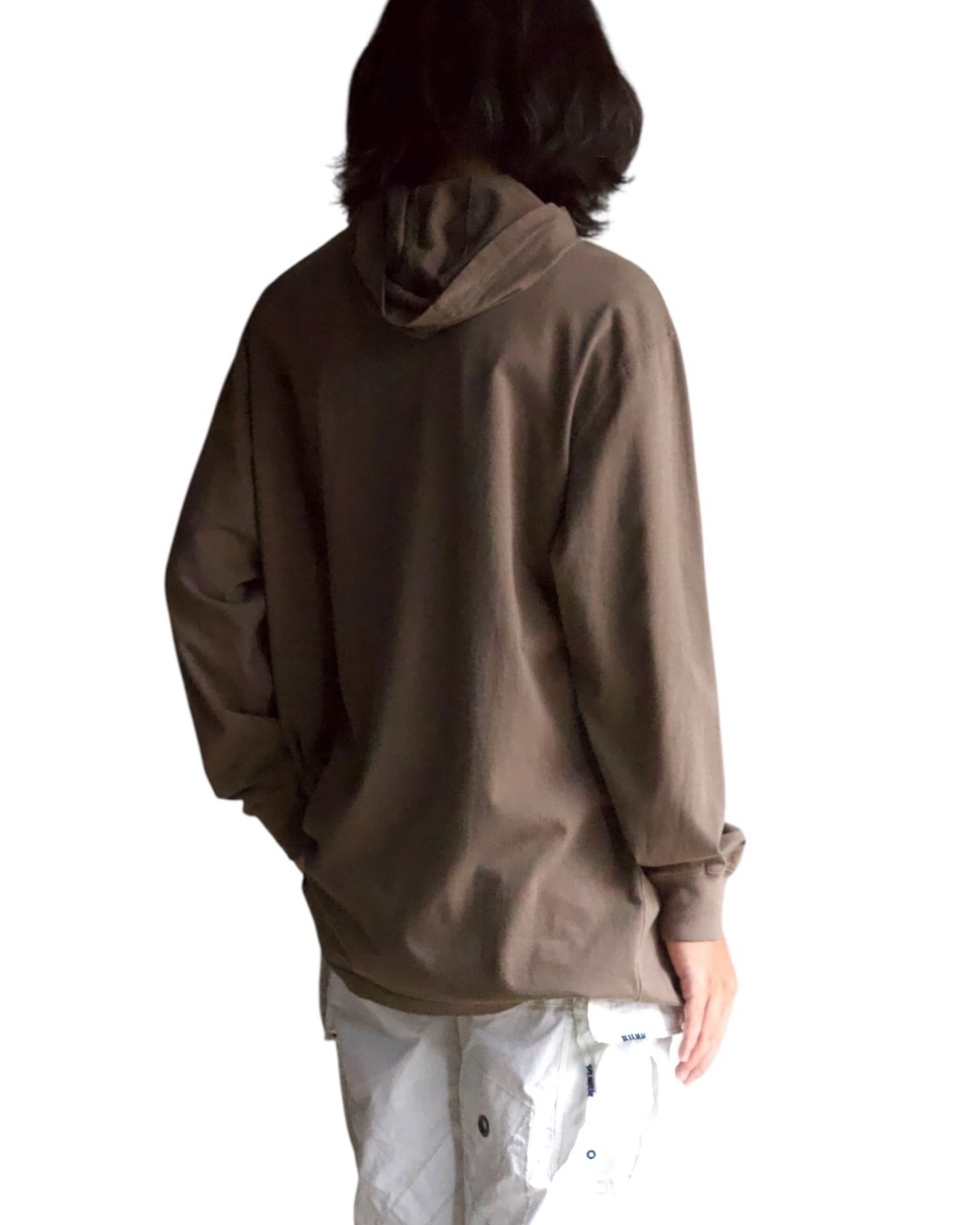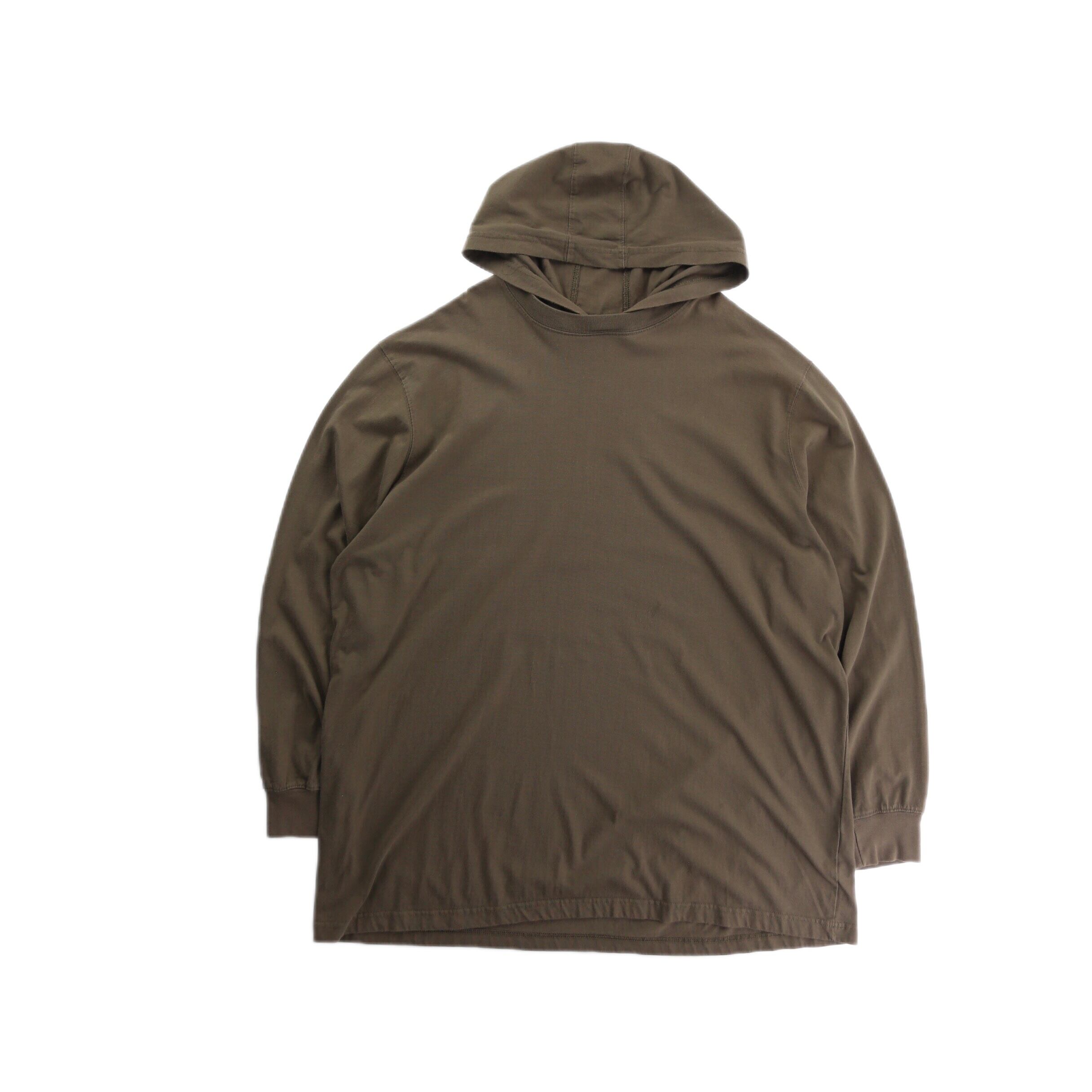パーカーとロンTをレイヤードしたような珍しい形。薄手コットンファブリックでオーバーなサイズ感ながらも,とにかく軽くTシャツ感覚で着用が可能。