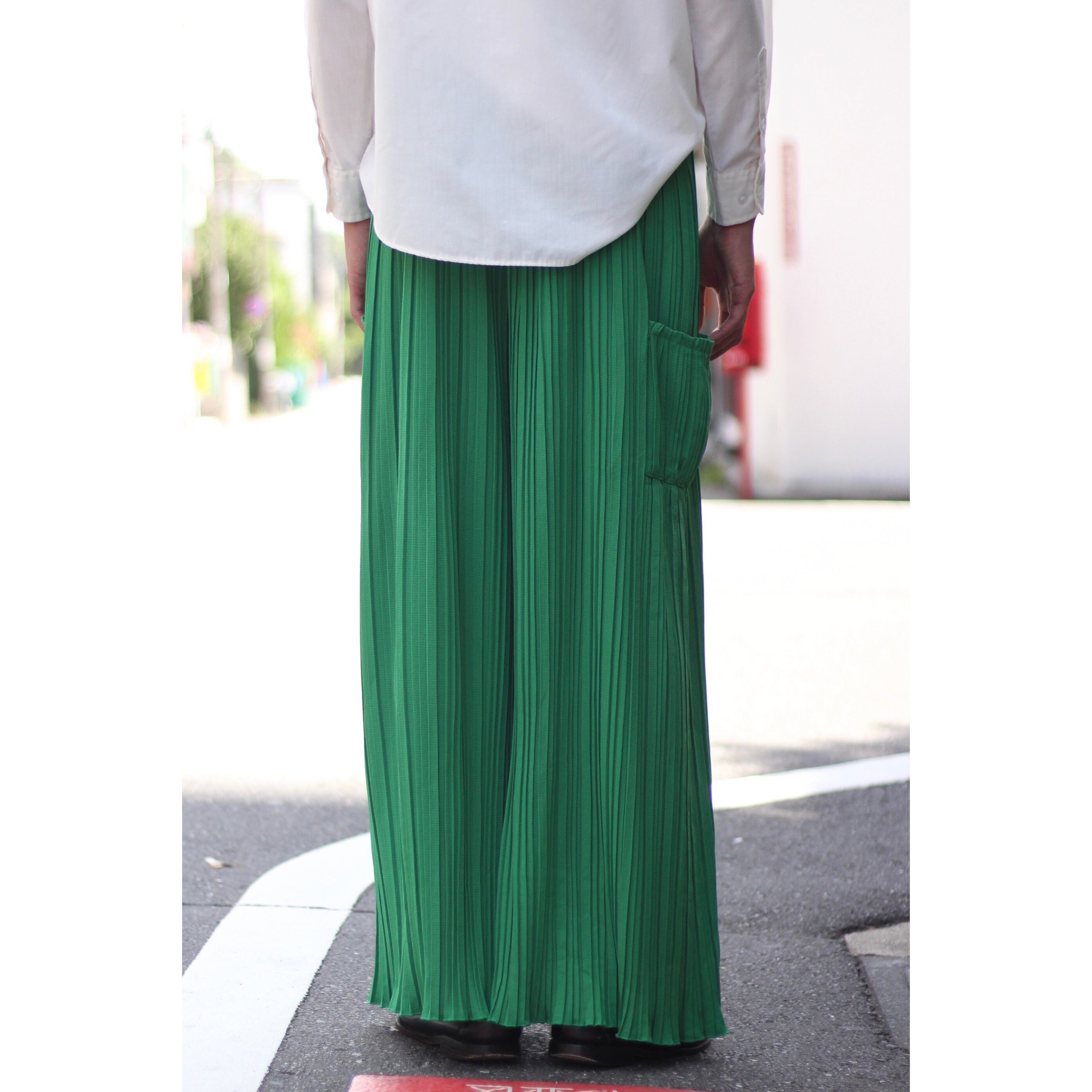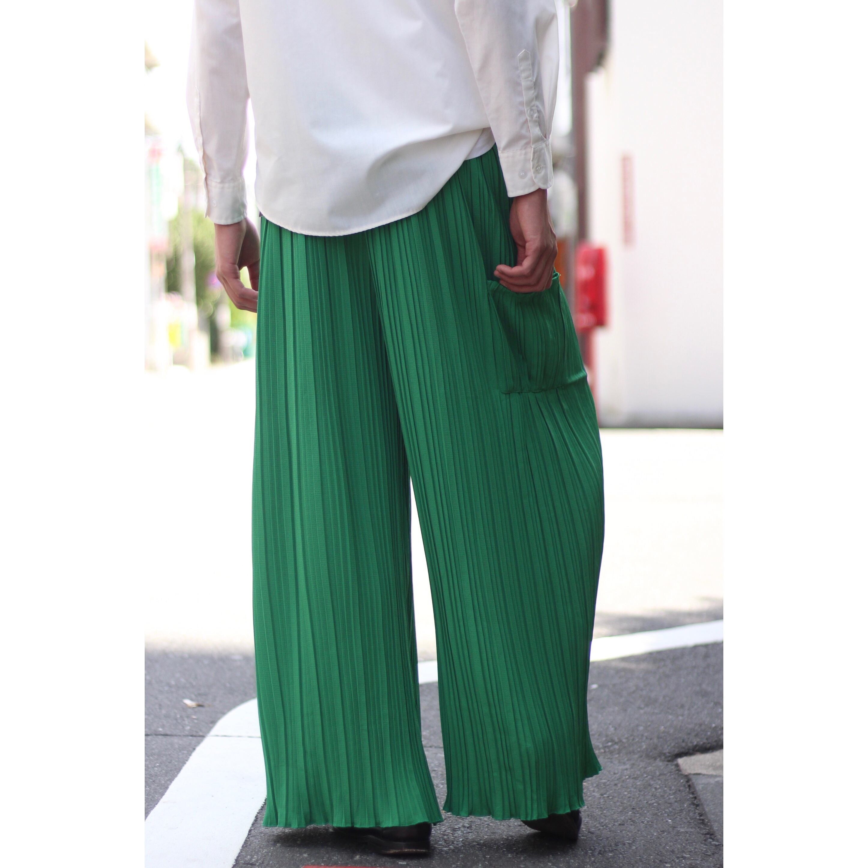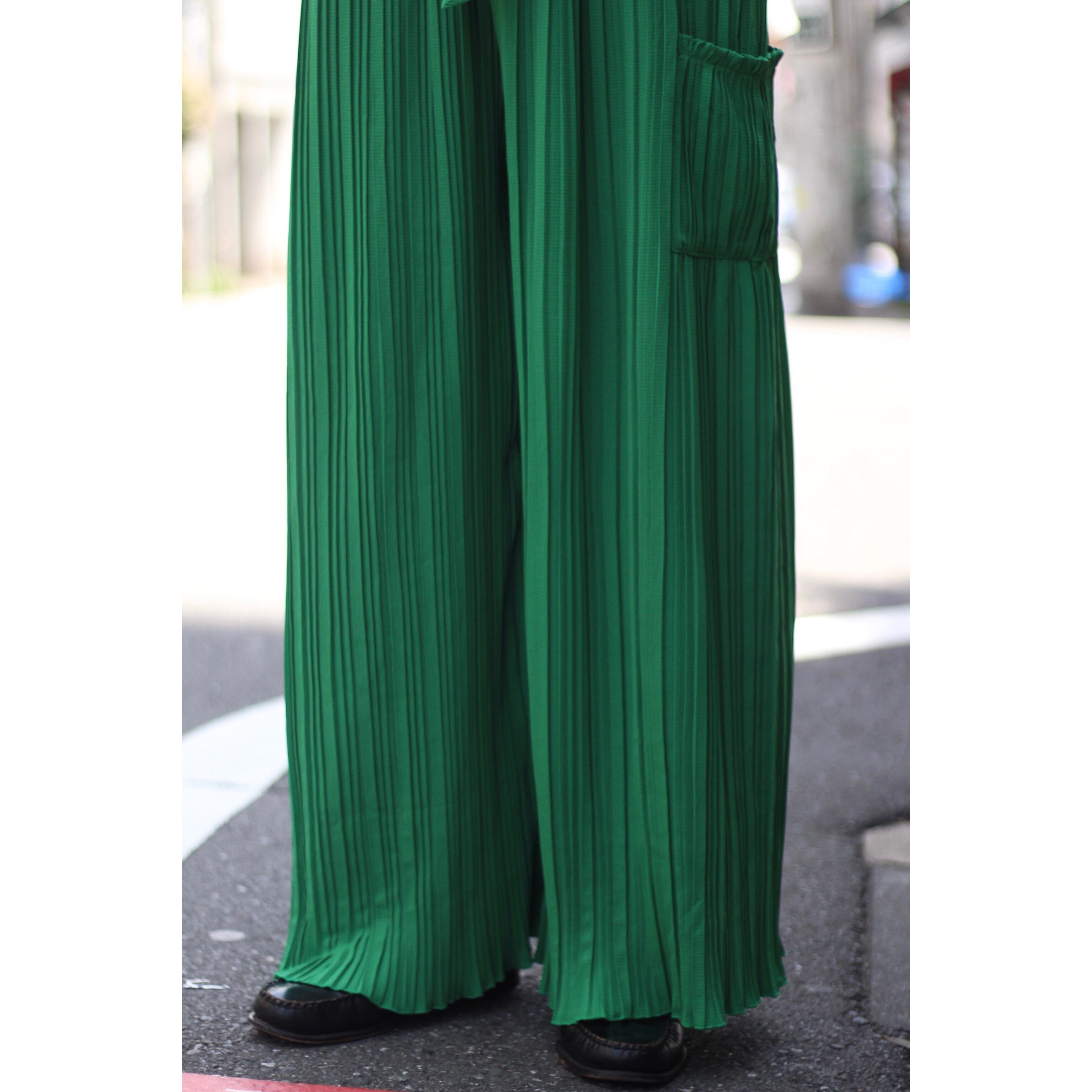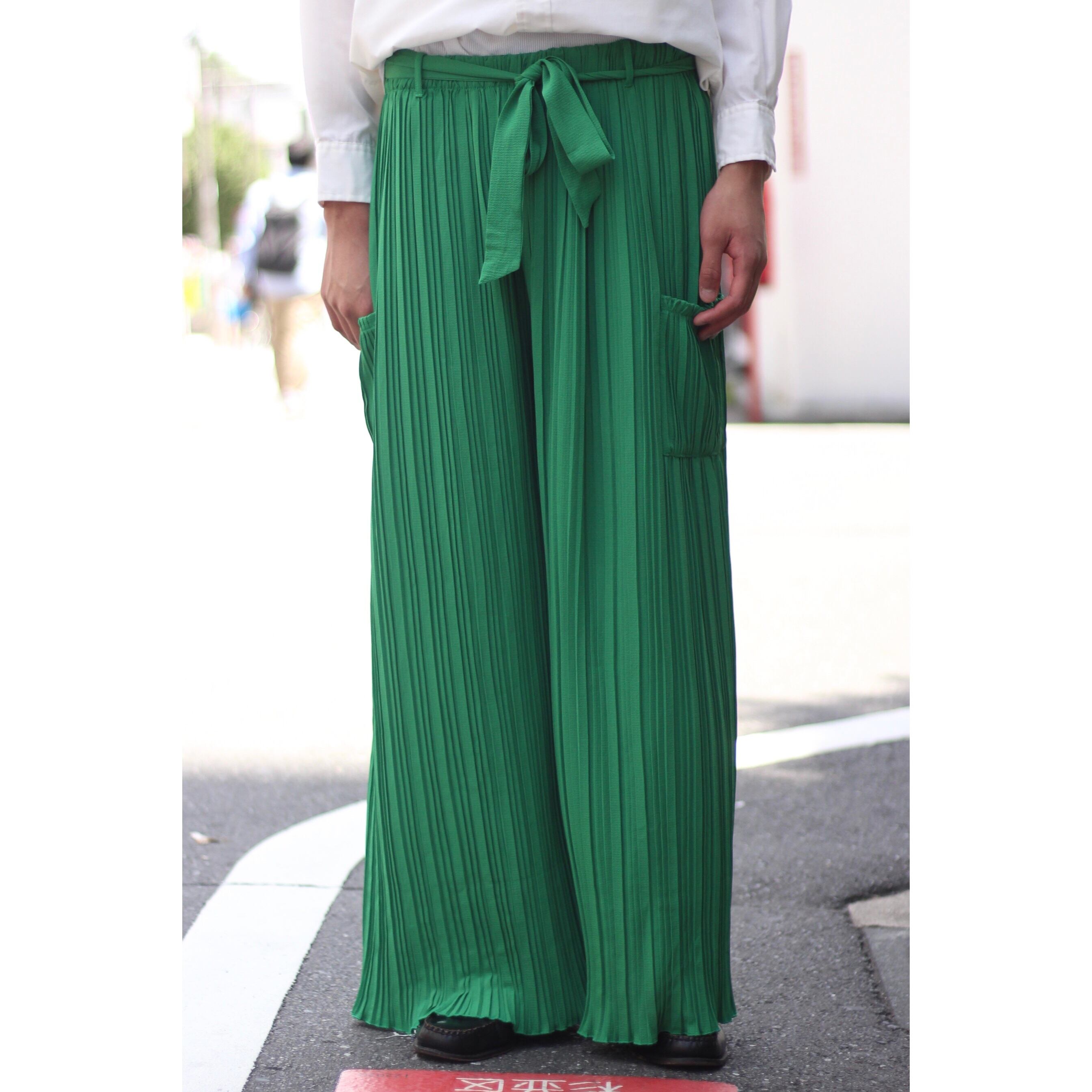 某ブランドのようなビビットなグリーンカラーにランダムな太さのプリーツが◎ 太もも付近にはポケットも付属し,もはや古着とは思えないクオリティの高い逸品。