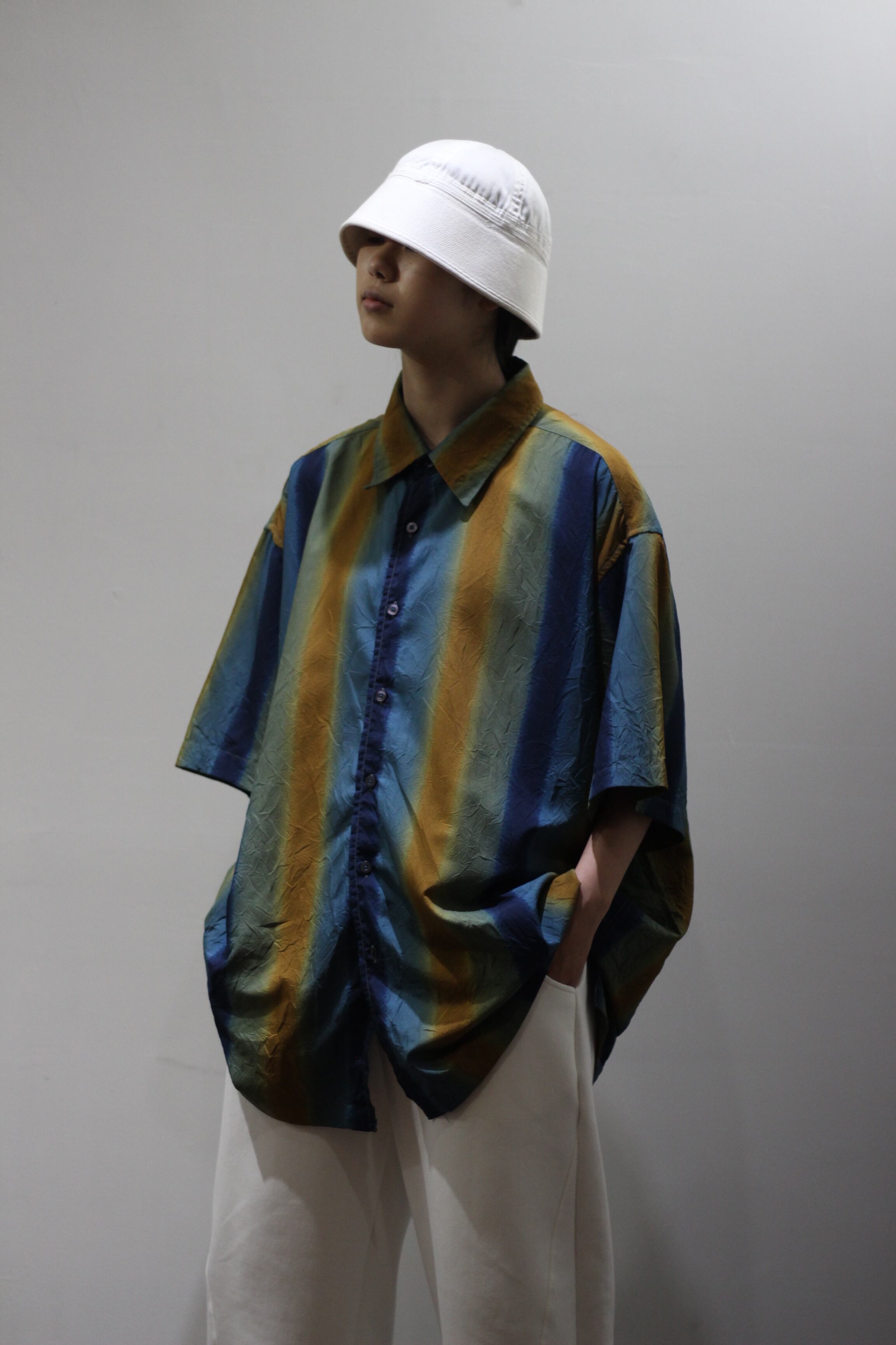 オンブレチェックよりも見ないオンブレライクなストライプ。軽やかで滑らかなポリエステル素材に特有の光沢感も色気の漂うシャツ。