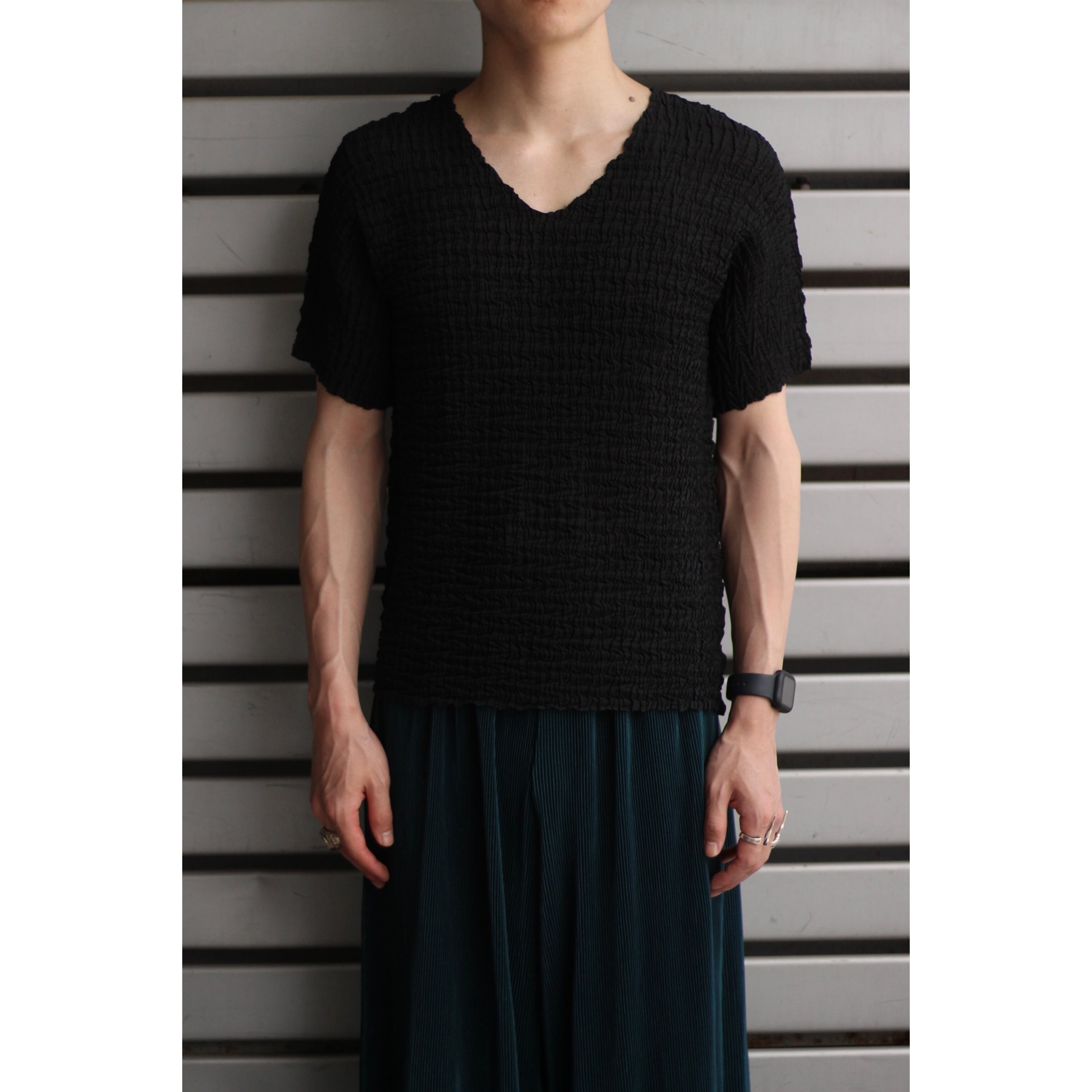 表面は、皺のような、プリーツ、ポップコーンなどと似たような感じになってて、ブラックの無地Tとは一味違うかっこいい雰囲気になってます。そして、ブラック一色なので、インナーとしても使えますし、一枚で、ショーツにサンダルとかでも素晴らしいですね◎