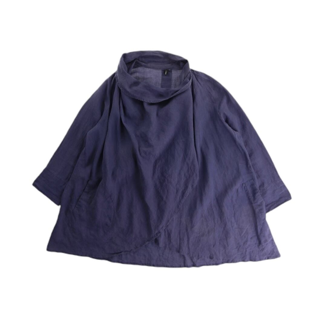 結構独特な面白い形で、前側の裾が斜めカットのようになっていて、片方は内側のポケットの裏に付いてるボタンで閉めて、もう片方は、左肩のボタンでつけるデザインになっていて、着ると首元に布の溜まりができたり、ポンチョのような、どこか、フォークロアな雰囲気のアイテムになっています。