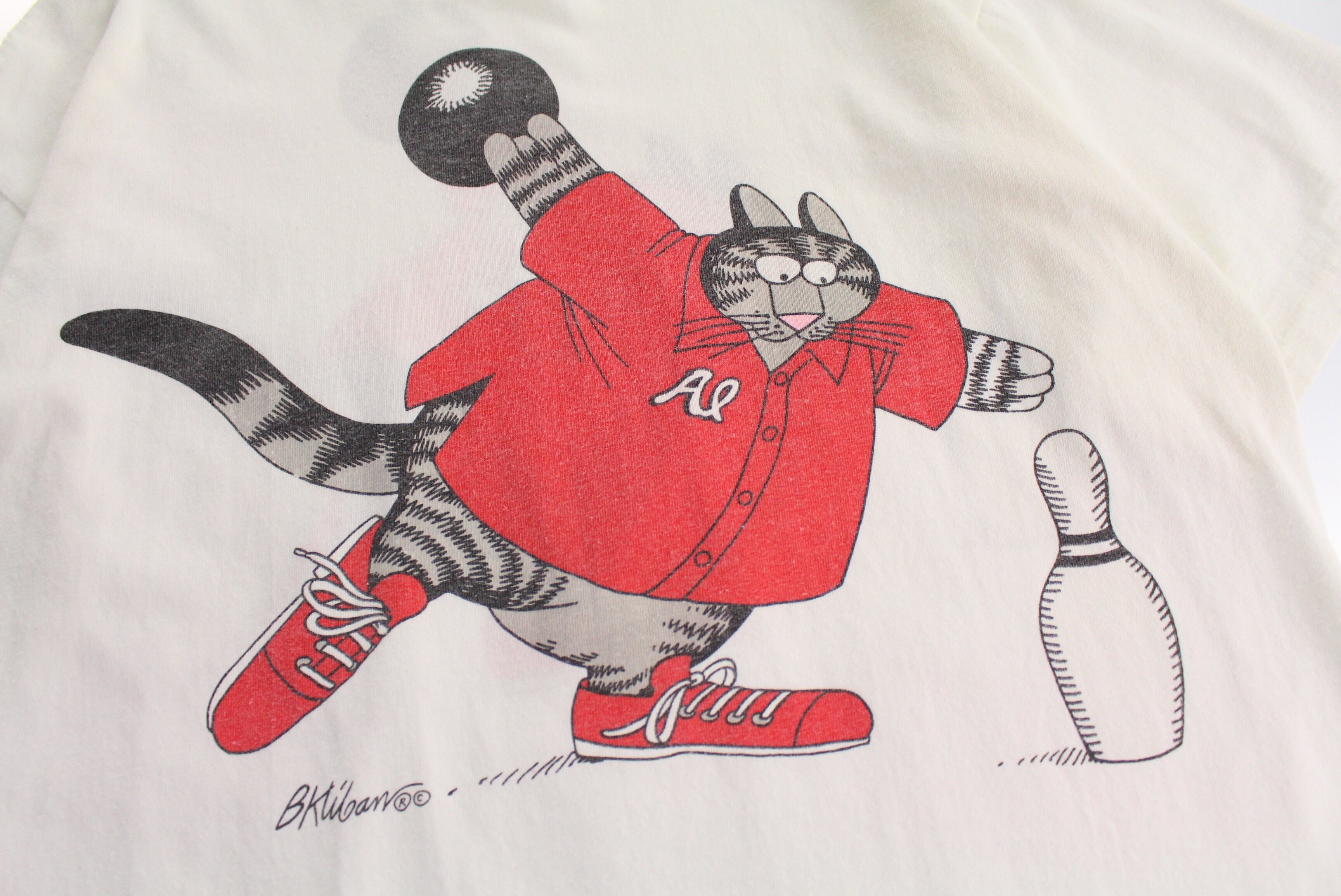 程よく肉厚なコットン100%の生地に両面プリント。クリバンキャットがボーリングしてる姿が大きくプリントされた1着。