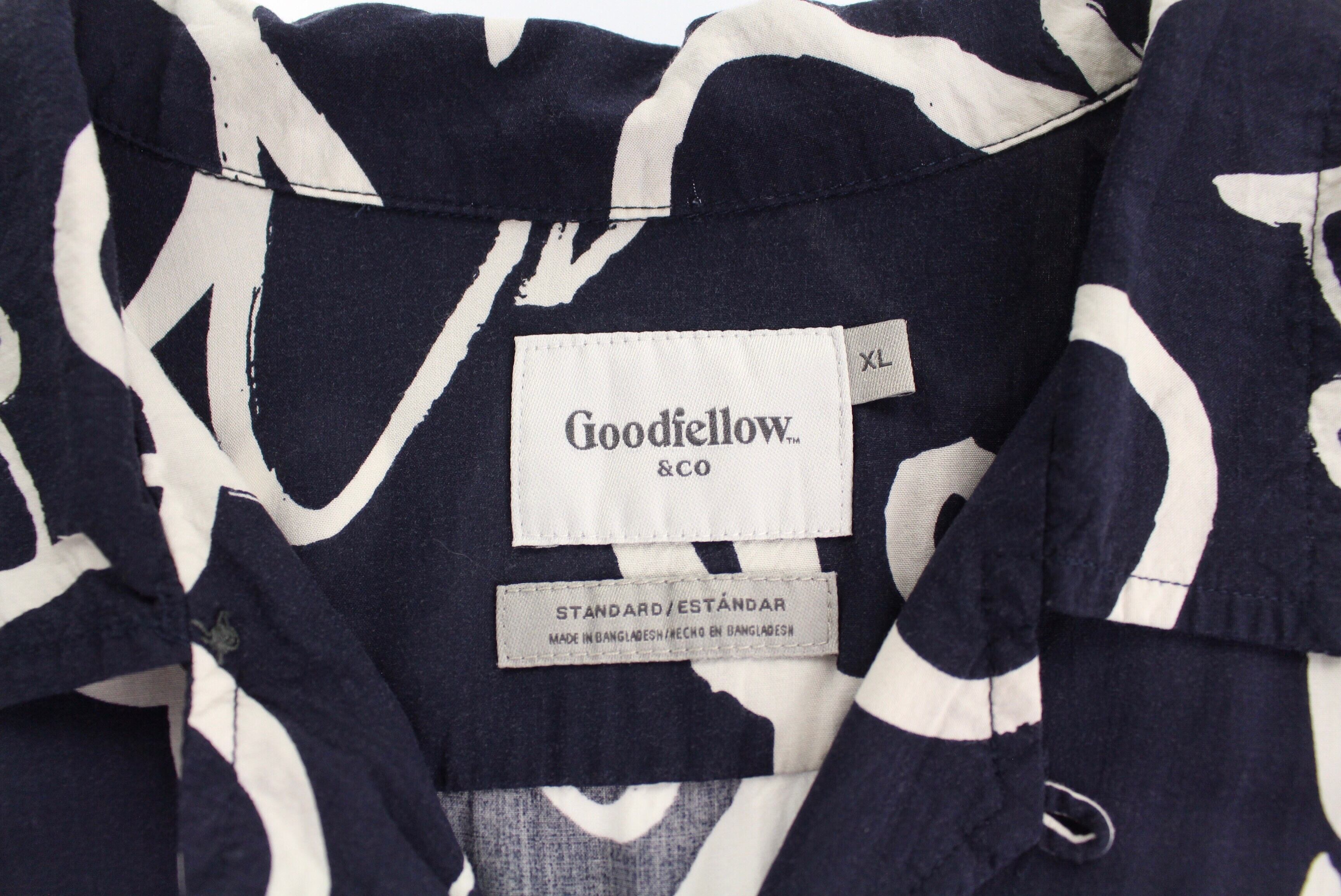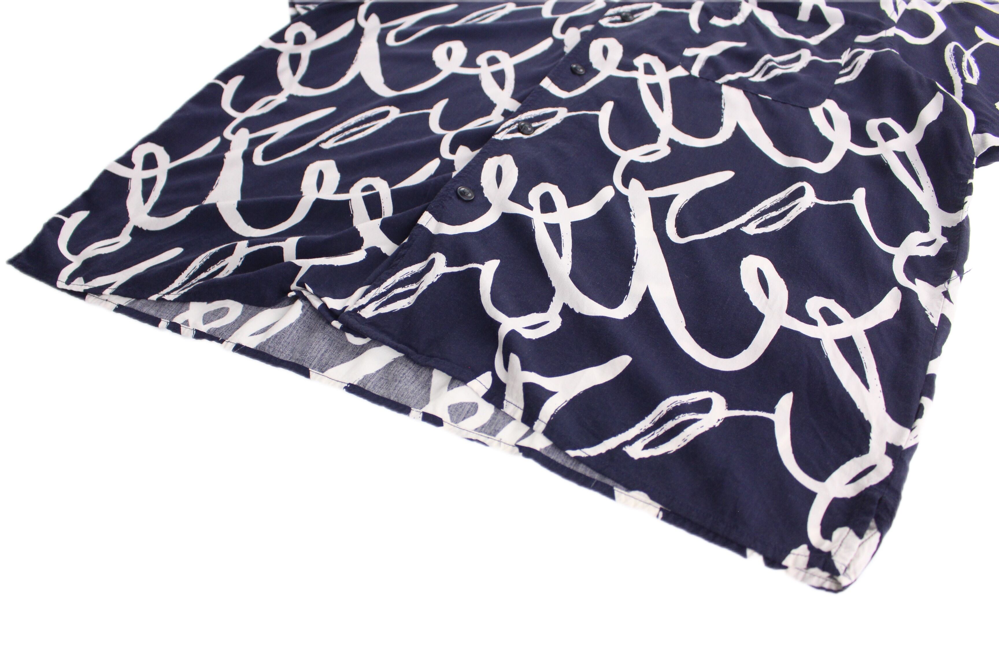 フロントは夏らしい爽やかなオープンカラー仕様にサイズ表記はXL。ルーズなサイズながらもボックスシルエットで形良く,ファブリックとデザインが絶妙にマッチした古着ならではなシャツ。
