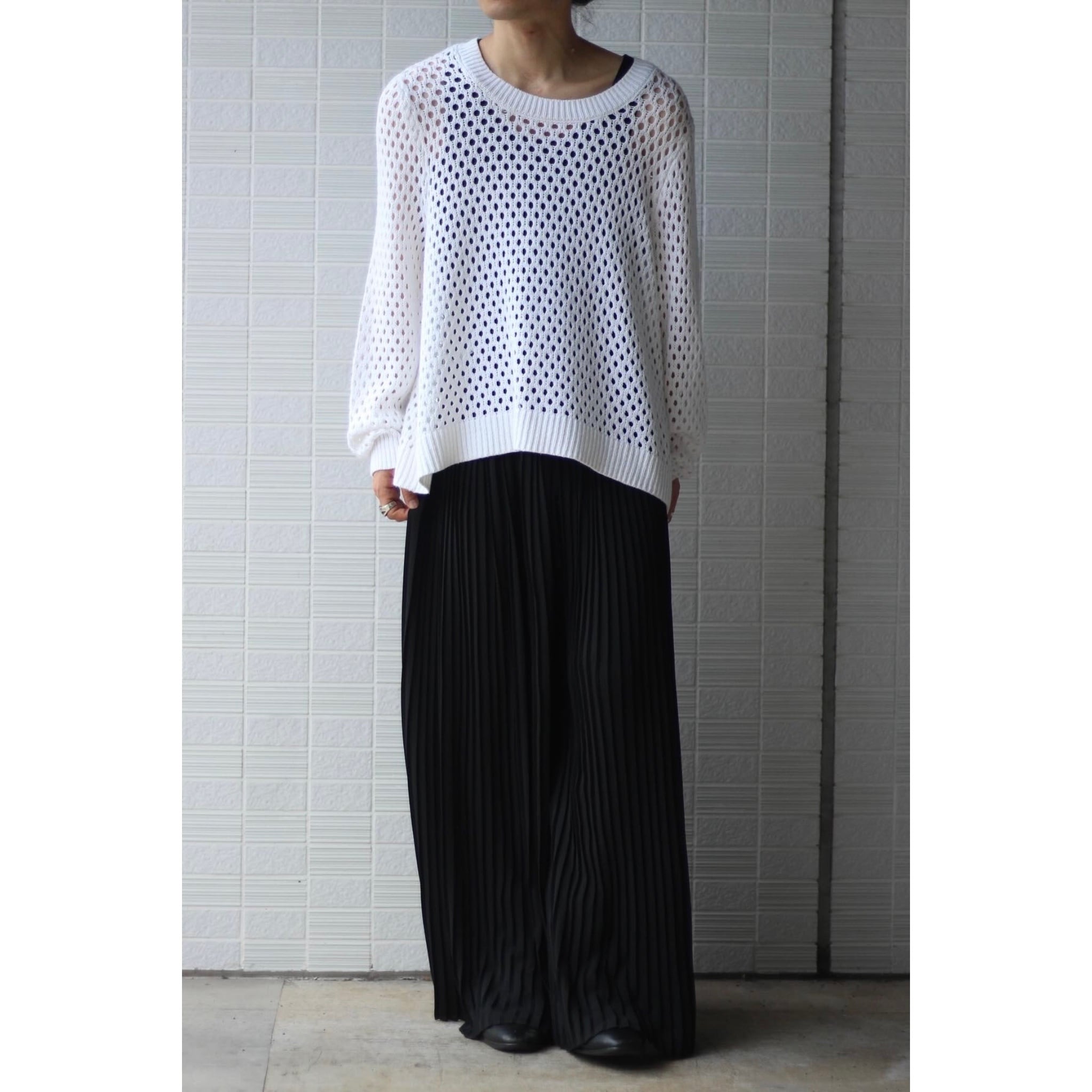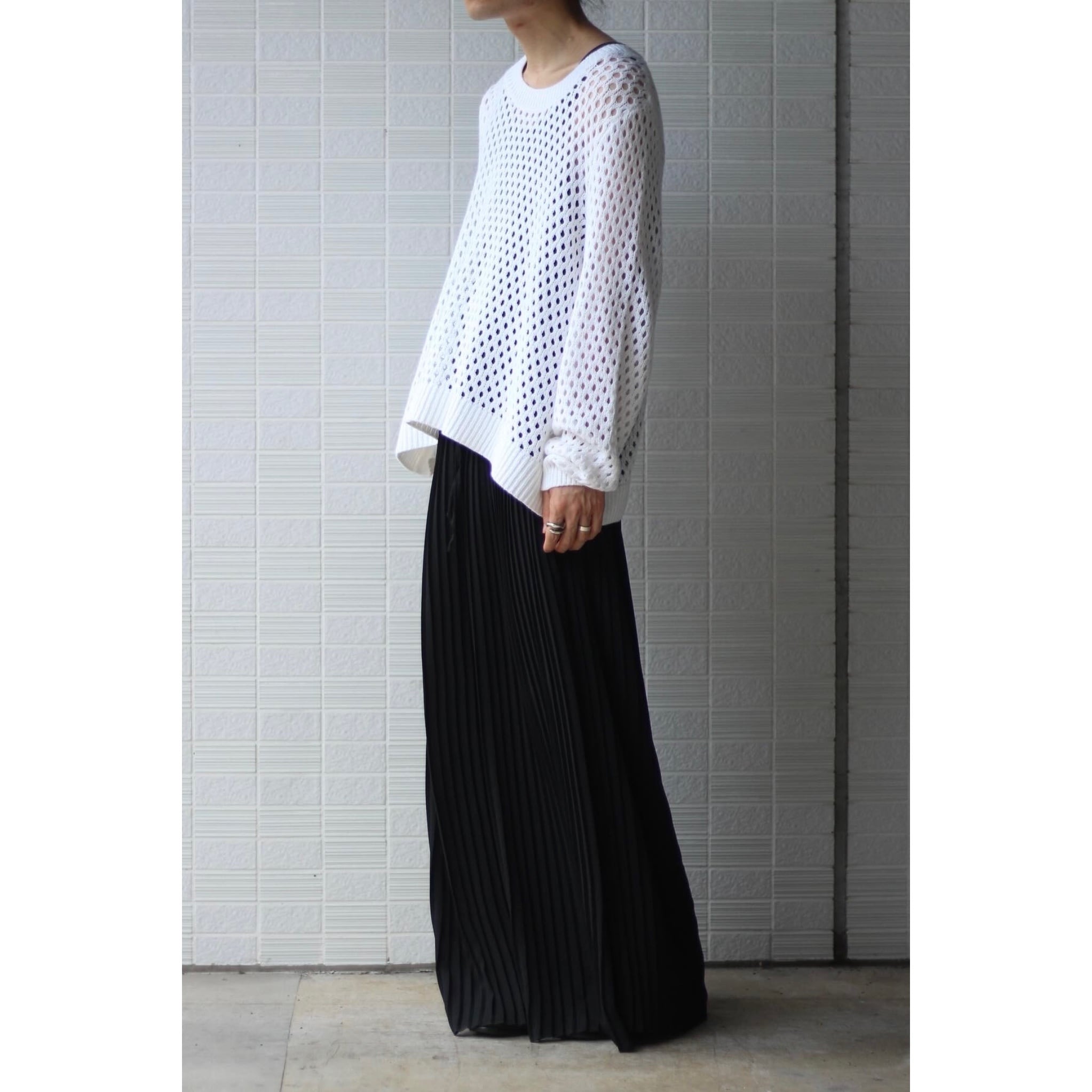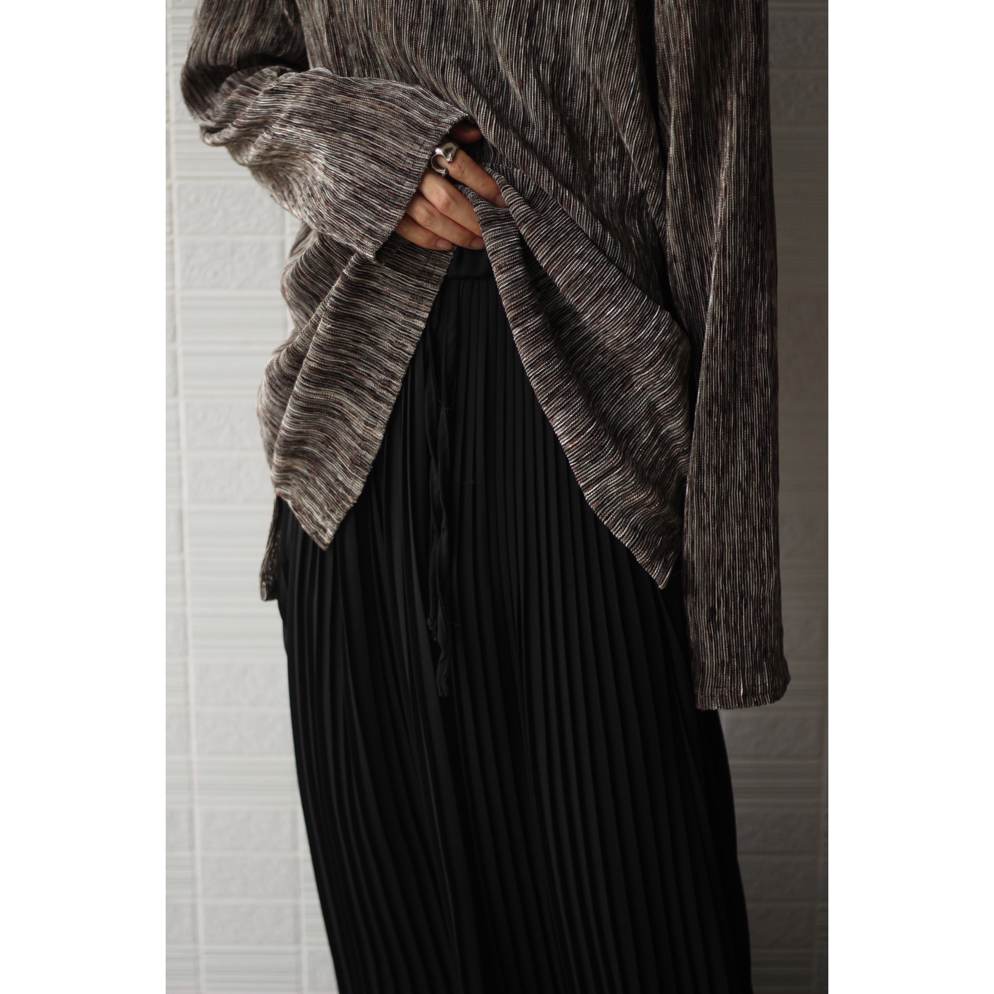 ポリ素材で涼しくイージー仕様。暑さの激しい夏に楽に履けるパンツは重宝します。特にこちらはシルエットに雰囲気が出る個体でスカートを履いているかのようなモードな印象が最高。