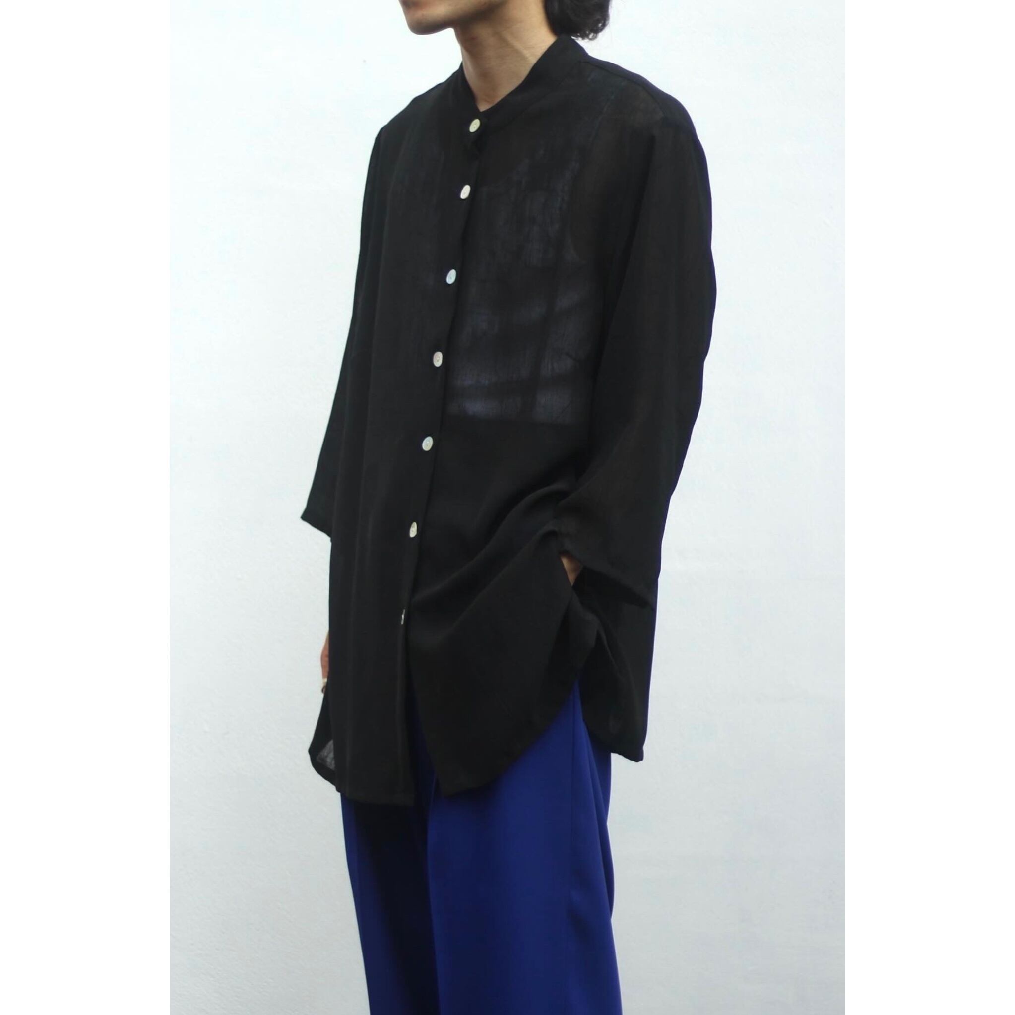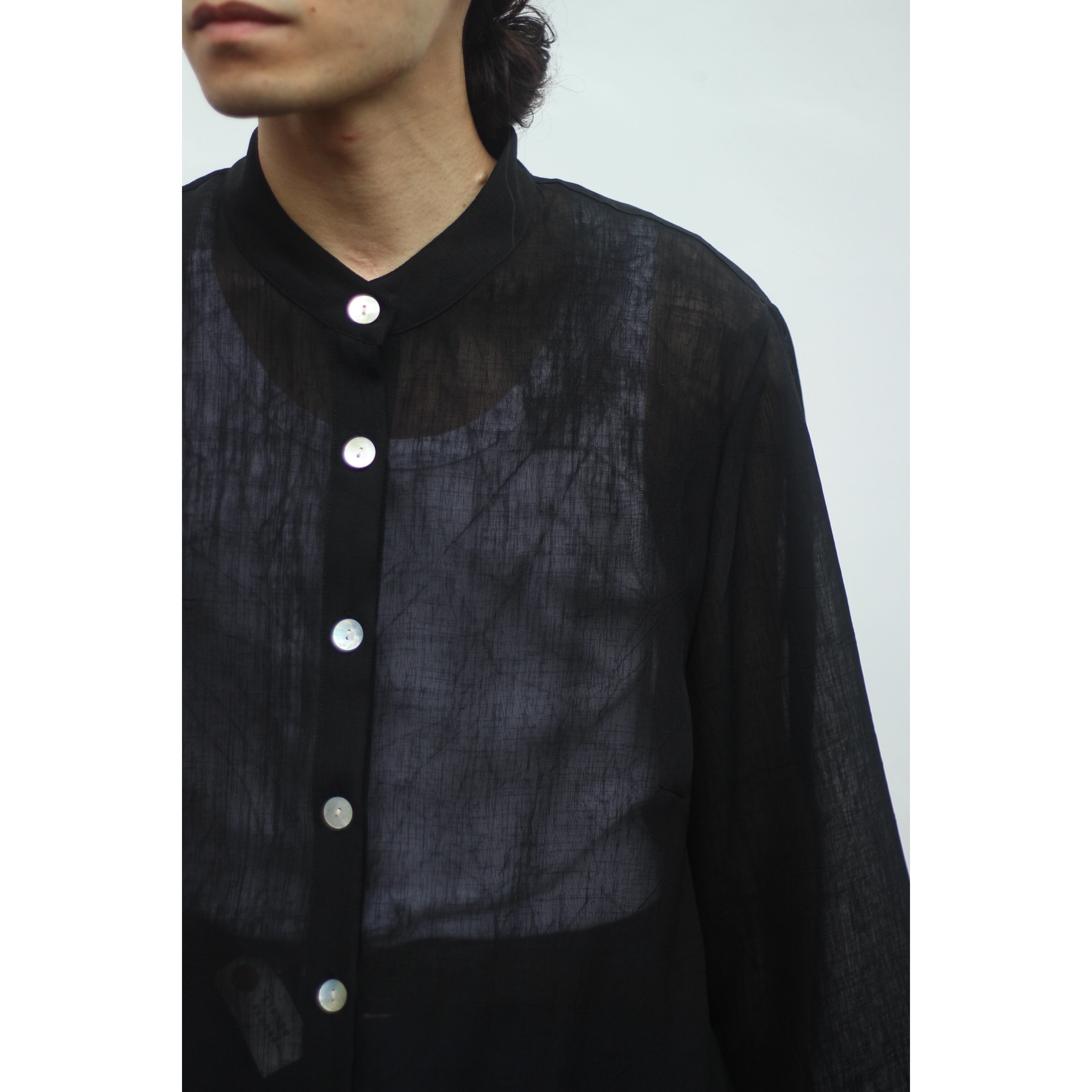 細い線のようなシワが全体に散りばめられ、アートさもあり、シェルボタンの優しい雰囲気とノーカラーのすっきりとしたデザインが相まってドレッシーな雰囲気を醸しだすシアーシャツ。