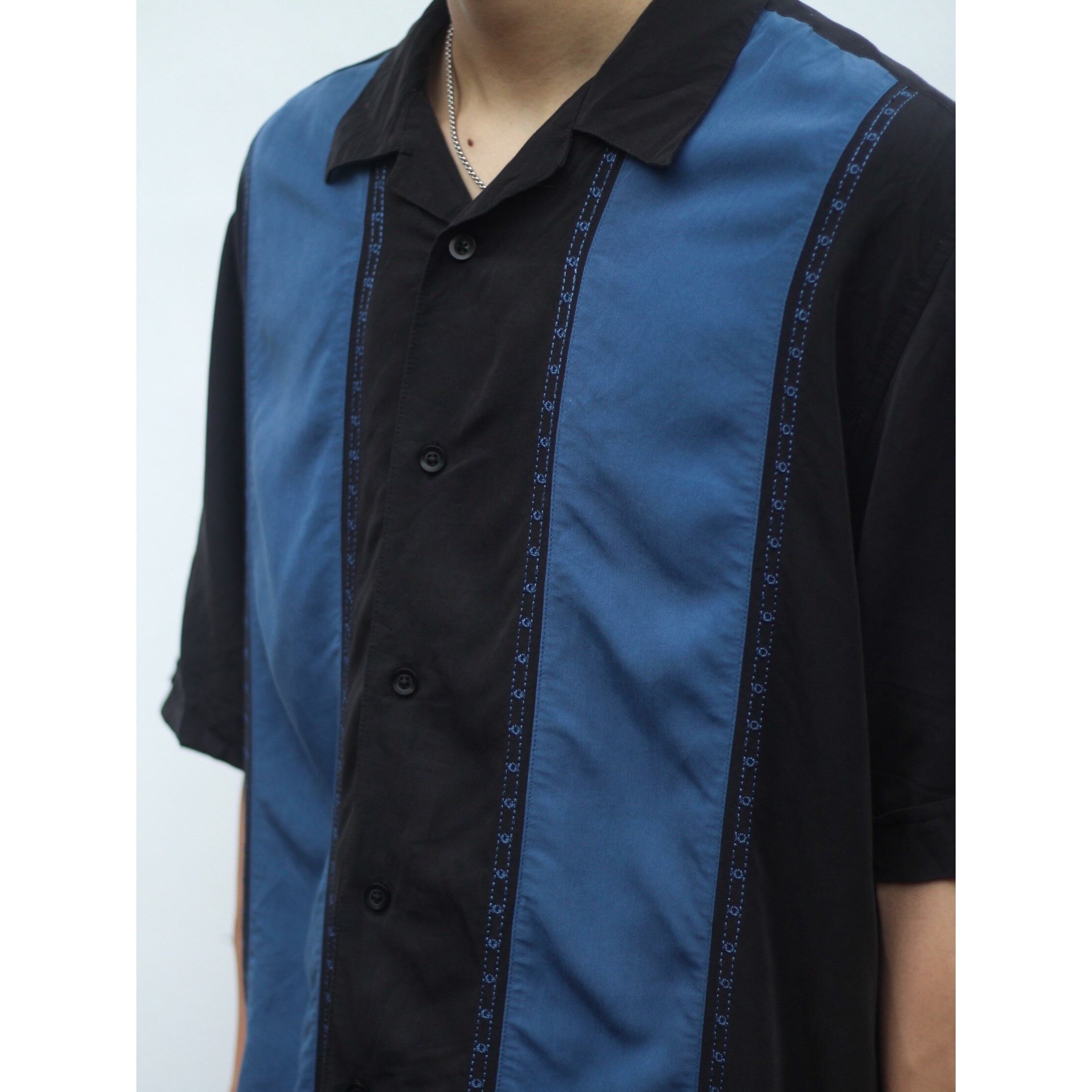 ブラック×スモークブルーの2トーン、半袖オープンカラーシャツです。