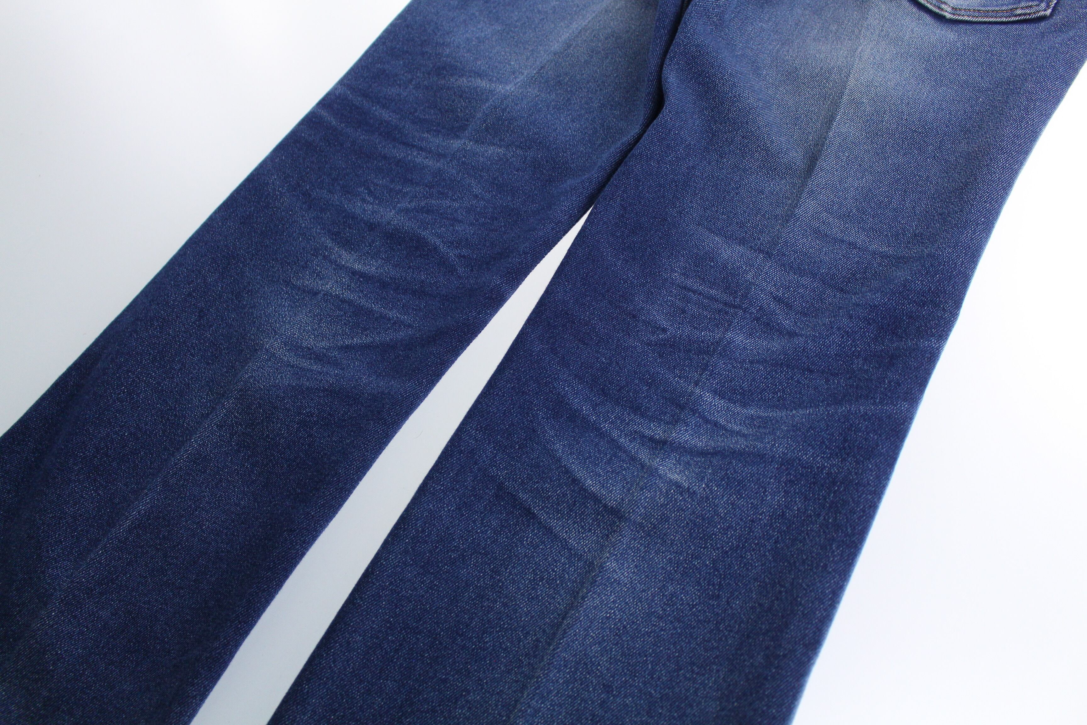 色濃く残るブルーに濃淡がハッキリ出た色落ち、フロントにセンタープレス入りで履いた時の見た目も綺麗なフレアシルエットです。