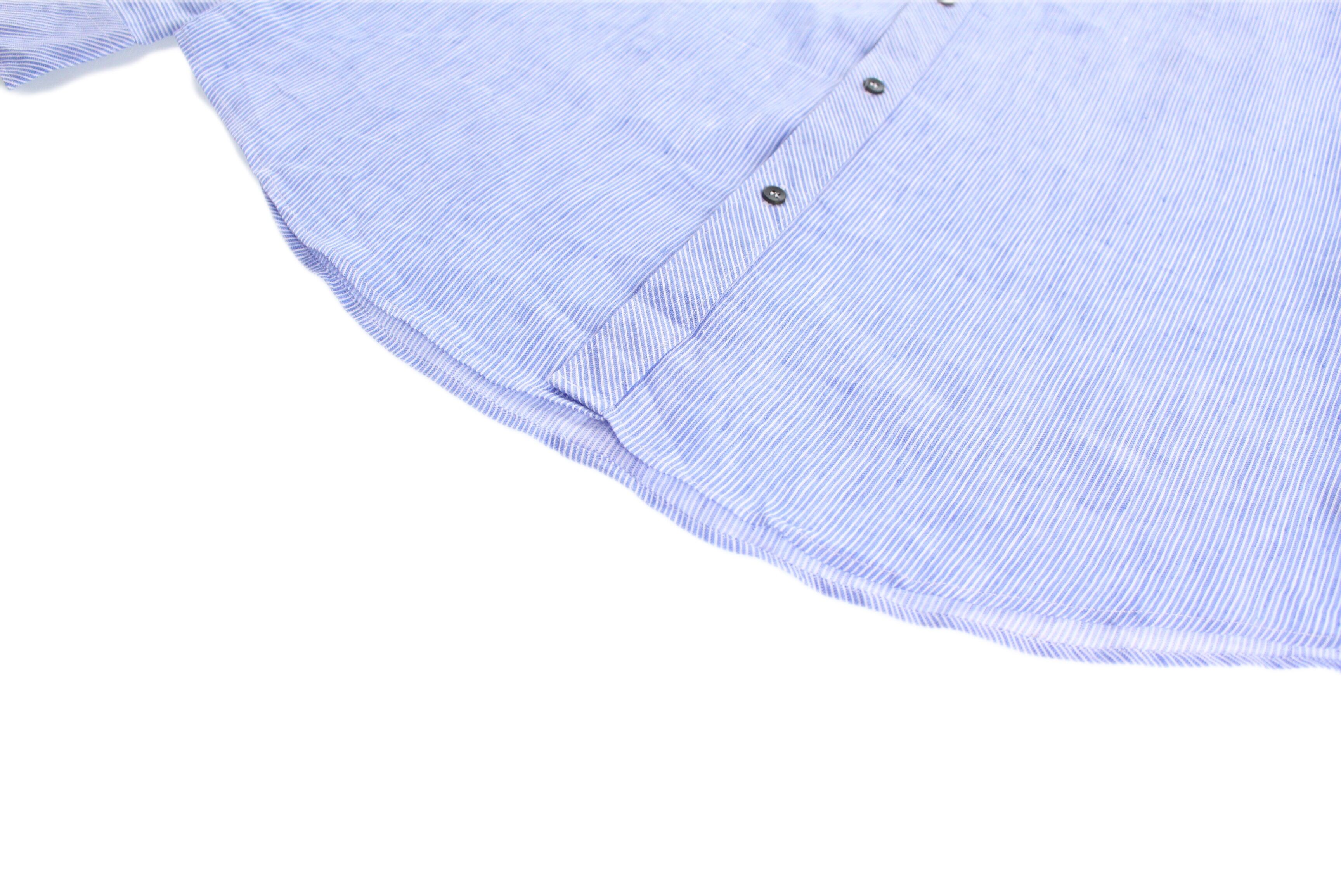 ブルーボディに細めに取られたホワイトのストライプ。脇の下から裾にかけてシェイプされたデザインで着用すると大人な色気のある良いシャツです☺︎
