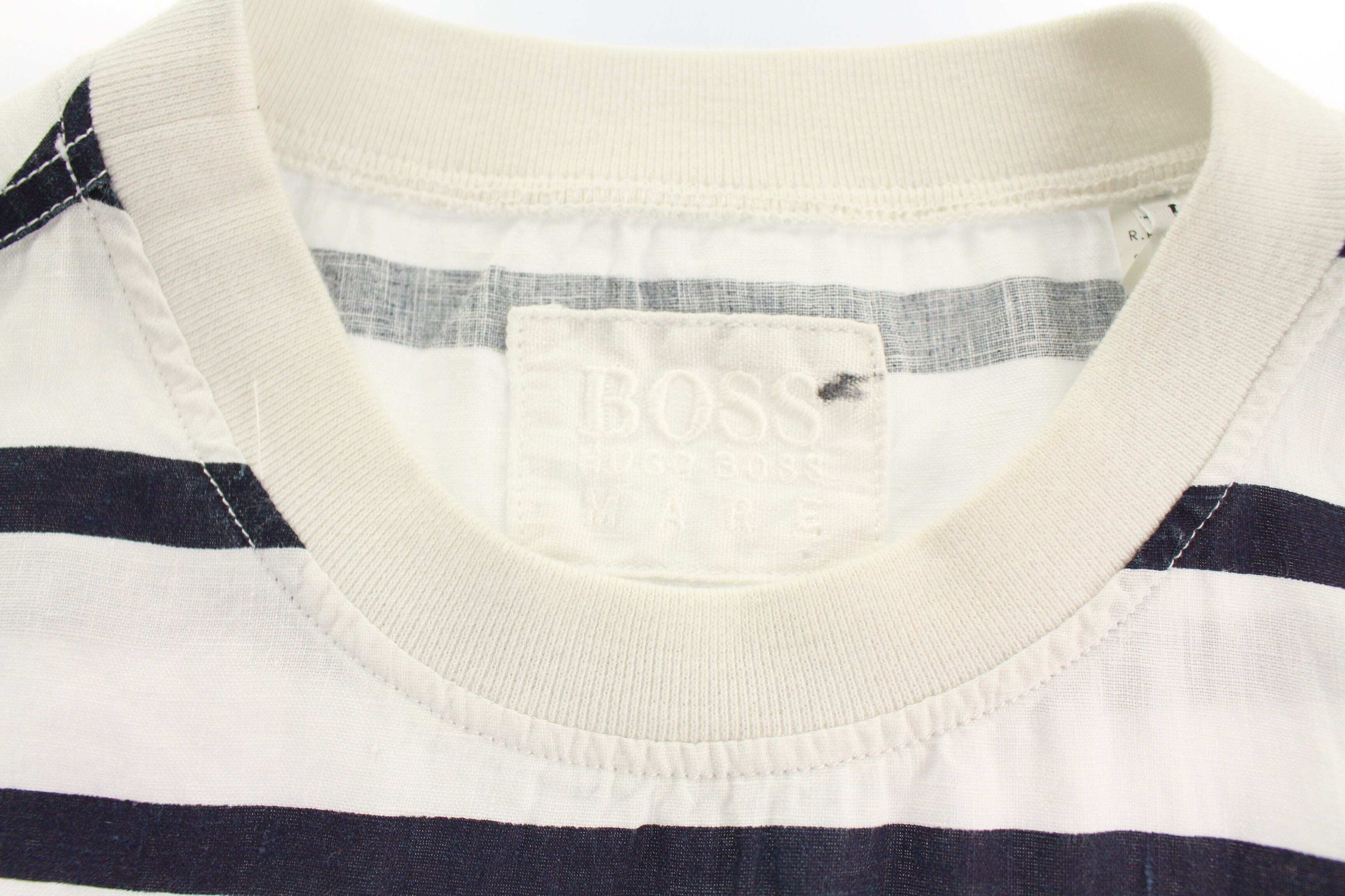素材は最高品質なフラックスリネン100%にダークネイビーでのボーダー柄。青が強く無いので子供っぽさ、マリン感が出ないのも、流石ヒューゴボスな大人ボーダー。