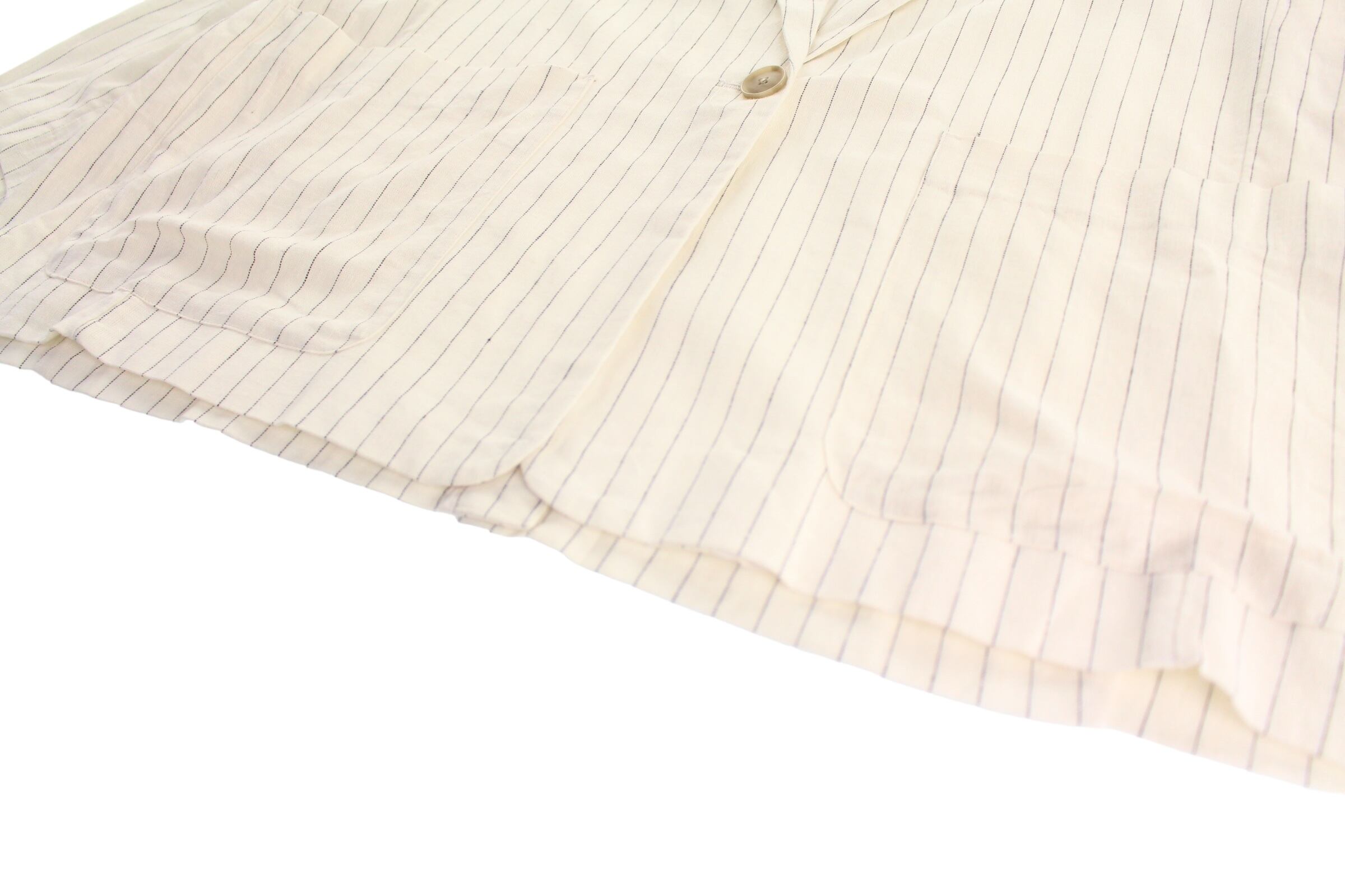 カラーリングはオフホワイトにピンストライプの都会的な印象。夏時期の軽い羽織としてもおすすめできる逸品。是非。