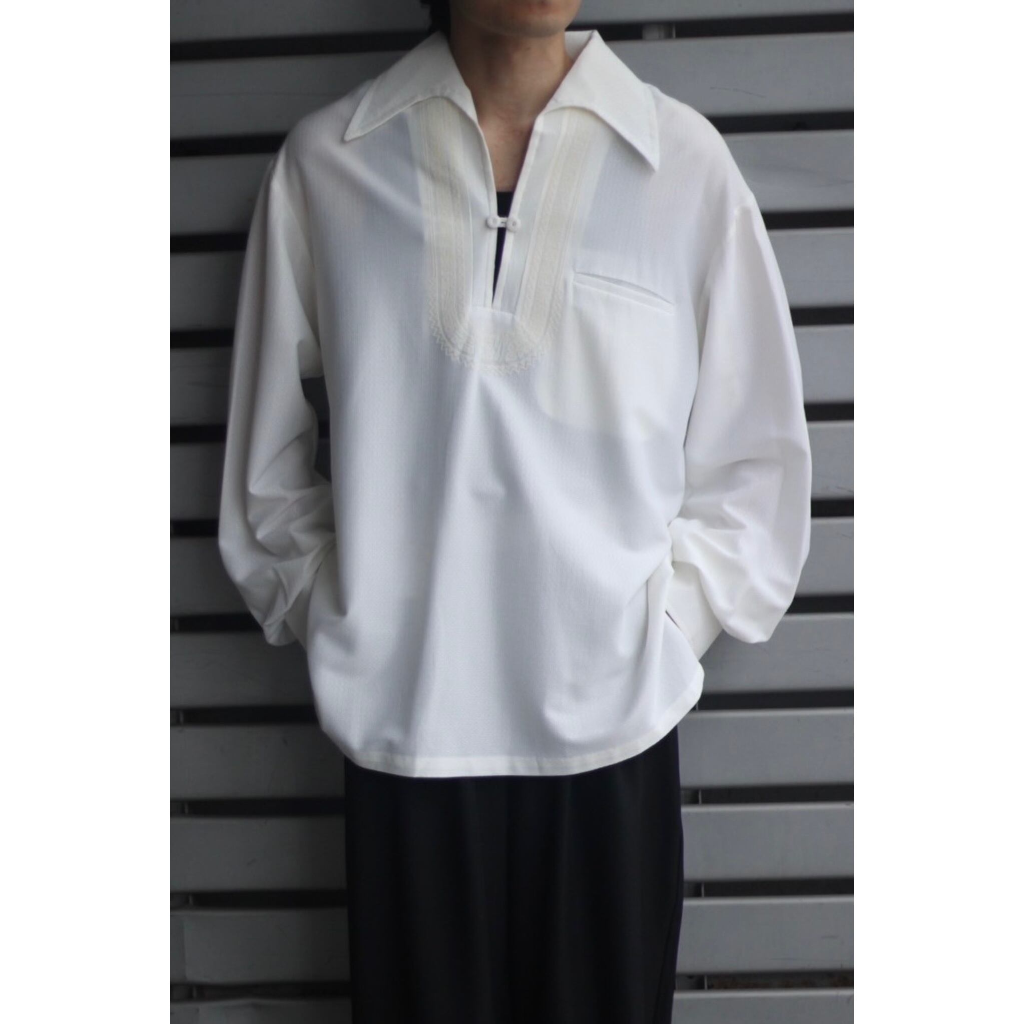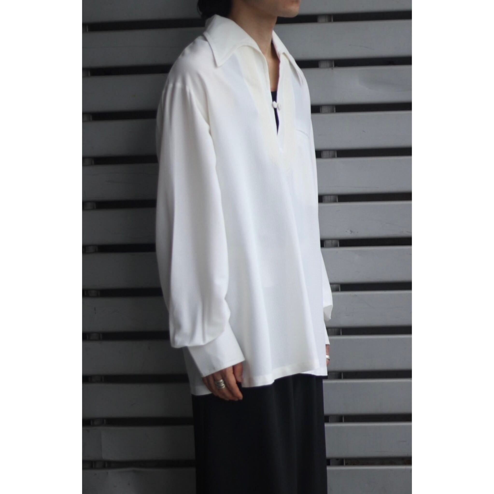 大きな襟が特徴的なスキッパーシャツ。