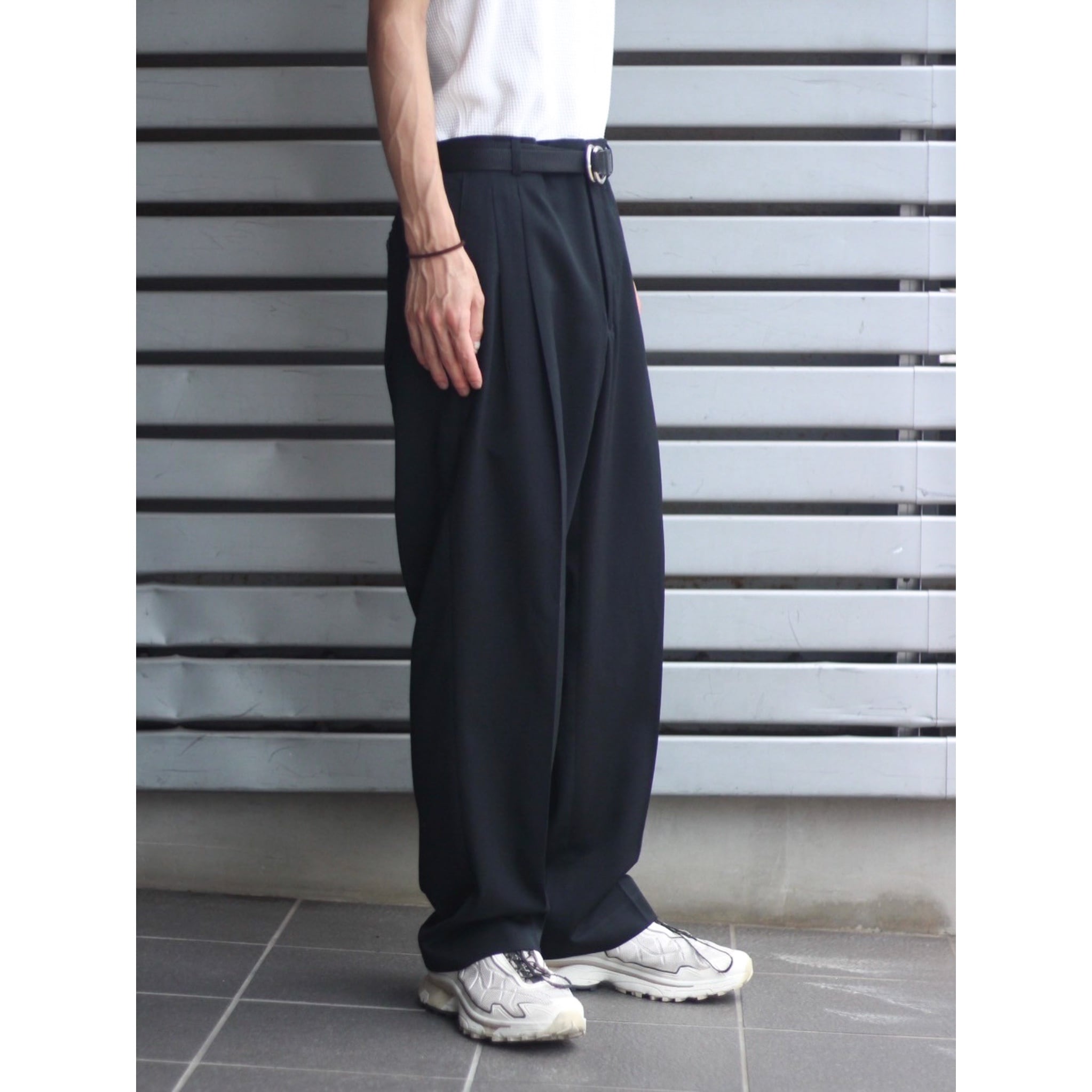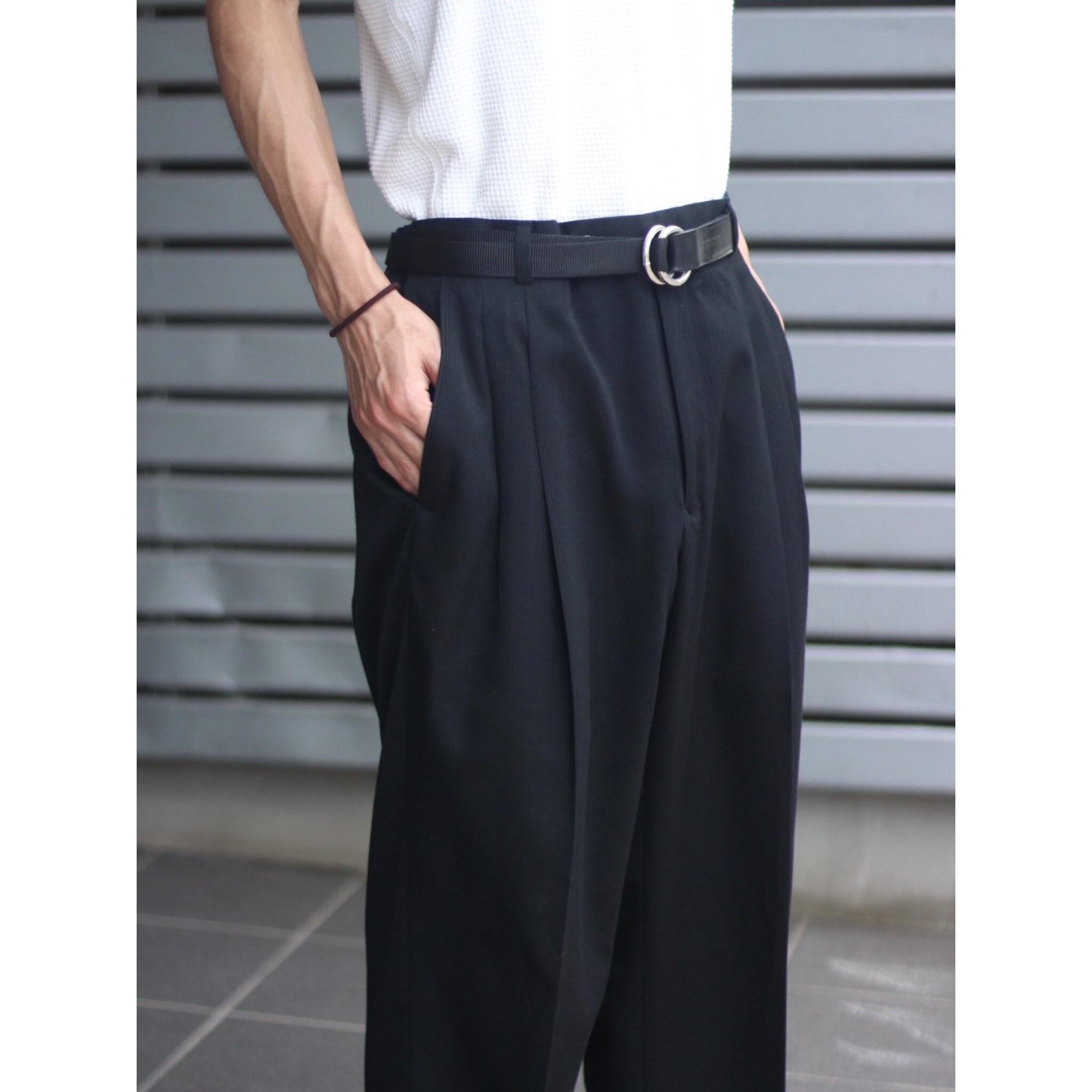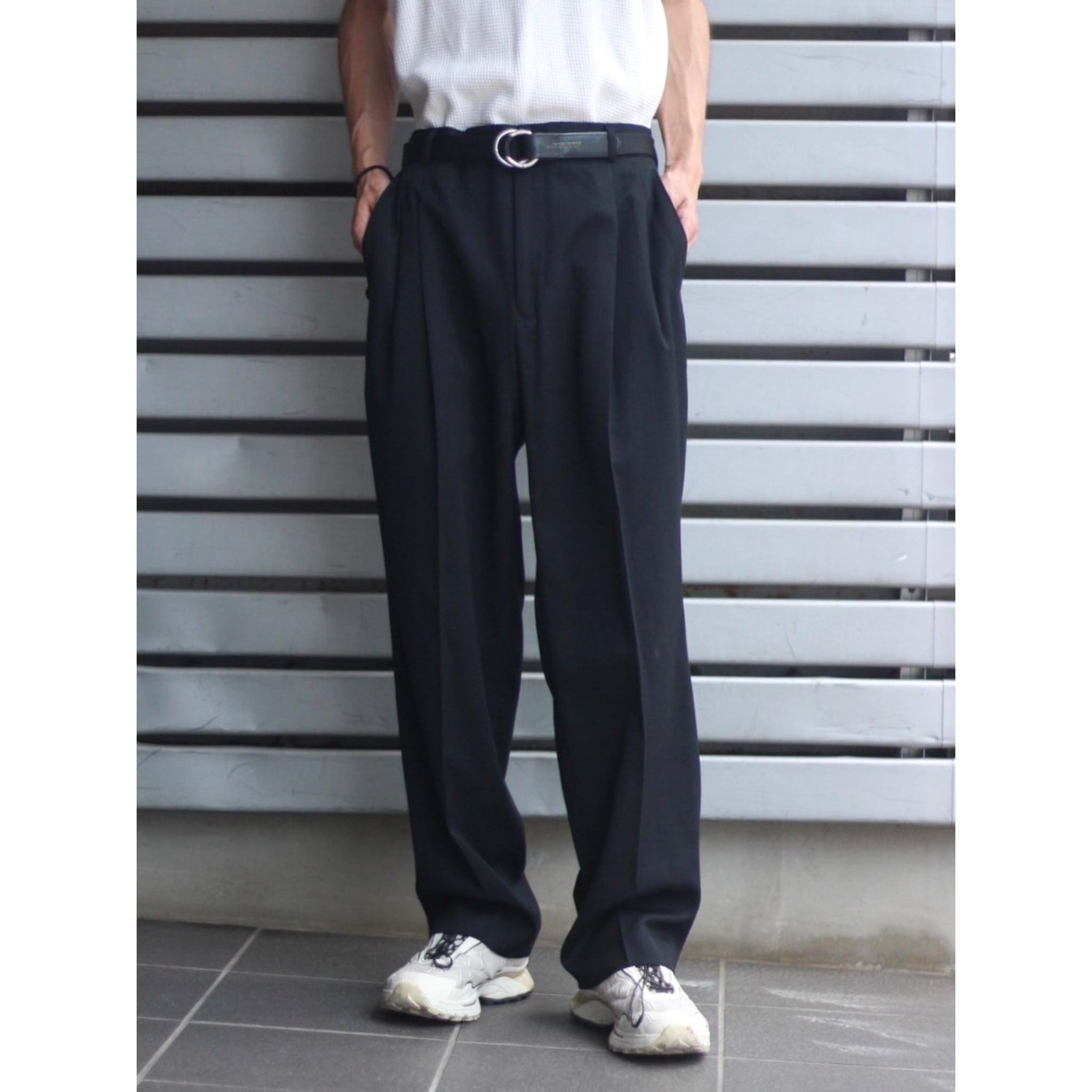 ウエスト2タック仕様に太すぎない綺麗目なセミワイドシルエット。気分固定せず、一本持っておくと重宝する黒スラックスだと思います