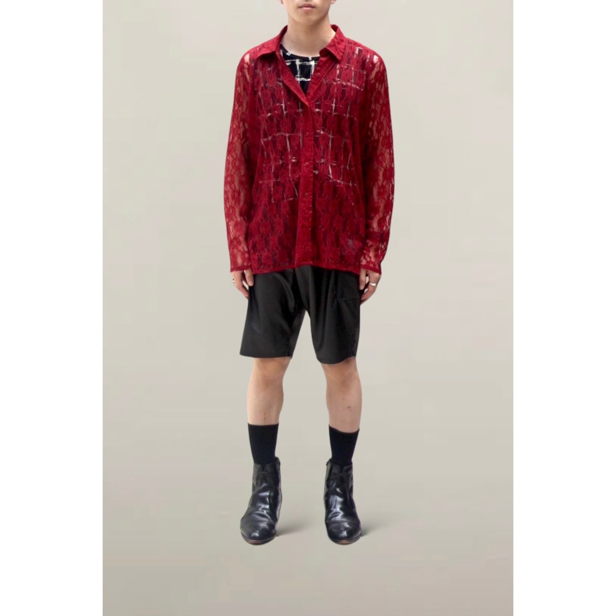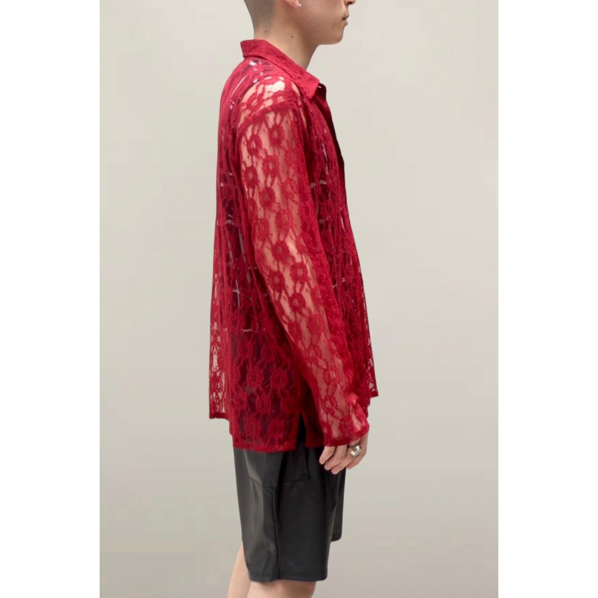 レース部分が花のような柄になっていてそれが赤と相まってより美しく見え、尚且つ、シアーの網目が粗く肌と服がより鮮明に差別化されるので、着た時に肌色と絶妙に中和されて赤だけど情熱的すぎずに、柄もより鮮明に見えてドレッシーに着こなせる一着◎
