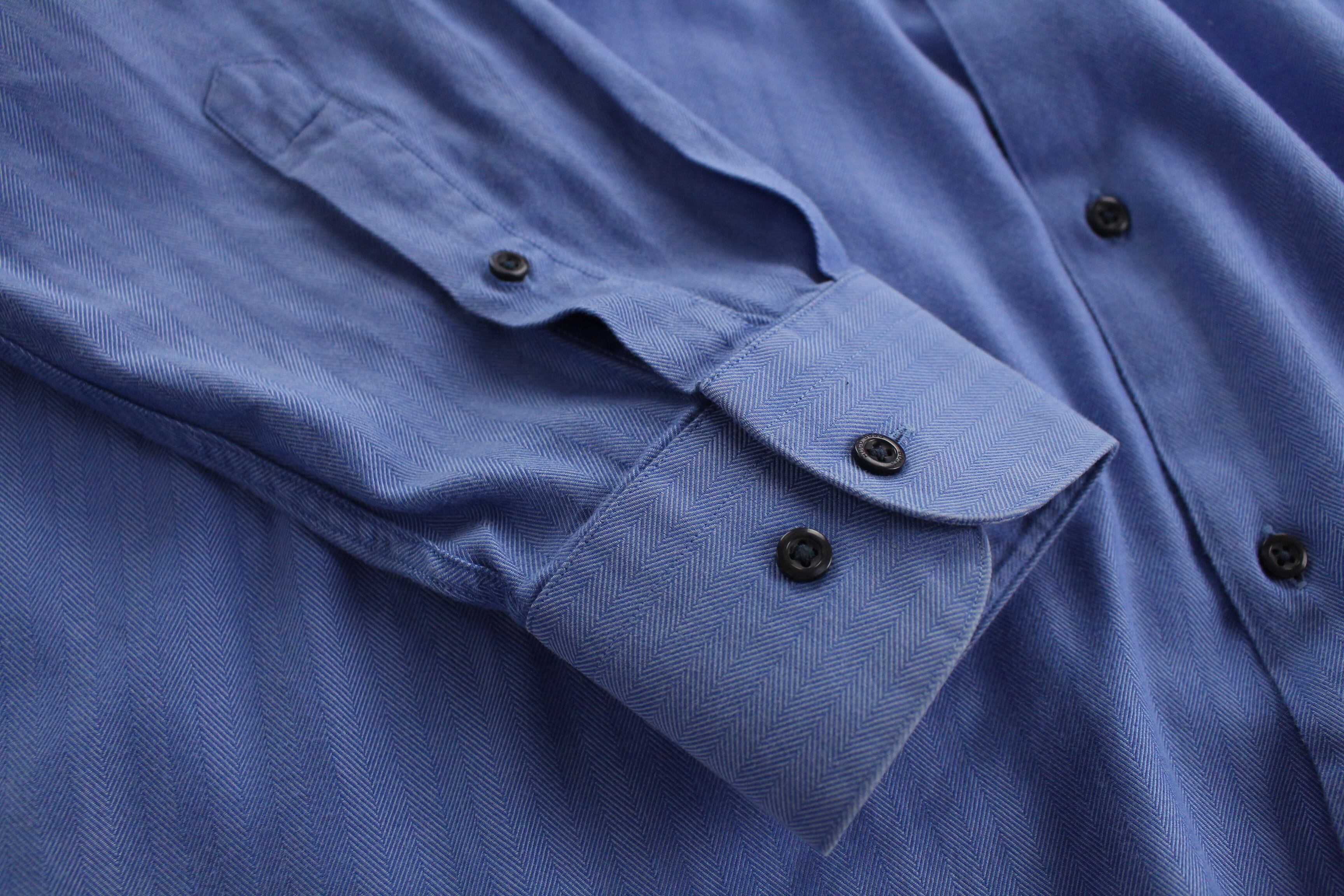 こちらは爽やかなサックスブルーカラーのシャツ。爽やかな印象の色物アイテムです。