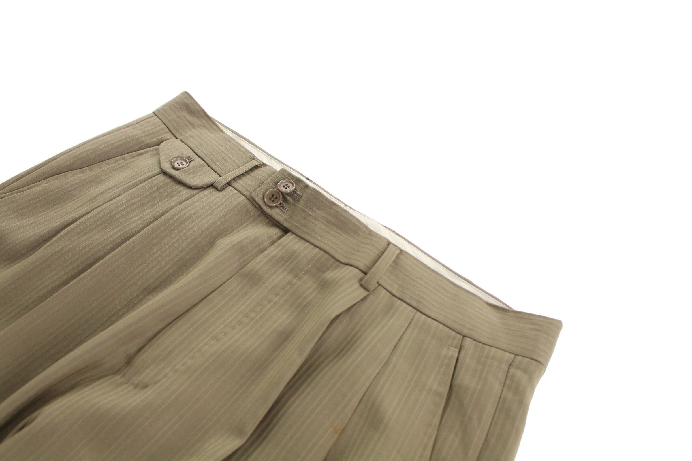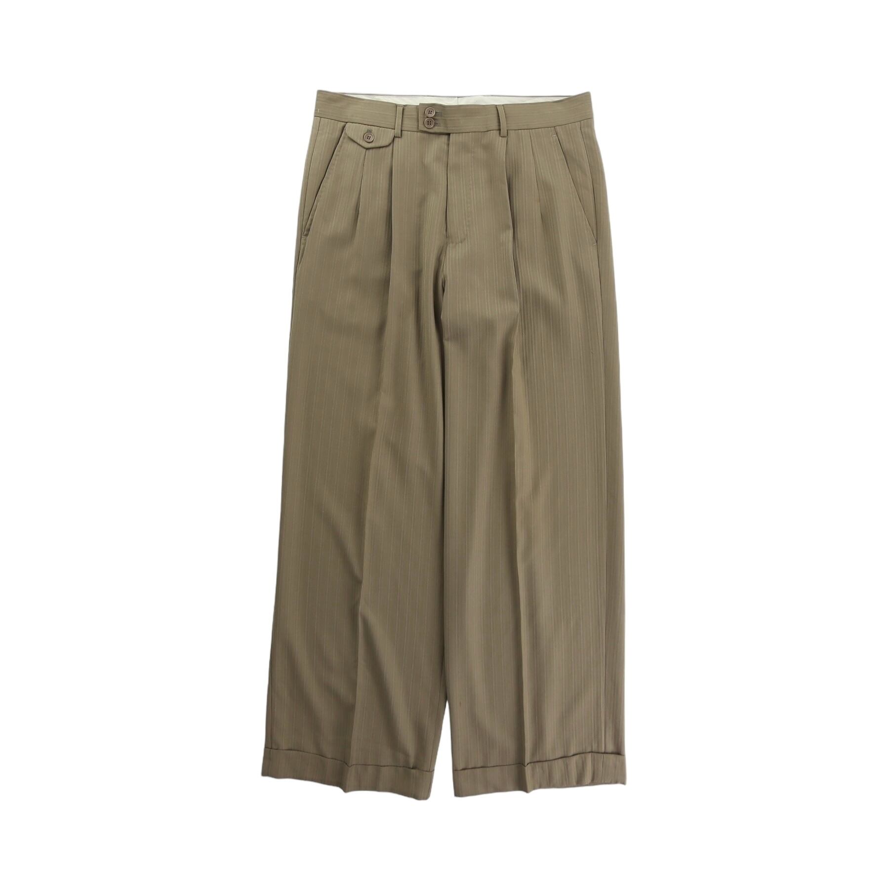 光沢のあるストライプ柄で履いて様になる2タックのワイドスラックス。