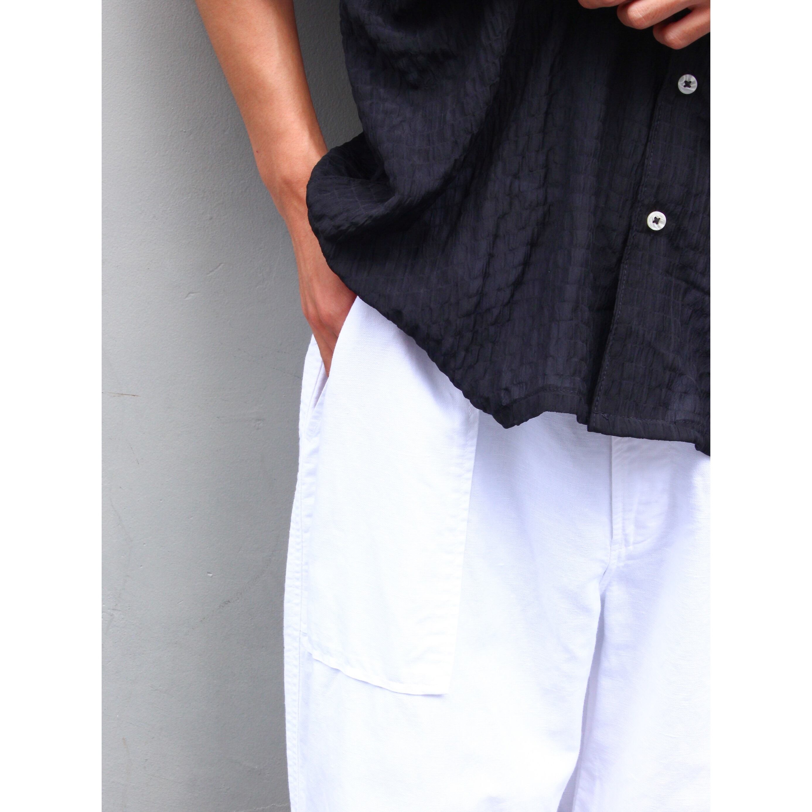 クリーンに履けるホワイトカラーのベイカーパンツでサラッとドライタッチなコットンリネン素材