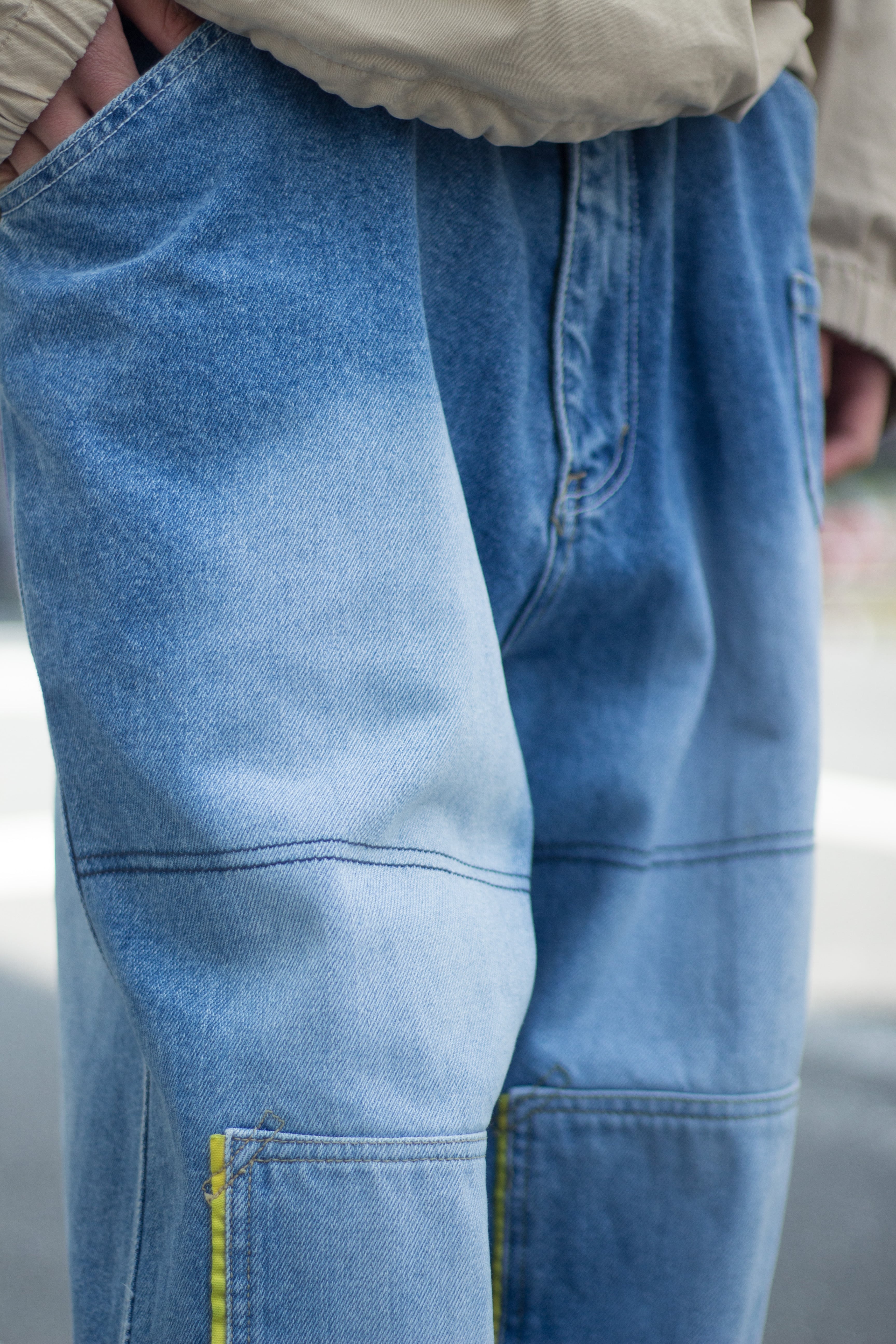 なぜそうなのかというと、大胆なワイドシルエットでイエローを入れる配色やポケットの位置などブランド味を感じるデザインに、まるで半ズボンを繋げたような縫い目、リメイクのようなニーパッチの付け方、色のフェード具合が良くマッチしていて、スタイリングを組む時も、モードでもカジュアルでもそれぞれが作用してくれてるのかなーと◎