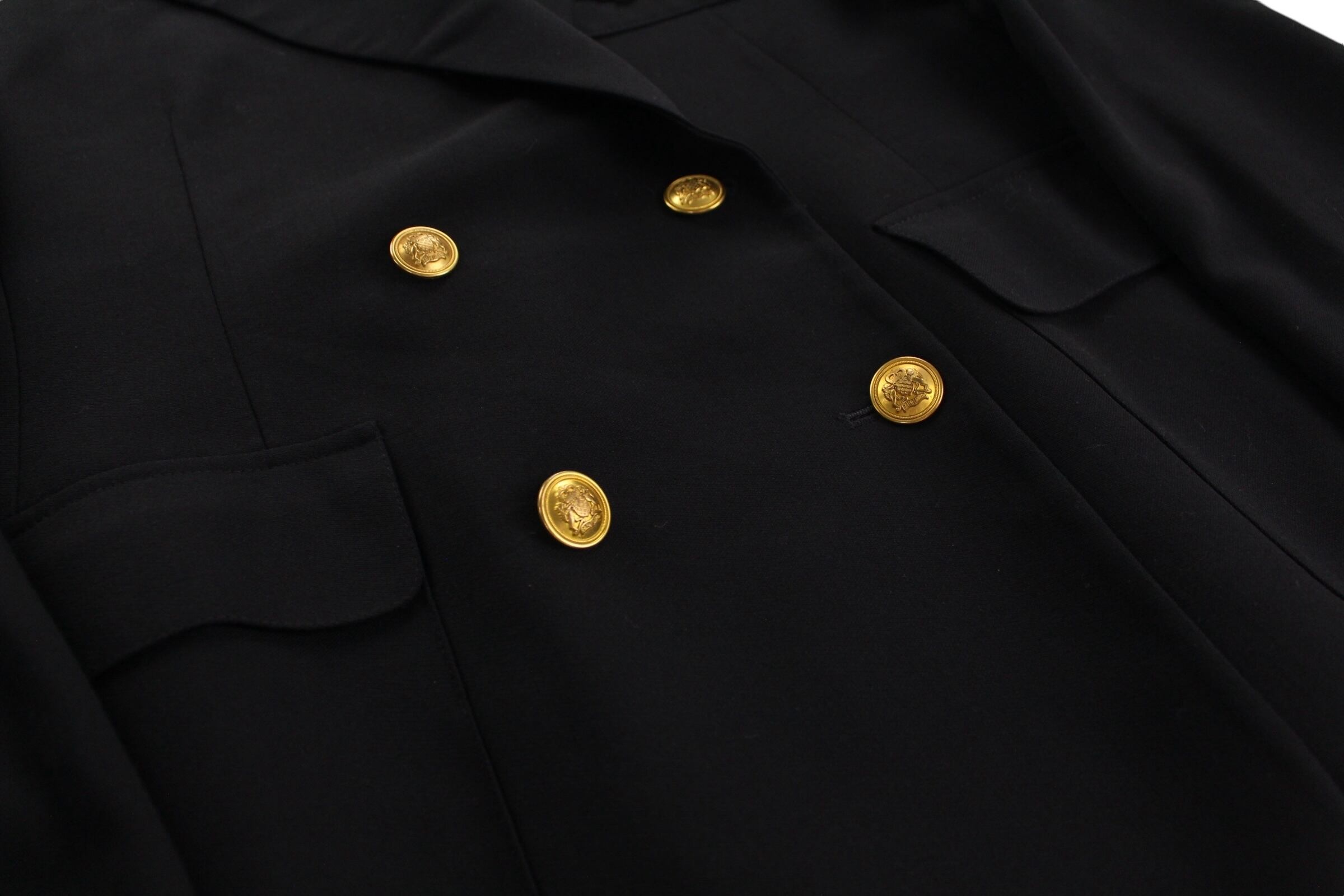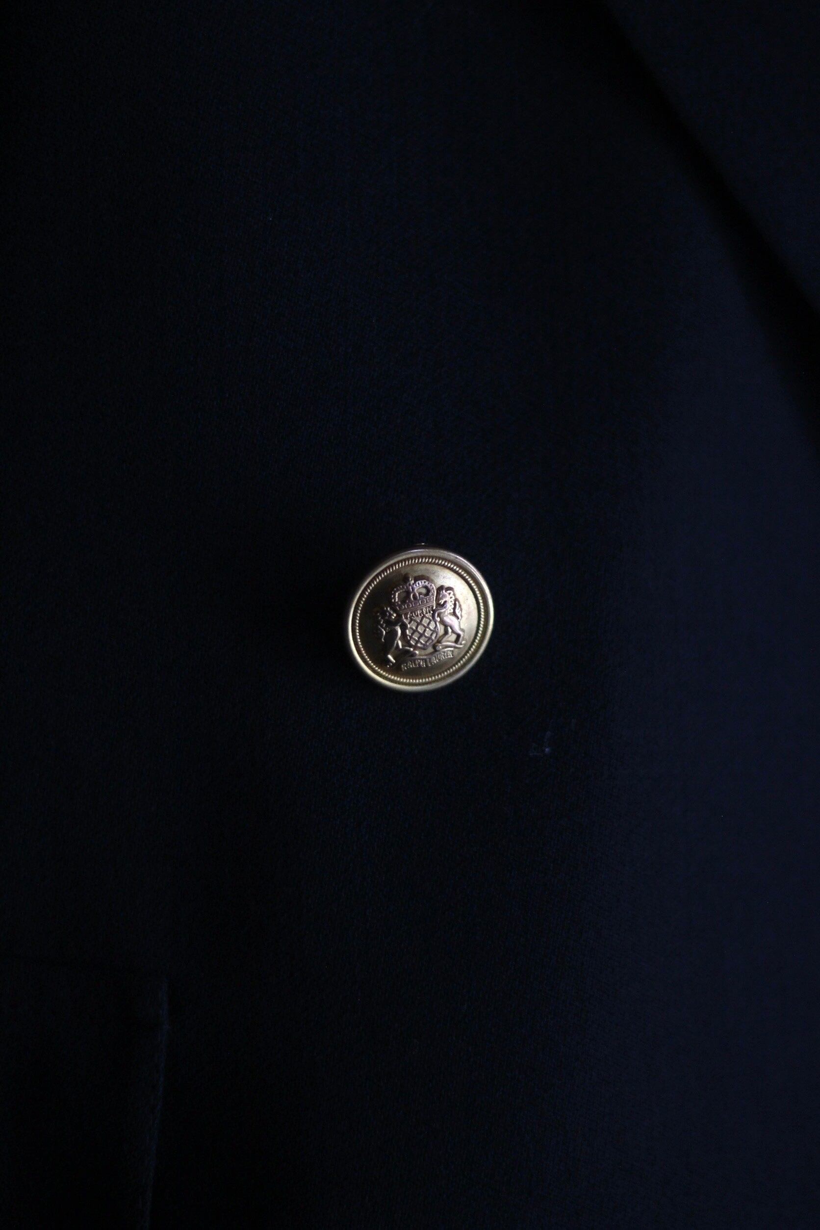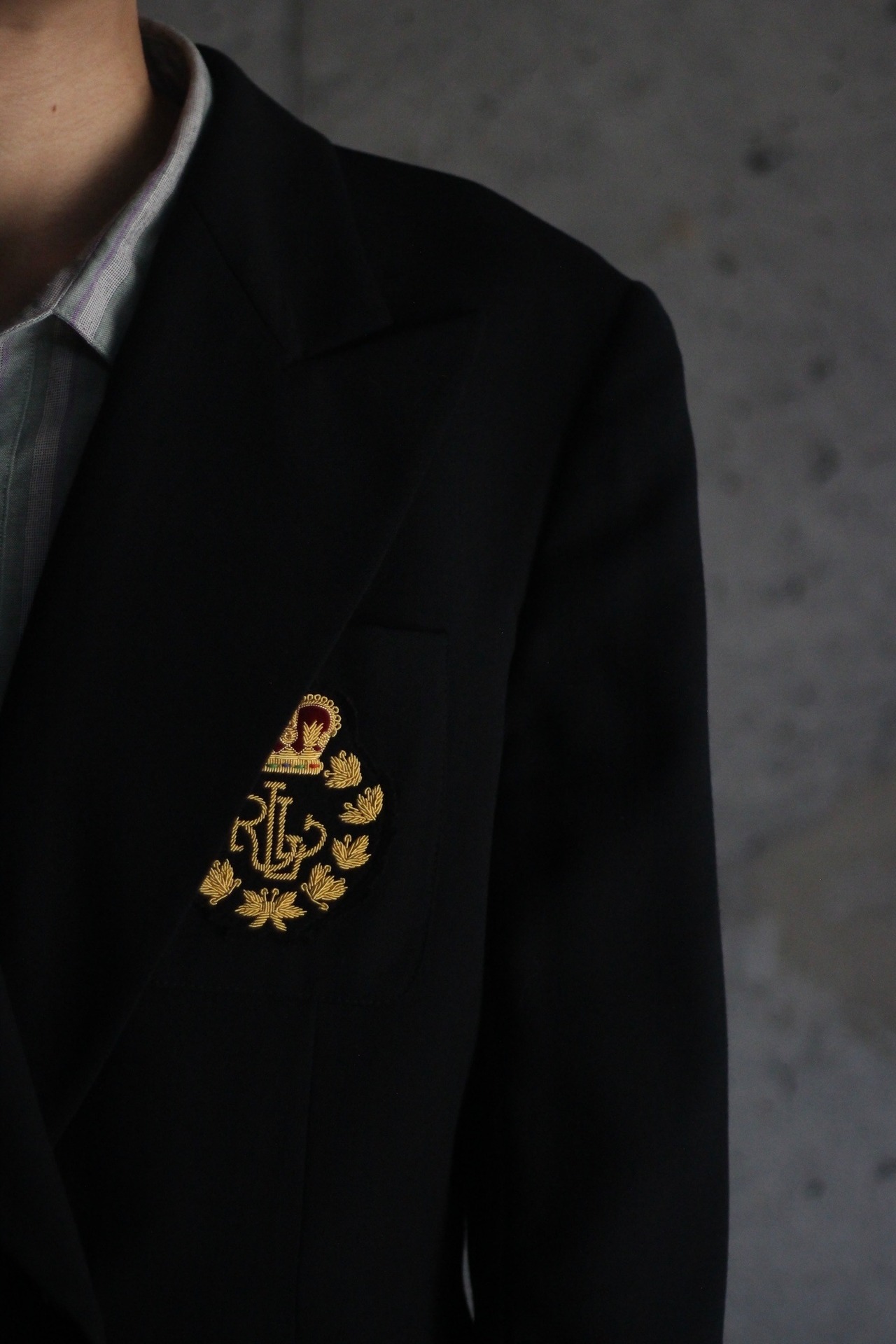 フロントは2ボタンダブル仕様。素材は上質な滑らかなピュアウール。ウール特有の起毛感なく,とろみのある生地感に仕上げたローレンらしいラグジュアリーなファブリック。特徴的ブラックに映える金ボタンと胸元のワッペンが◎