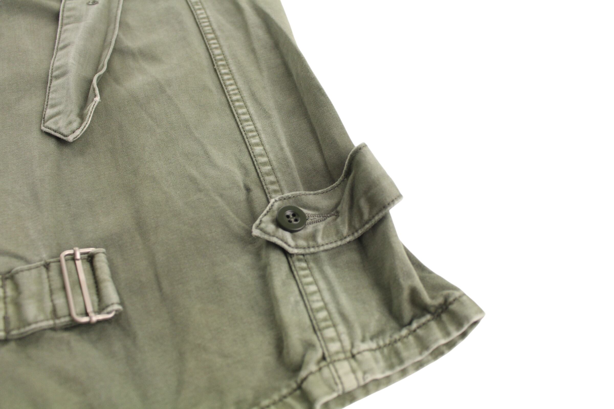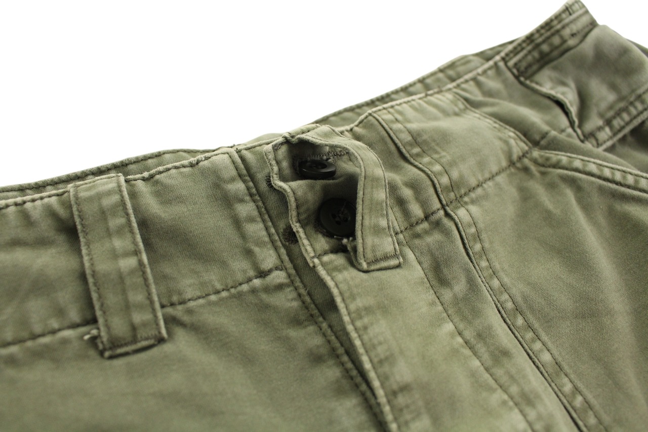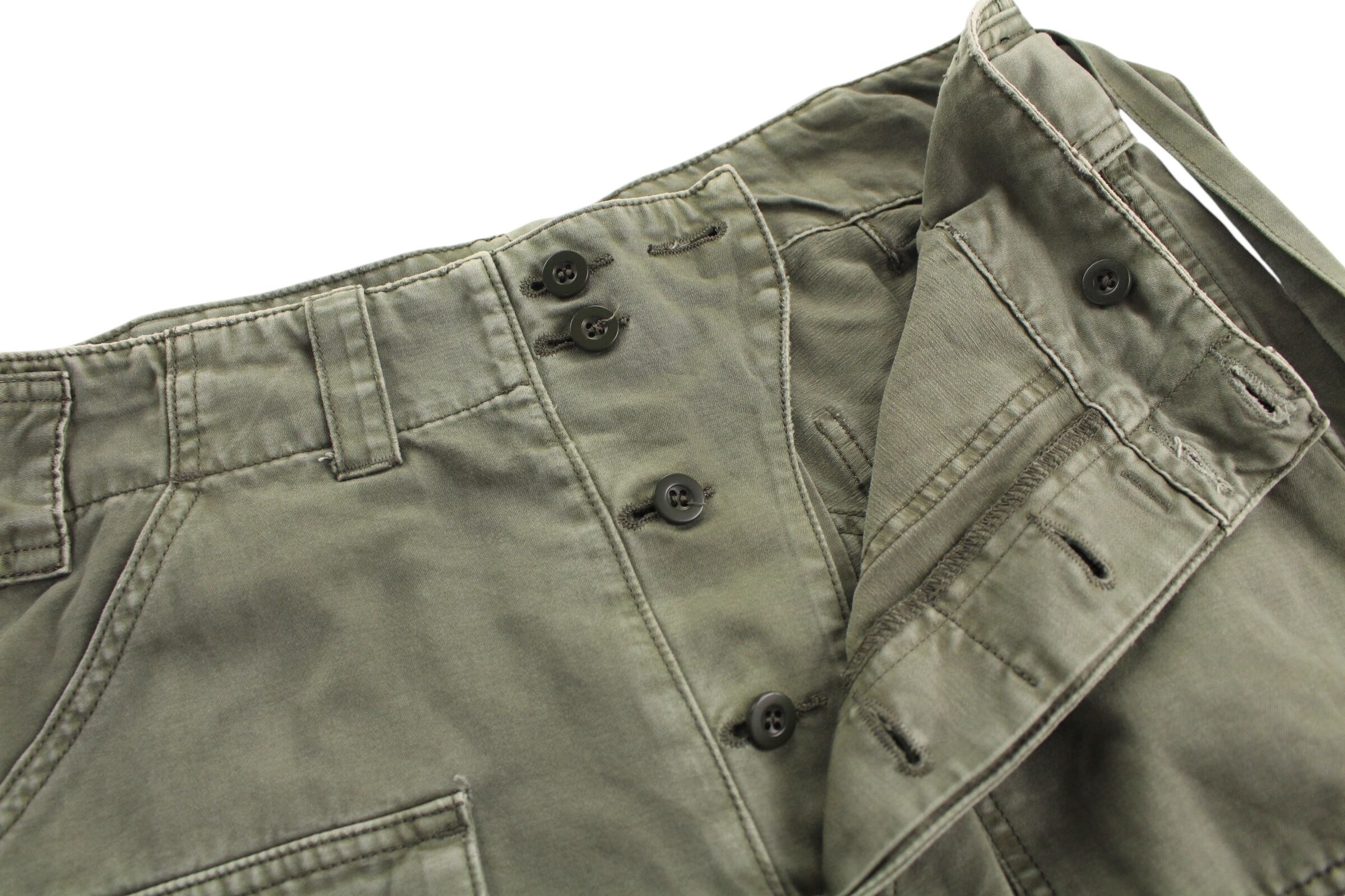 無骨さもありながら随所のベルトでモードさもプラス。使い込まれたクタッとしたコットン地に色褪せたオリーブカラーが絶妙にマッチしたブランドならではのパンツ。