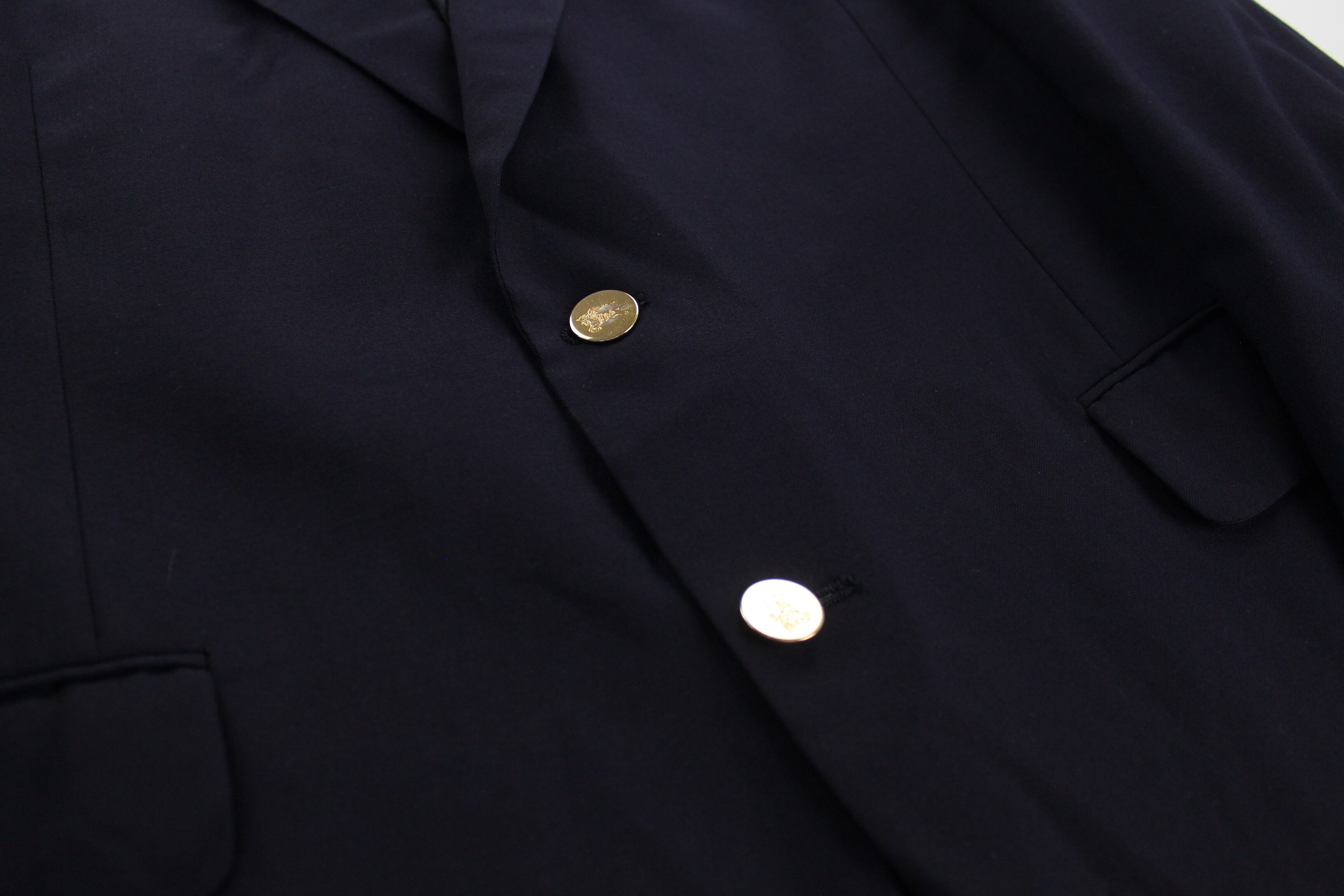 深い高級感漂うミッドネイビーカラーに刻印入りの金ボタンが映える逸品です。
