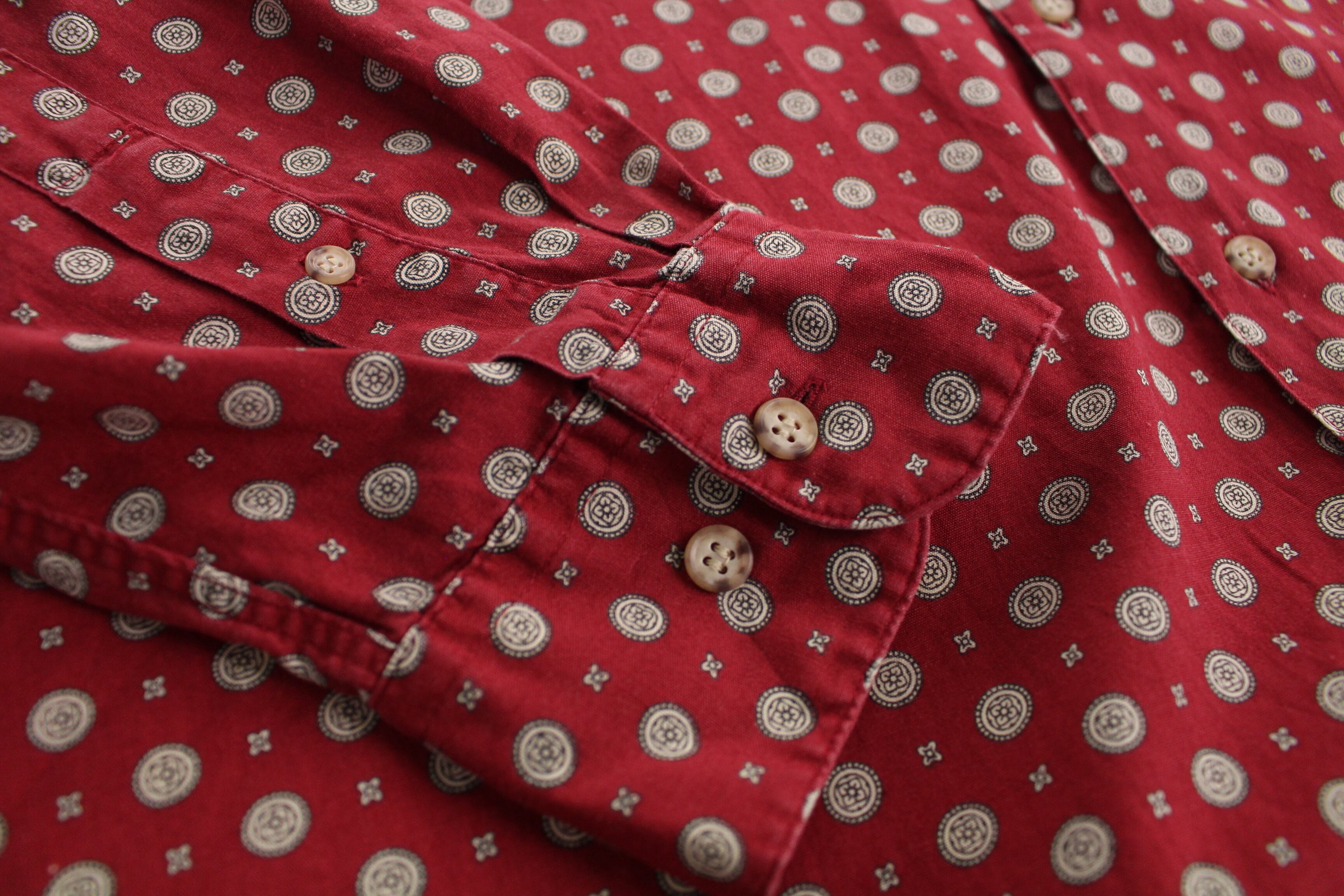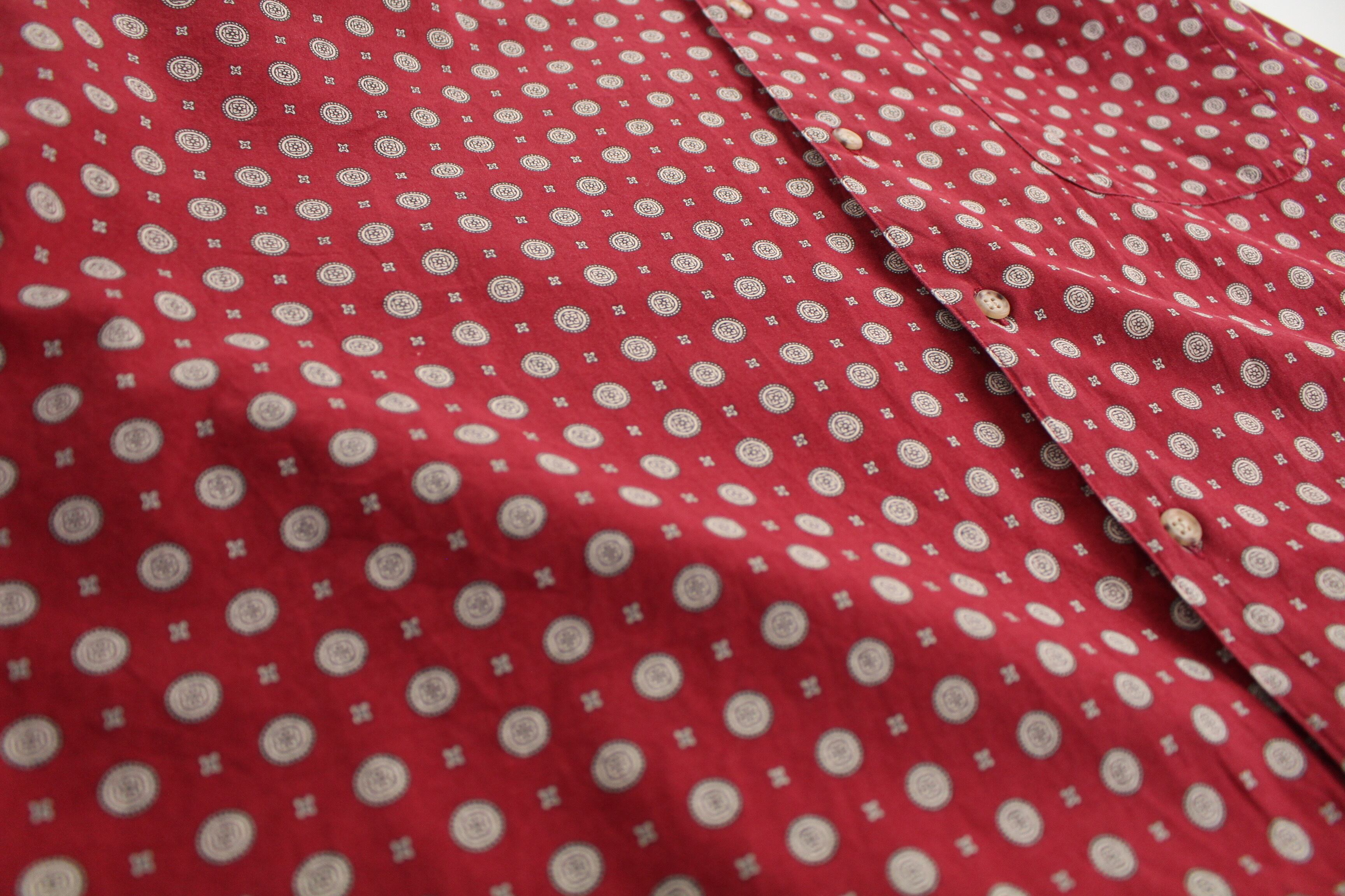 落ち着いたレッドカラーにヴィンテージスタイルな小紋柄が全面にプリントされた流石オールド・ギャップなイケてる一枚です