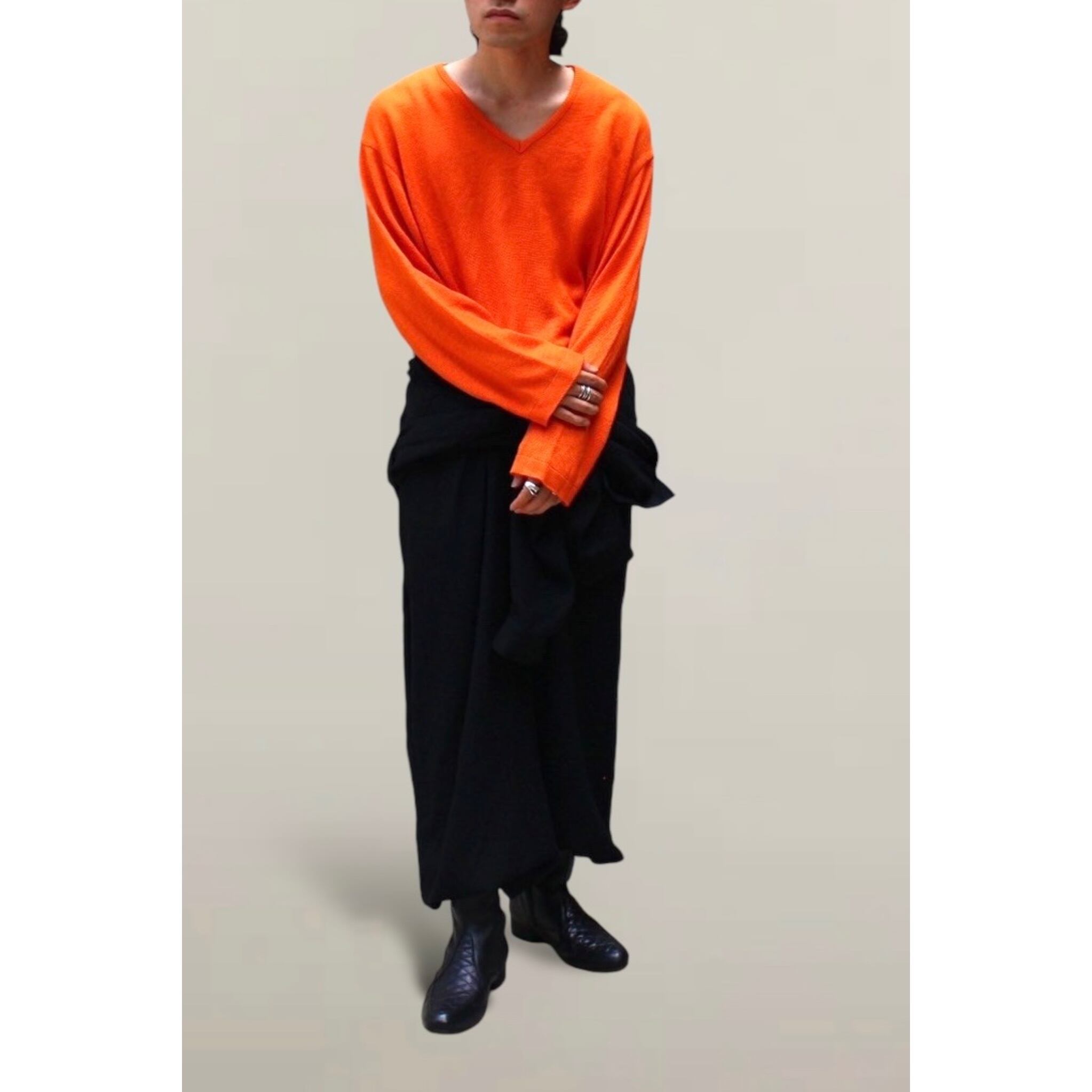 薄手のニットなのでインナーとしても一枚でも活躍してくれる一着。