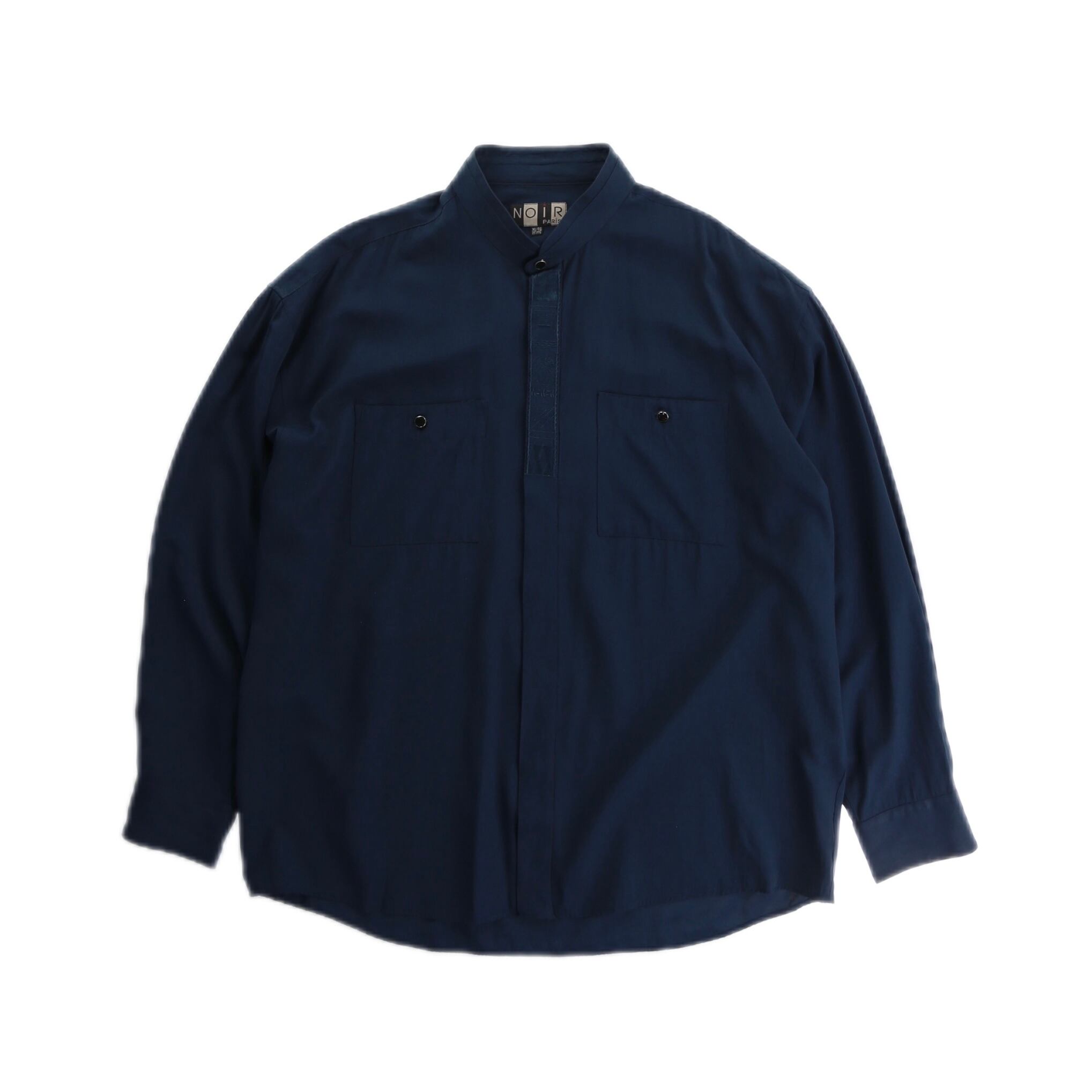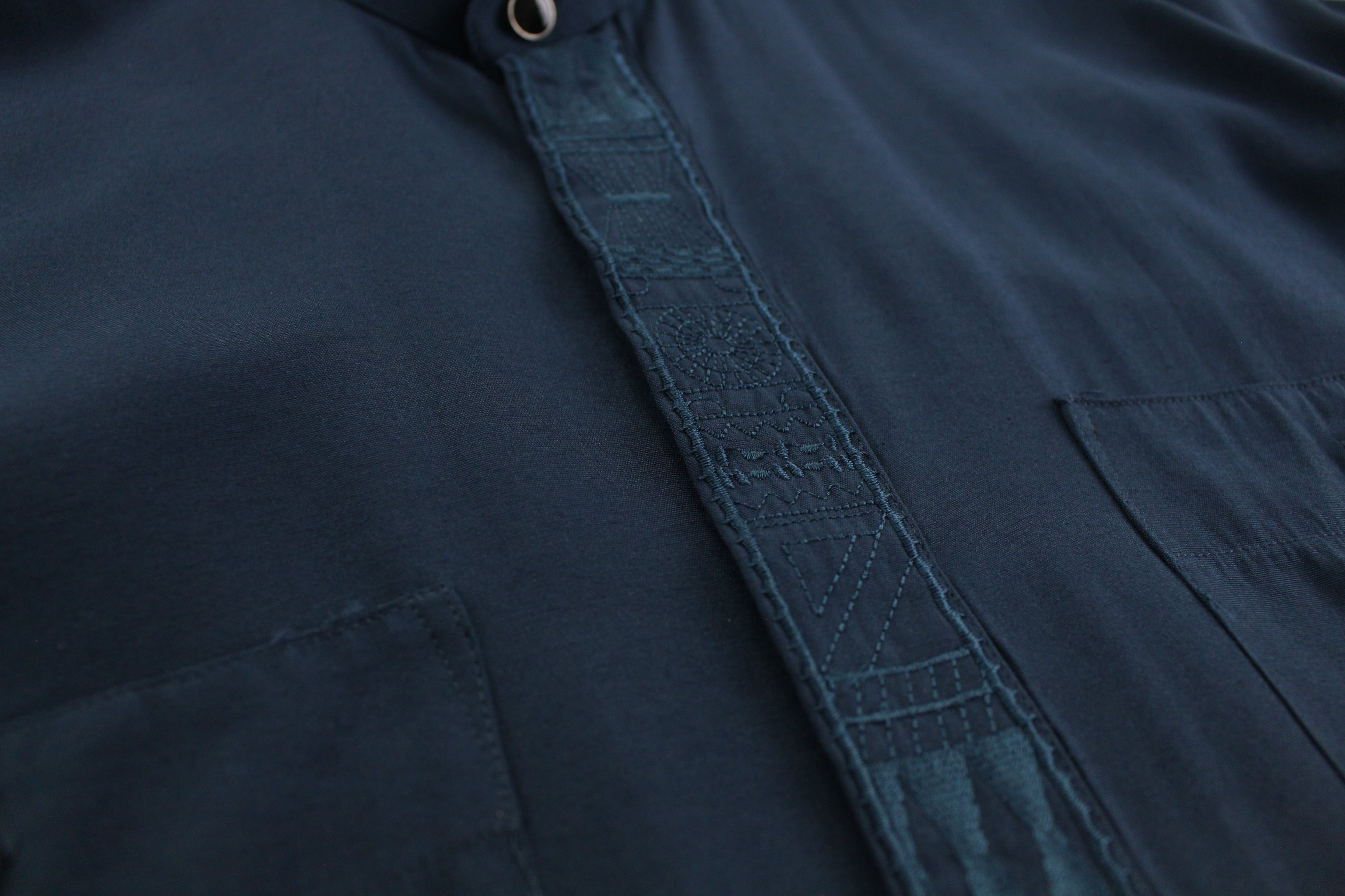 【CUBA】1990s vintage navy embroidery design rayon band-collar shirt -7925-