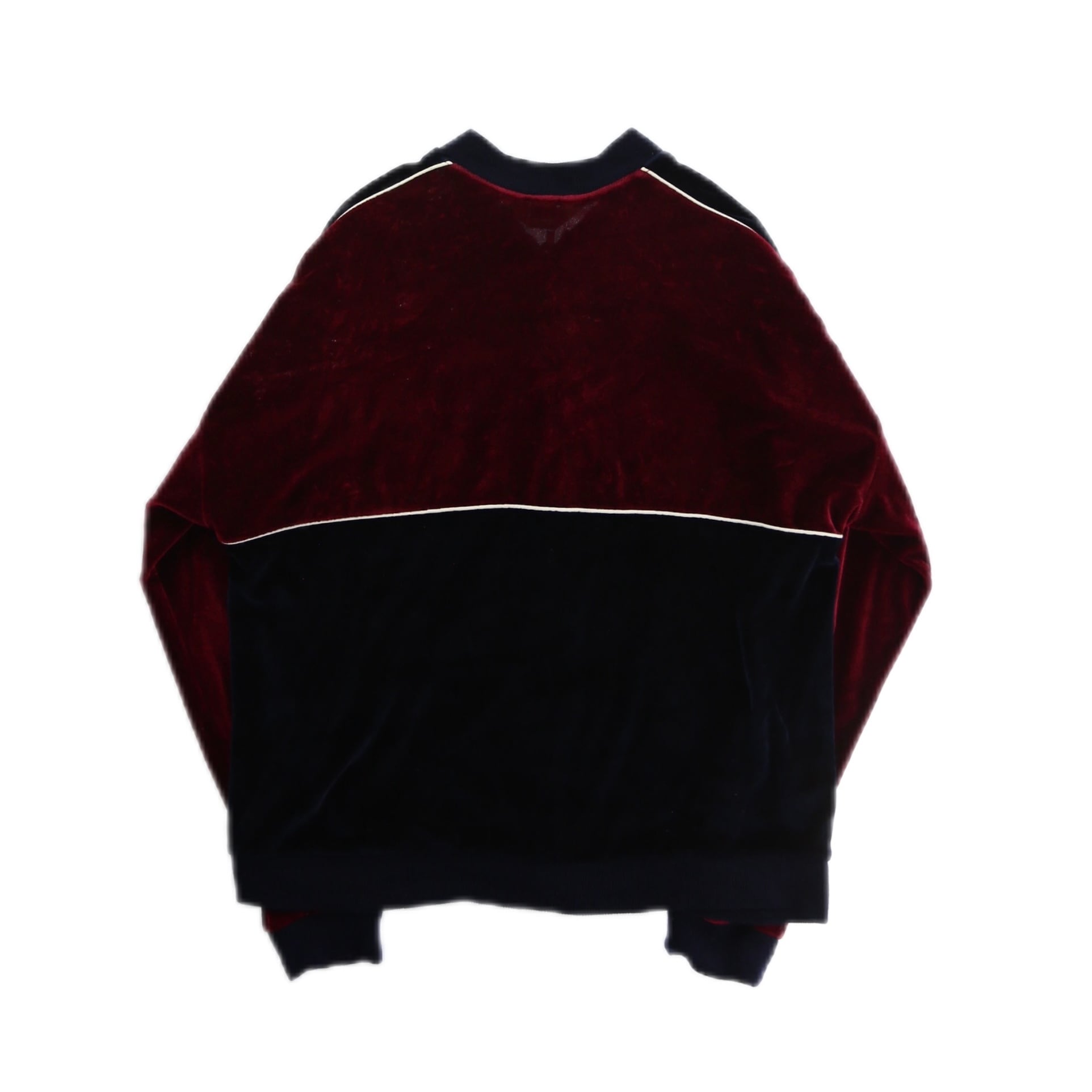 丸リブ襟にフルジップ、ボルドー×ネイビーのバイカラーにホワイトのパイピング。アームラインに胸元にはエンブレムロゴ刺繍のデザイン。