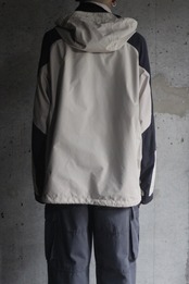 首元がパッカブルのような収納性があり出すとフーディ仕様になっていて首元と腰回りにドローコード常備でくしゃっとシルエットを変えられる一着。