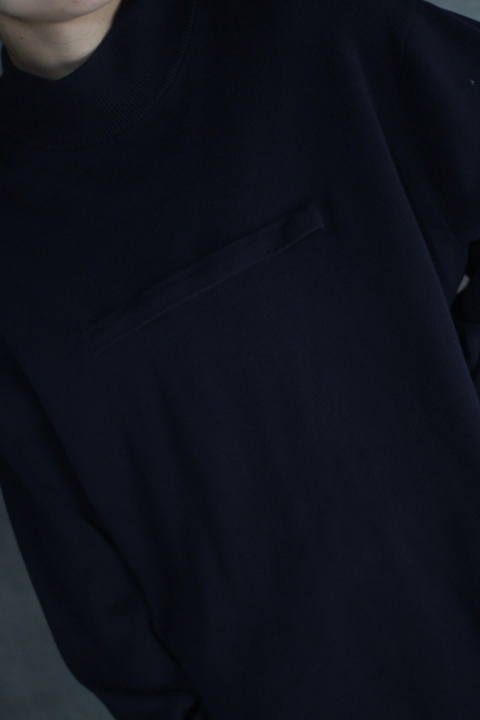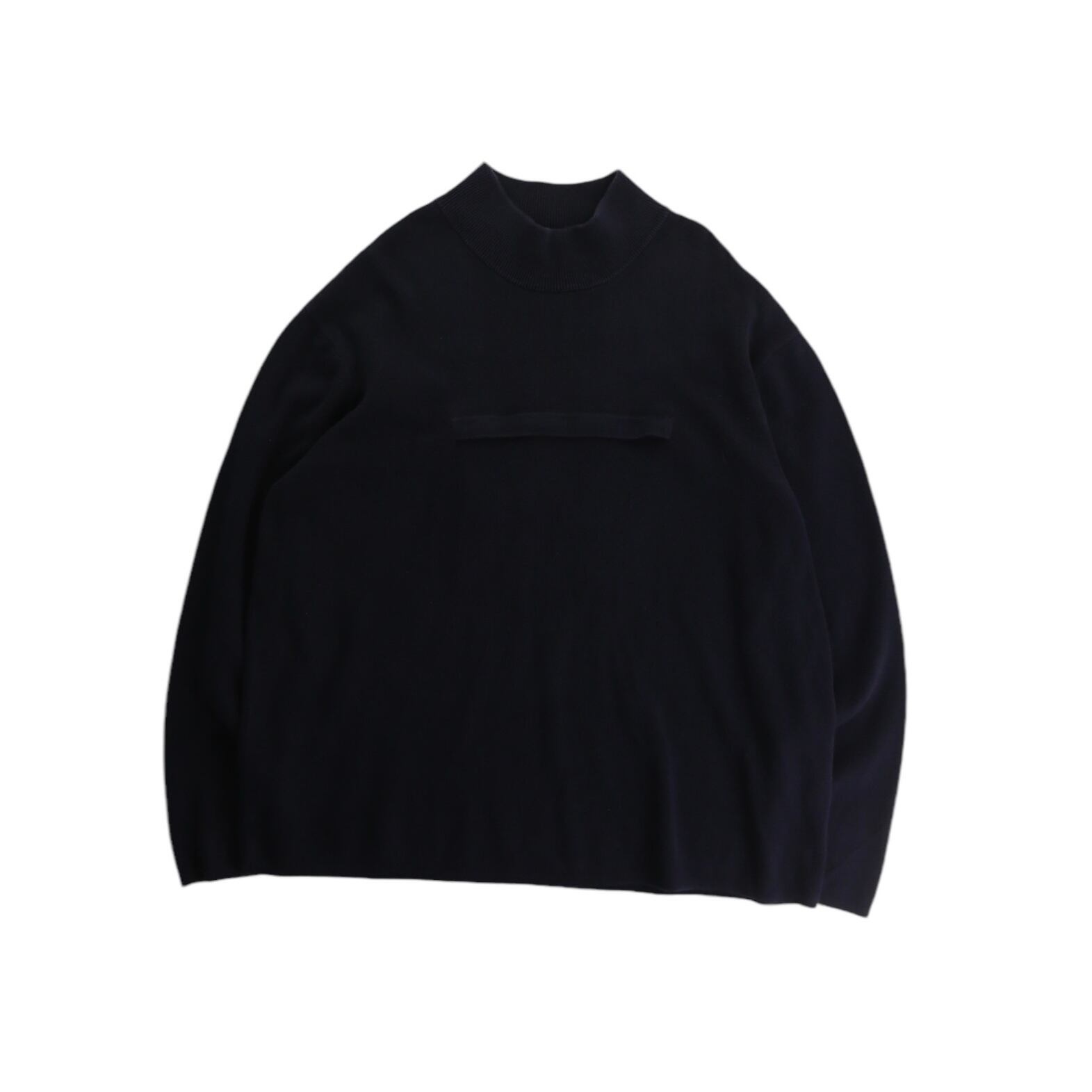 此方は薄手でのコットンファブリックを使用されてるデザインニットで首元がモックネックなので秋冬等は暖かく上品なネイビーカラーリングとマッチしていて秋冬ぴったりなニット。