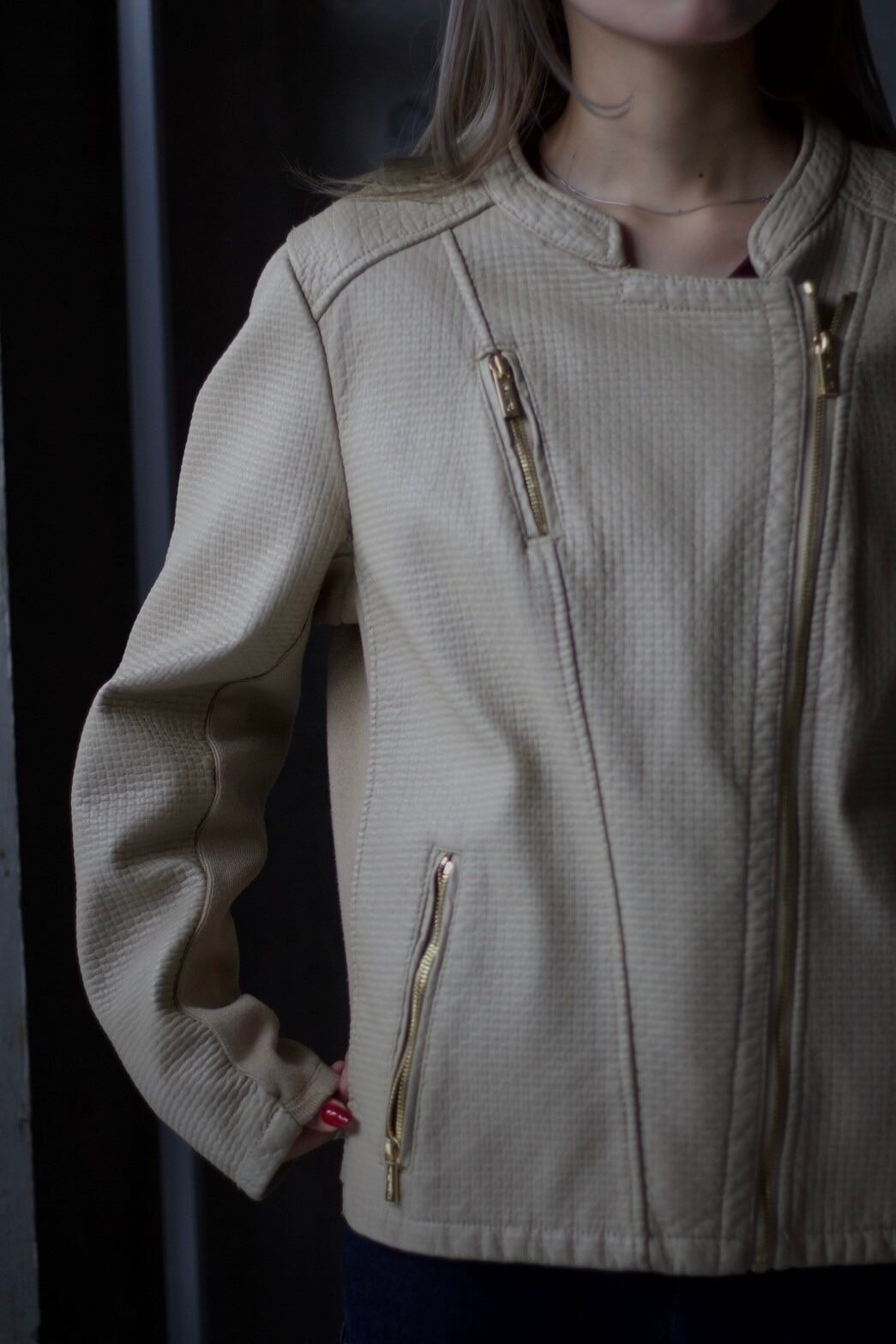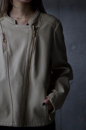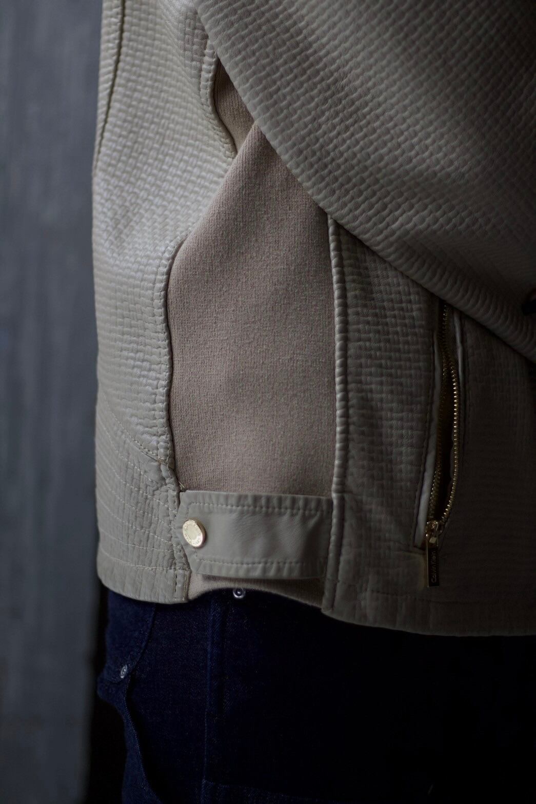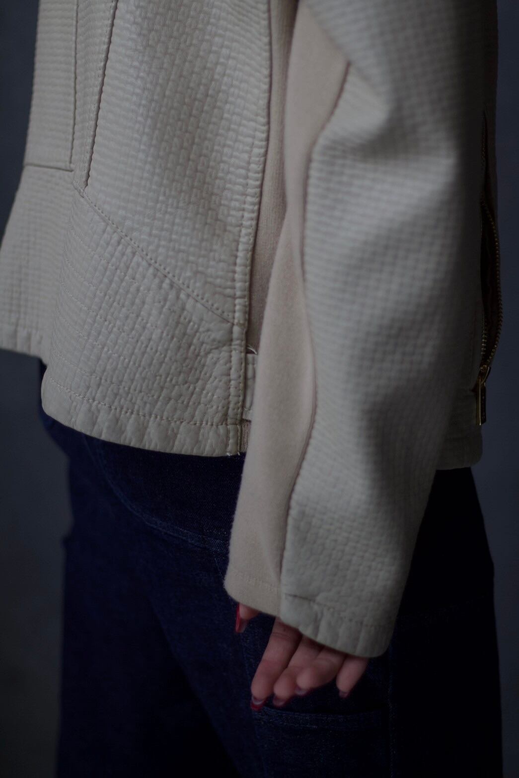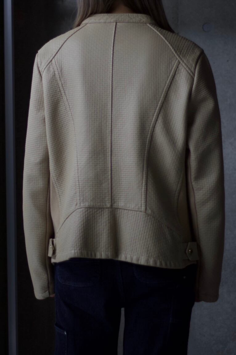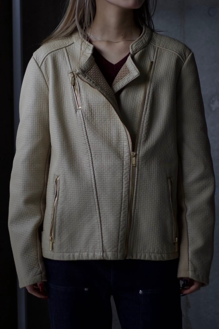 ダブルライダースデザインで襟のないノーカラータイプ。ベージュカラーの甘めなカラーリングで男らしさはなく随所のゴールドジップやボタン合わせでむしろゴージャスな1着。アーム下部やサイドは柔らかい生地切替により着用時にはノンストレスで着ていただけます☺︎