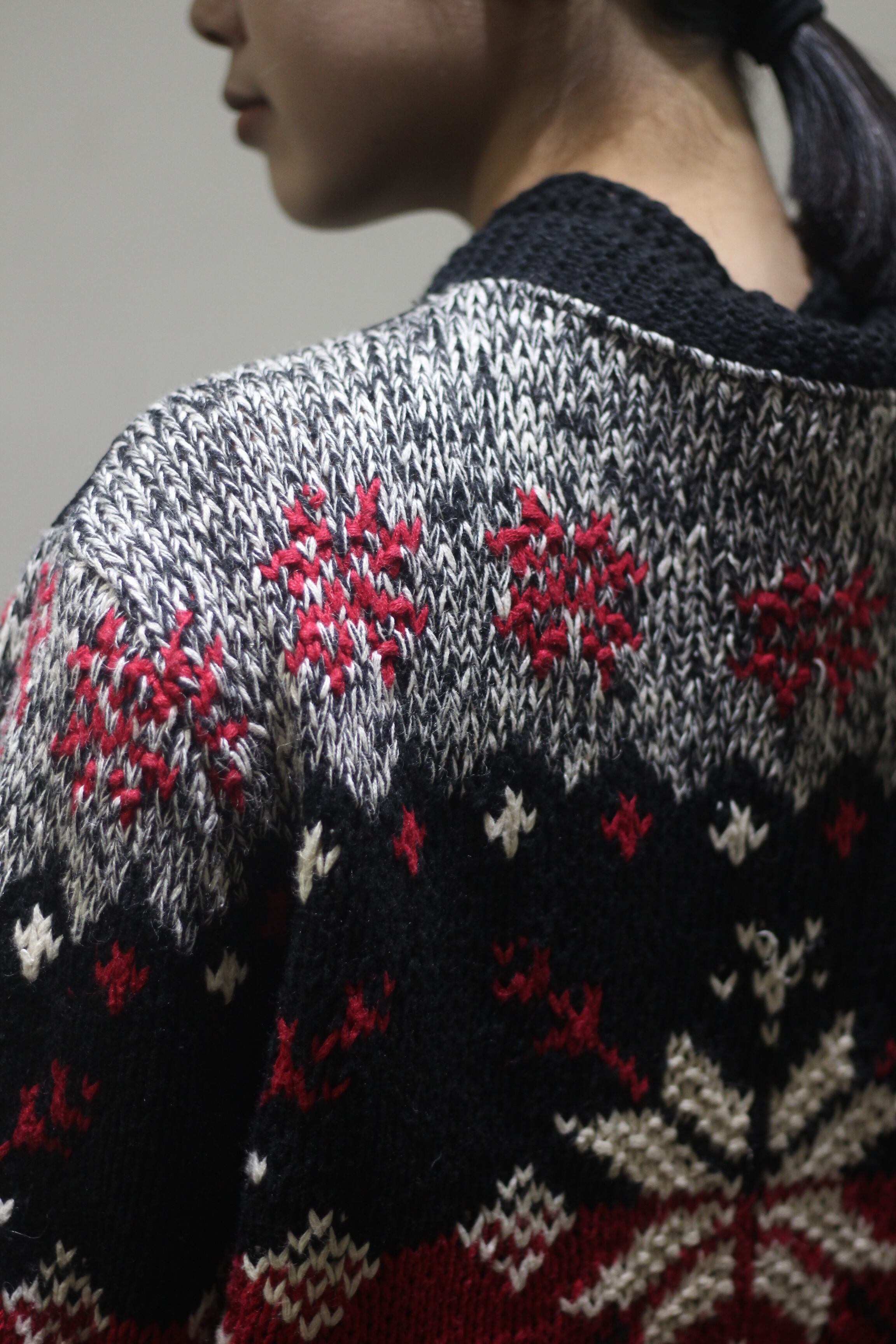 素材はコットン×ラミー混紡のスウェット感覚で着れるミドルゲージ仕様。珍しいブラックボディでのノルディック柄がめちゃくちゃお洒落です。。