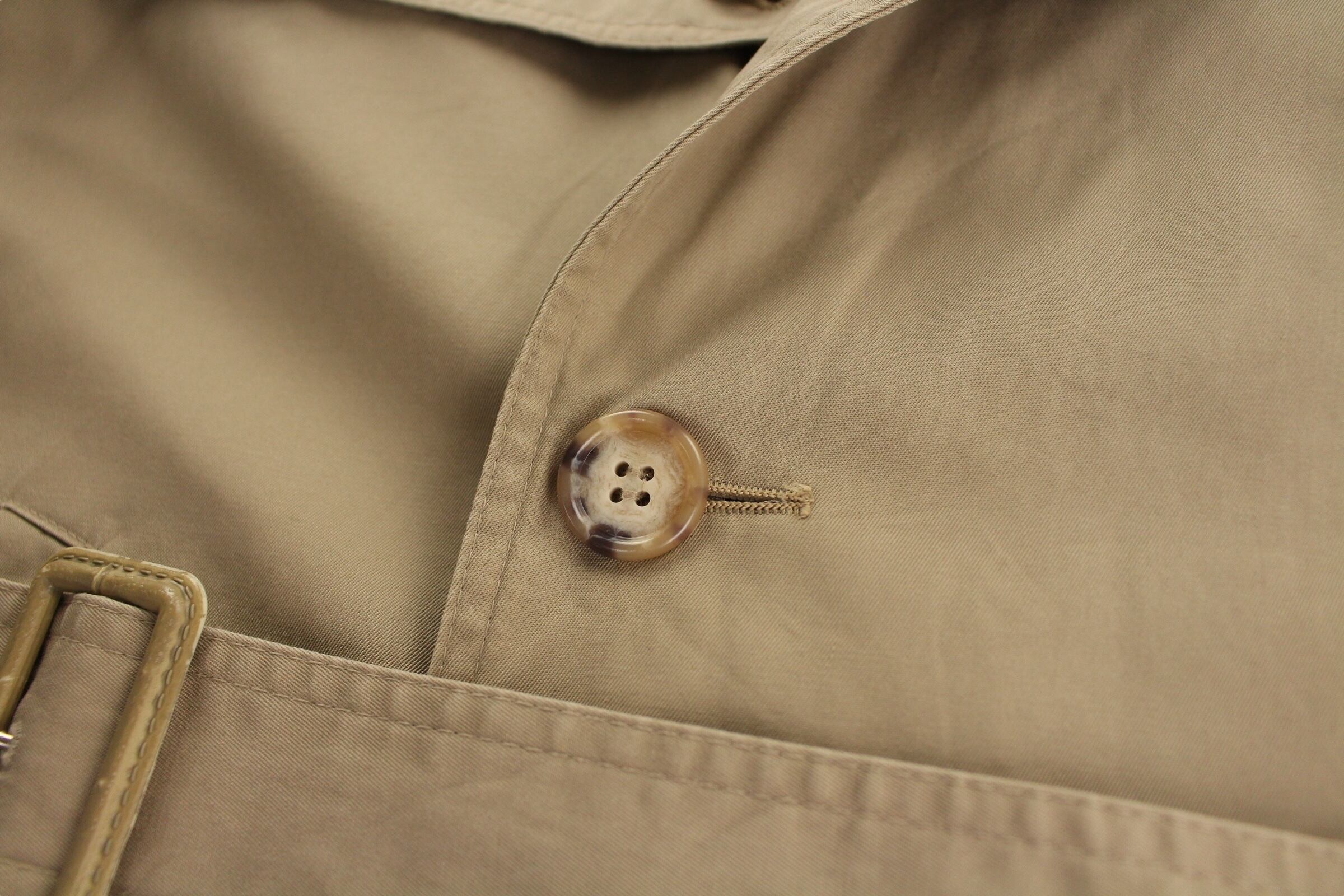 エポレッド、ガンフラップ、袖口ベルト、ヨークや高めなベルト位置、更には首元にフックの付くスタンドネックにもできる仕様等。。。各所パーフェクトなトレンチディテール。