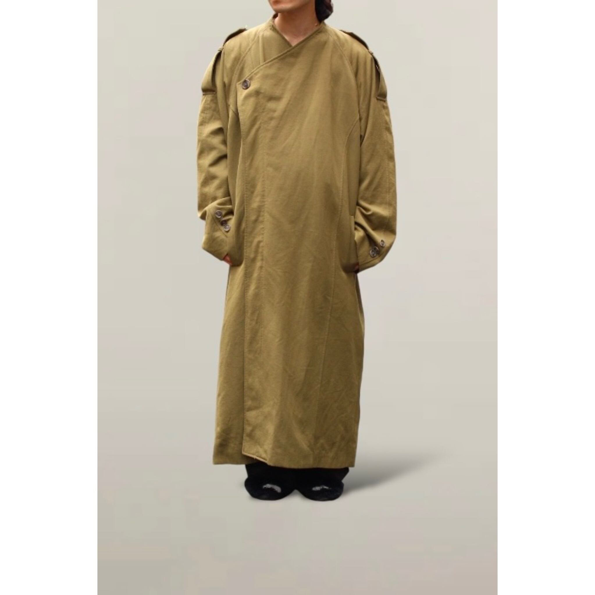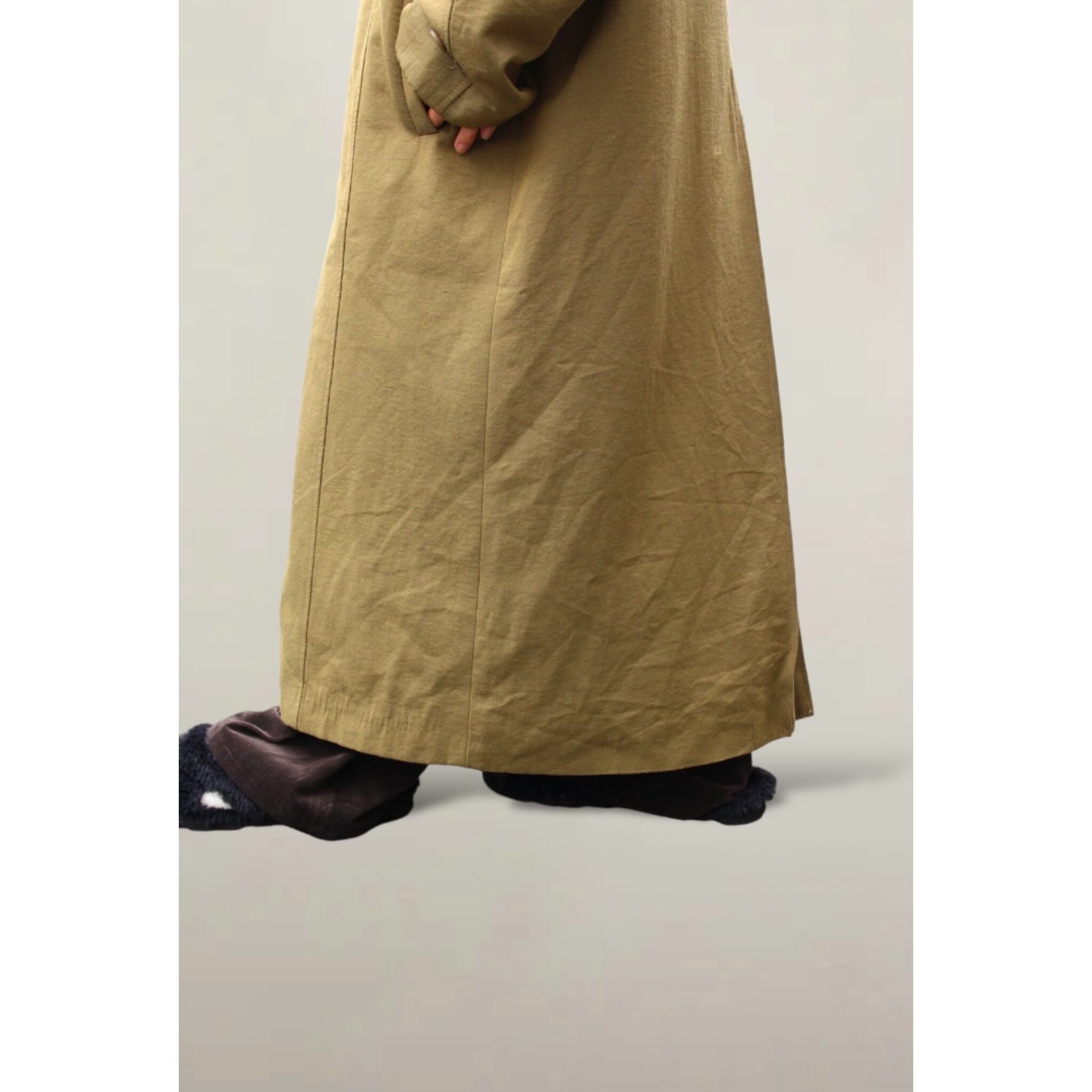 130cmの超ロングな丈感。カーキオリーブのカラーリングが渋さもあってカッコ良いコート。古着ならではのデザイン性の良さが素晴らしい。