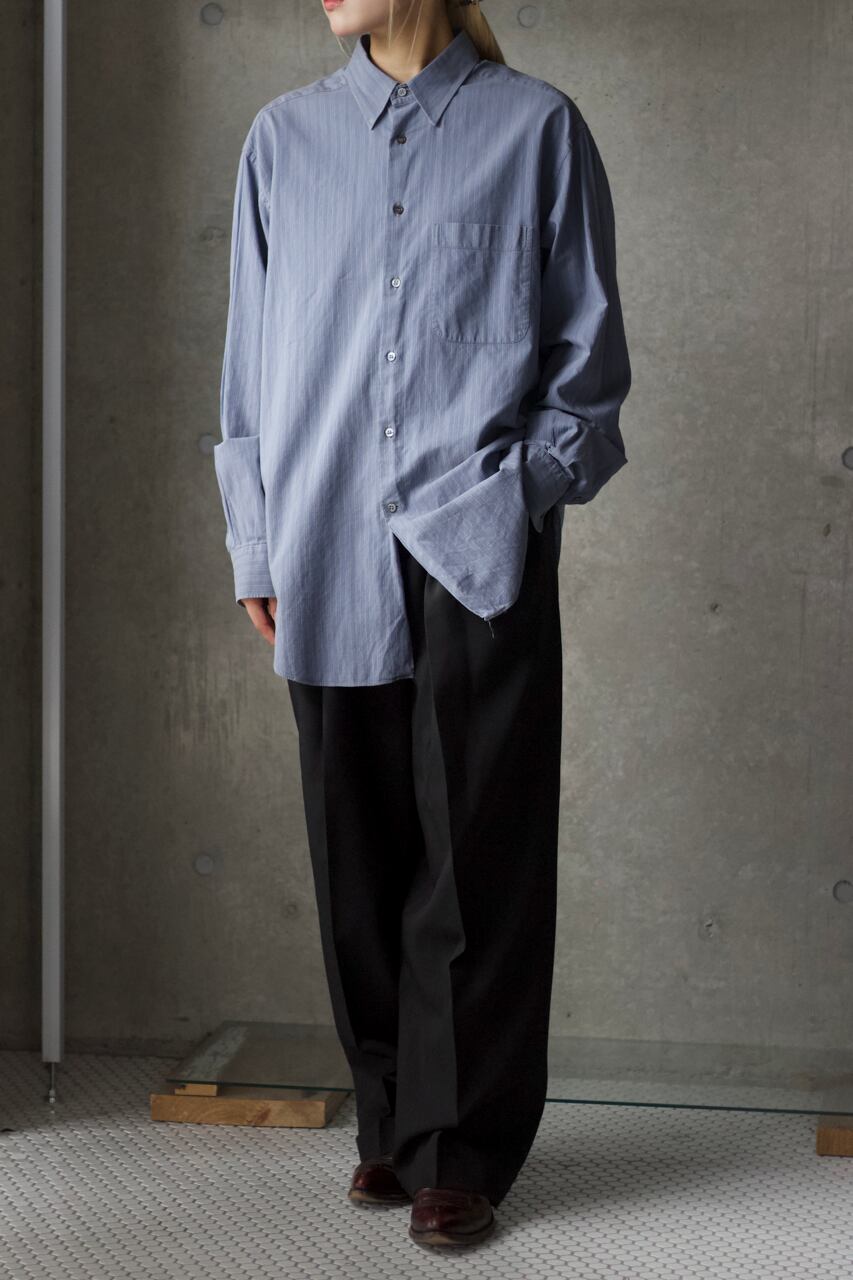 秋冬を感じるクールなブルーベースの色味で仕立てられておりコンディションもグッドで非の打ち所がないドレスシャツ。