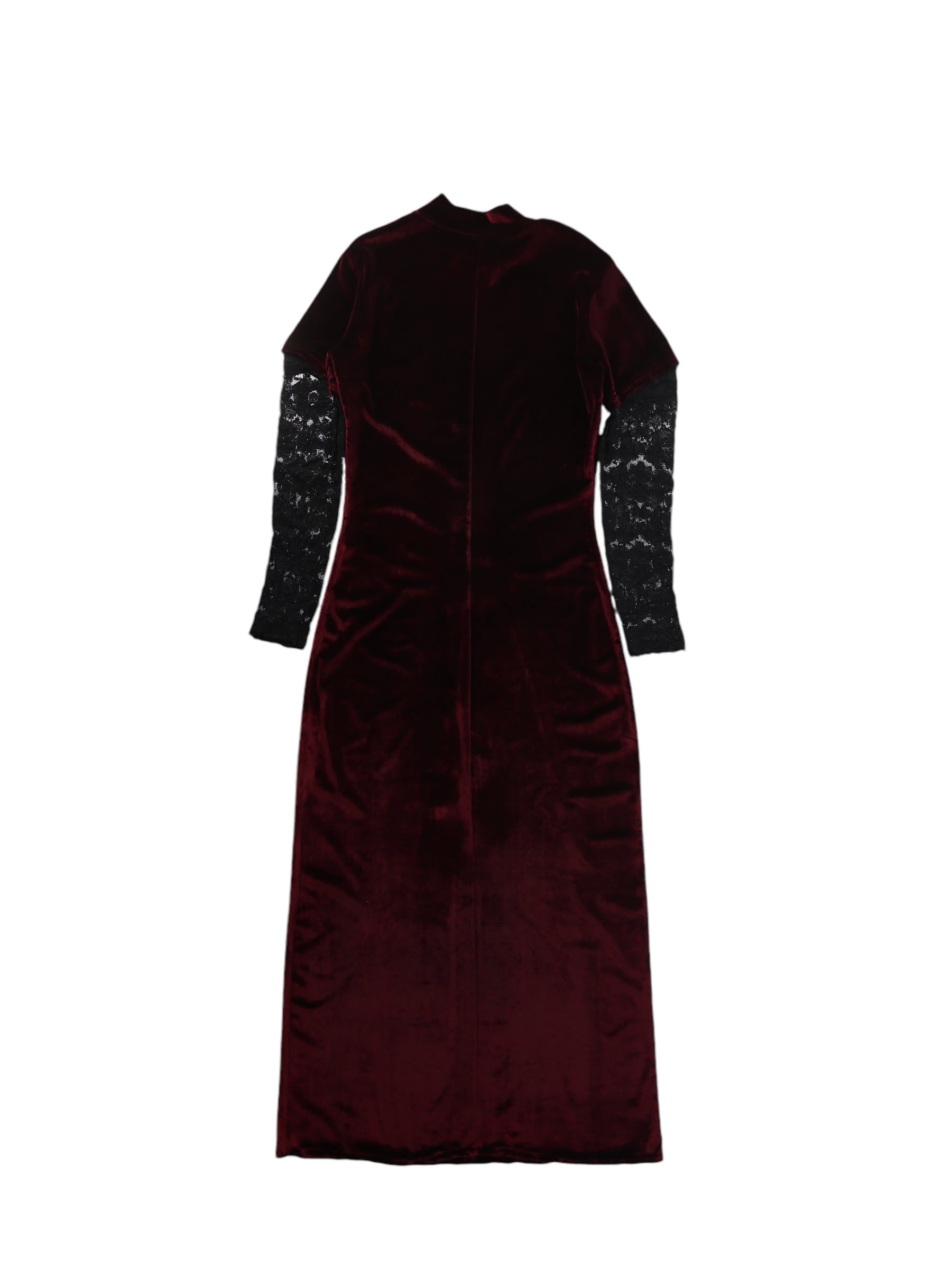 ボディはハイネックのベロア素材。袖は、ブラックのレースになっており、花柄の様な柄感が施されています。
