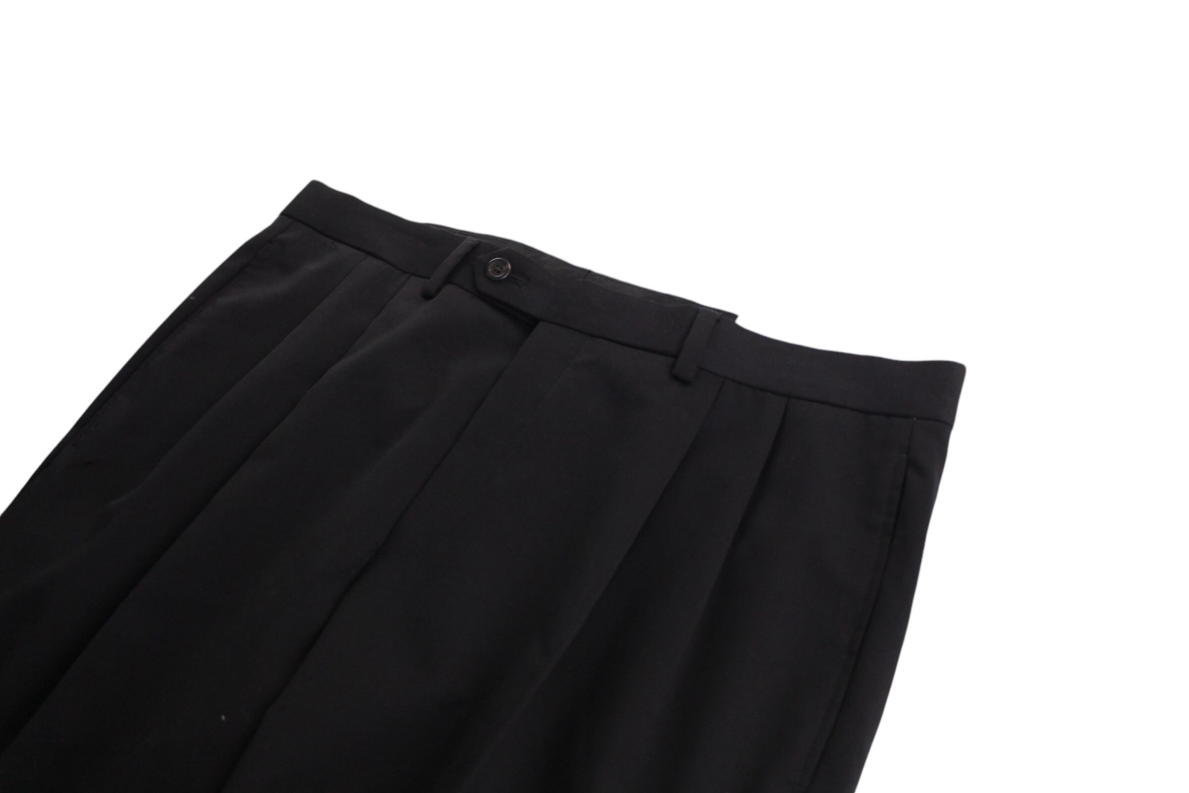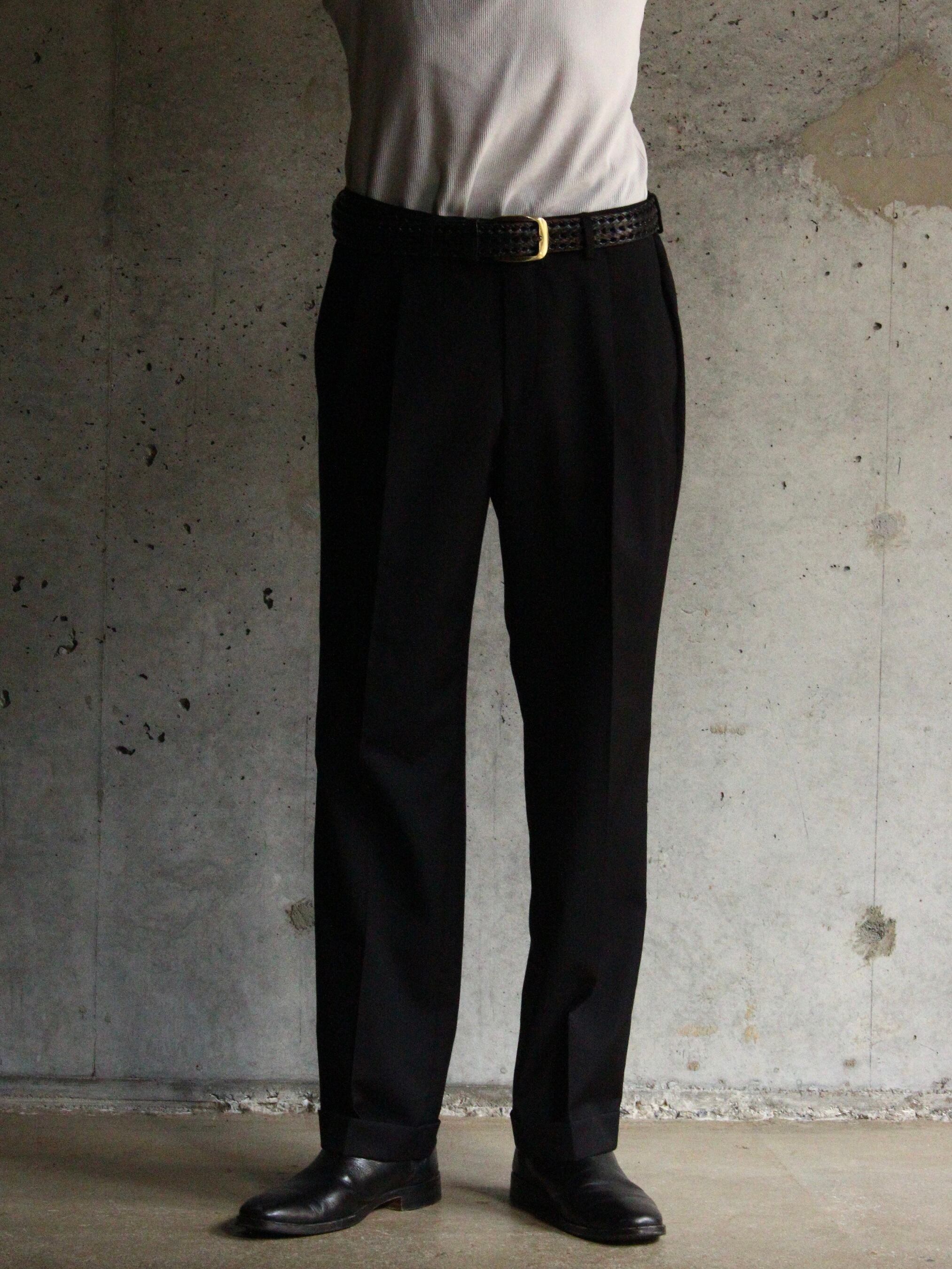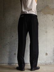2タックのしっかりと余裕を持ってとられた腿周り。着用した時のシルエットも美しく素材もドレープ感もある綺麗なスラックス。高級感のあるウール素材がシルエットと絶妙にマッチ。
