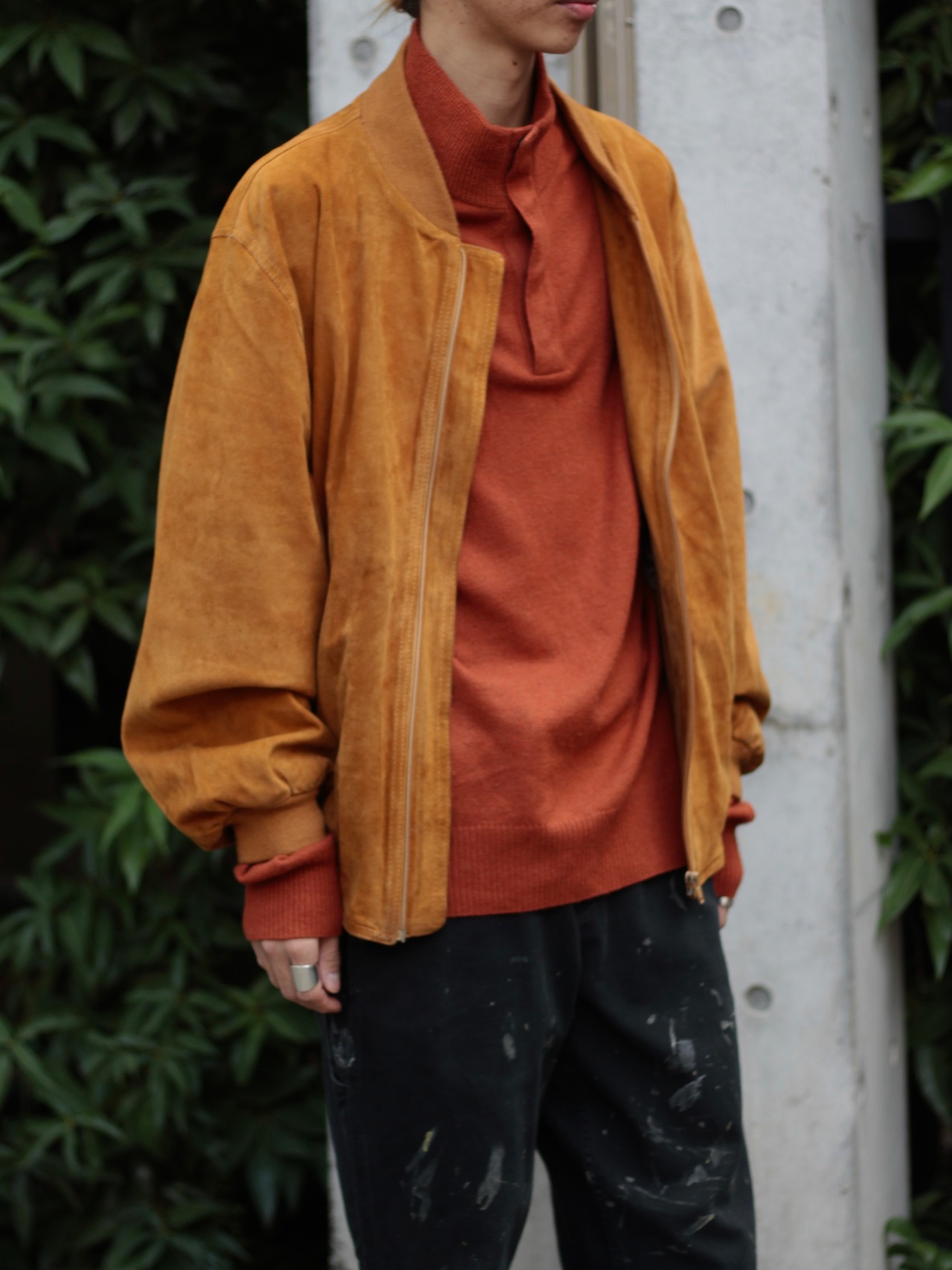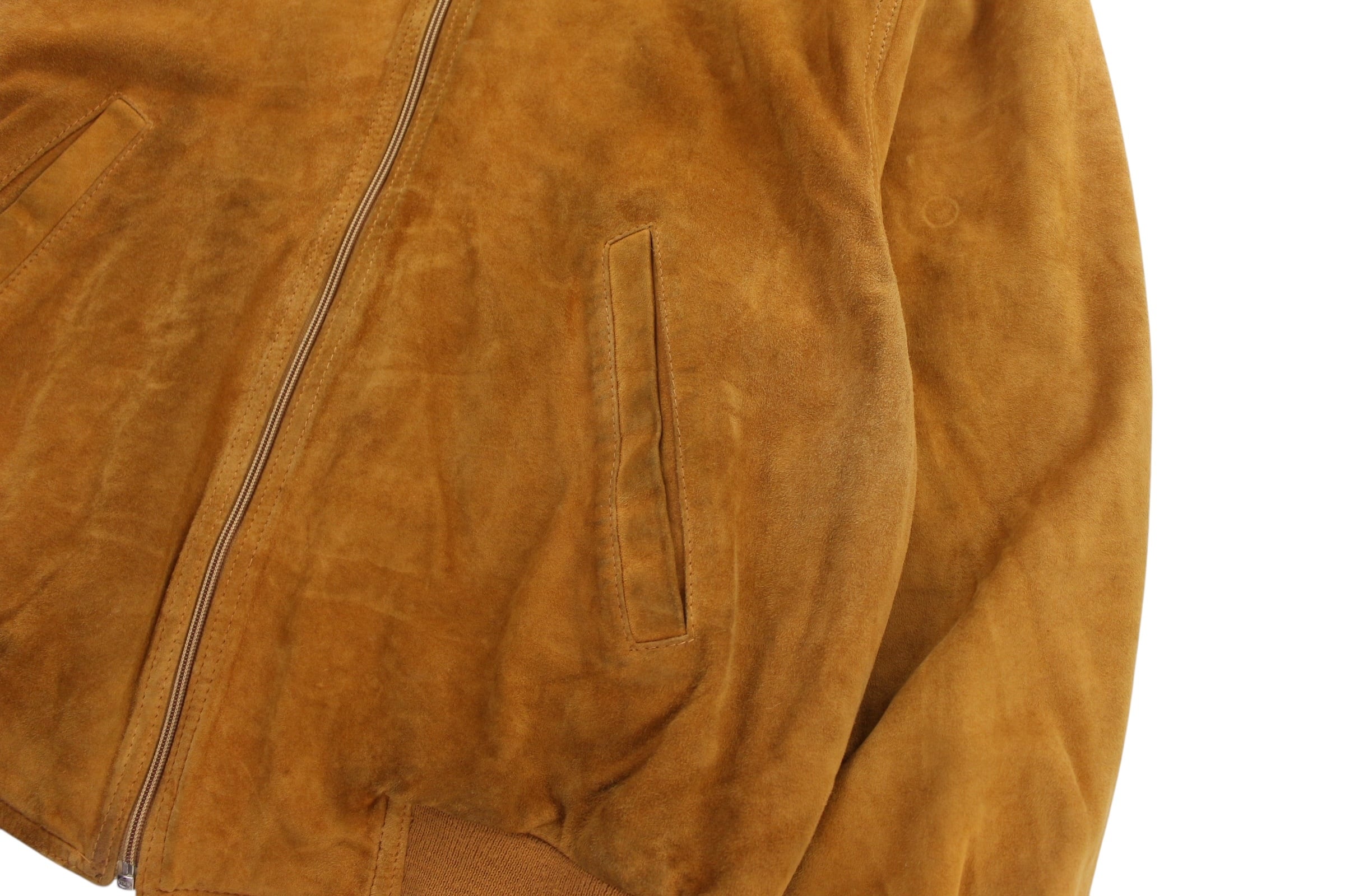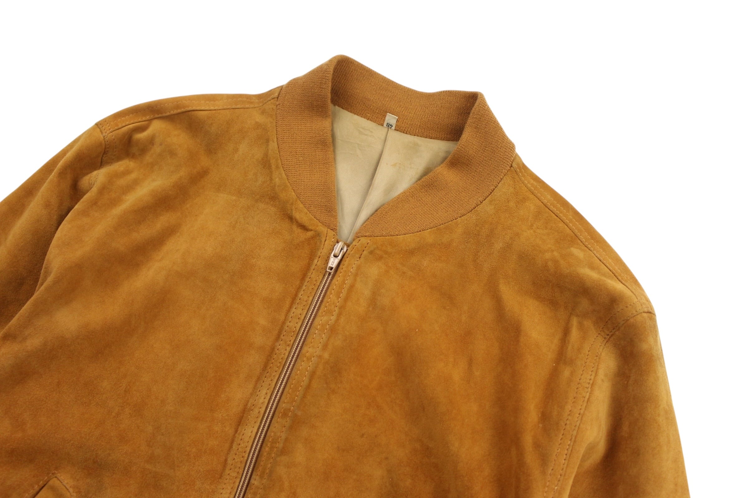 こちらはおそらくリアルスエード素材のレザージャケットになっており襟がスッキリとしたボンバータイプ。
