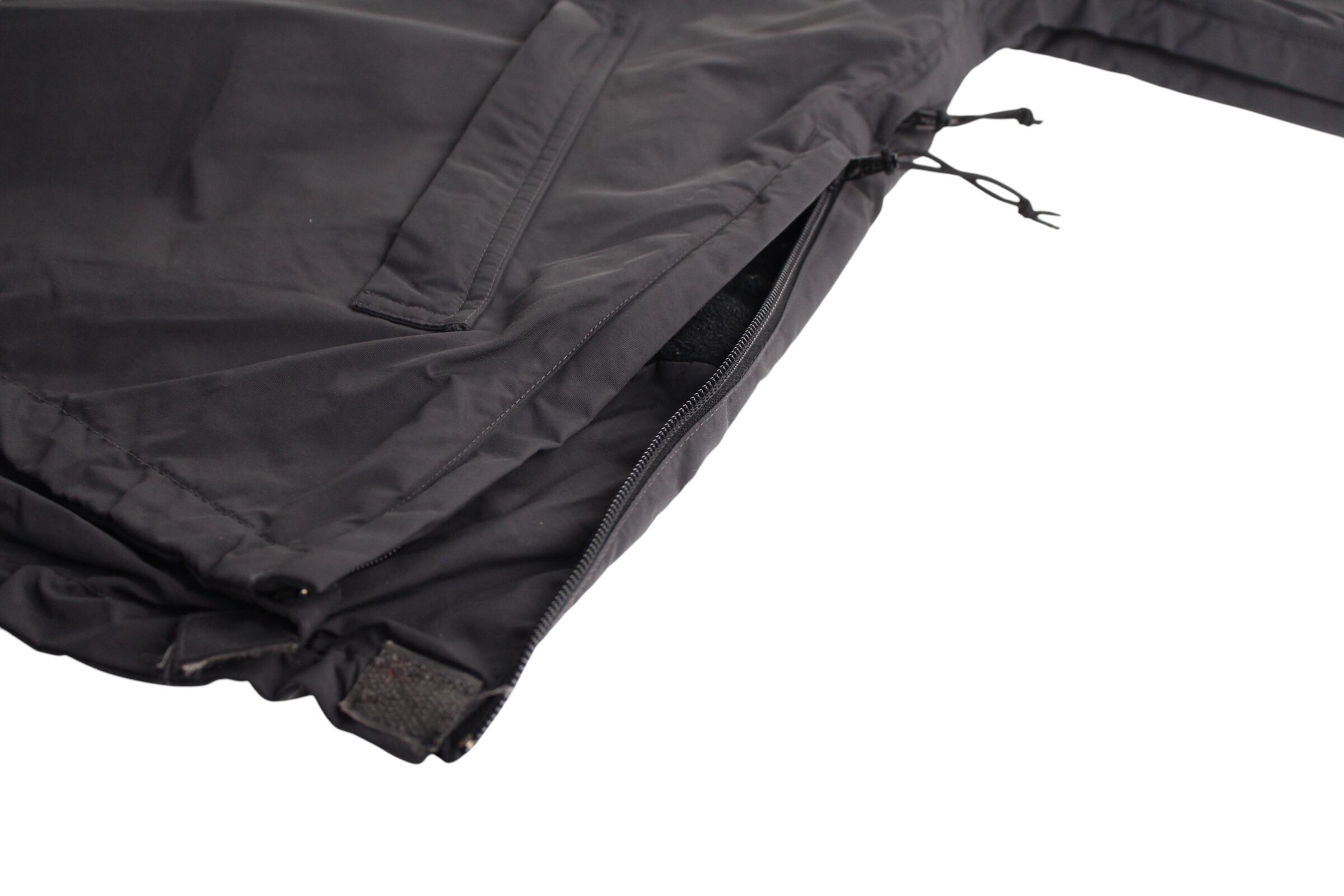 フロントは比翼ハーフジップ仕様にフロントに大きなジップフラップポケット、袖口マジックテープ仕様、両脇下ムレを防ぐベンチレーション、大容量のジップ型のカンガルーポケット、更にはウエストドローコード付きなパーフェクトディテールです