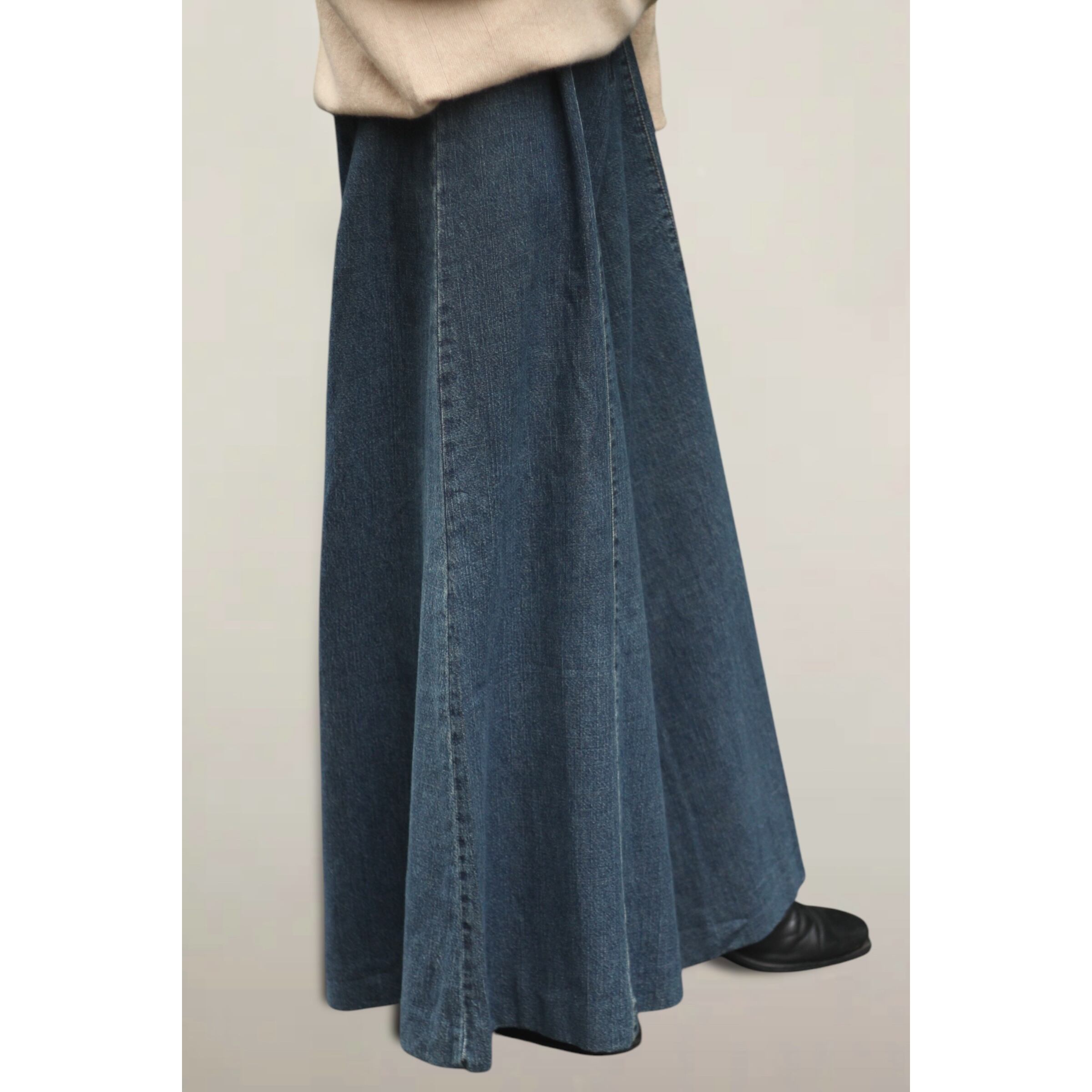 履くとスカートのようにも見える最高なバランス。ライトオンスなのでデニムでは滅多に味わえないドレープ感も味わえます。。