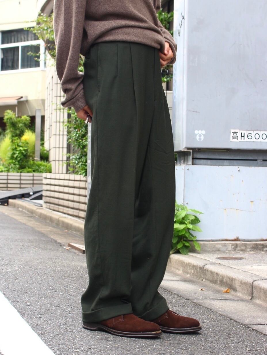 深みと共に、渋みがあるスモークグリーンのカラーリング。黒スラックスまでは行きませんが、ダークトーンのアイテムのため発色のいいアイテム、モノトーンアイテムとの相性は抜群です◎