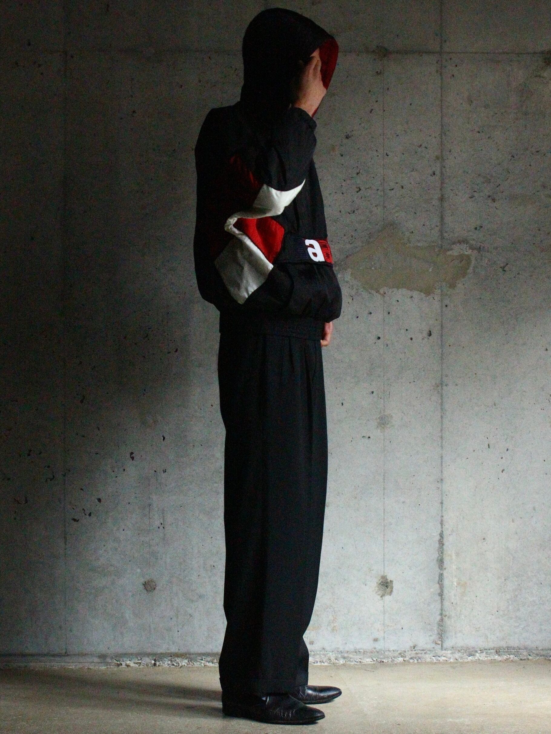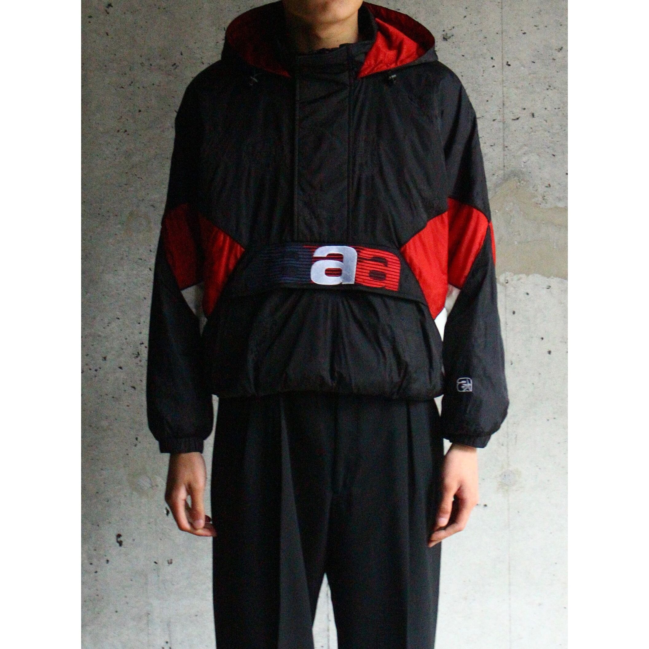 ハーフジップ仕様にジップが隠れる比翼になっておりカンガルーポケットにブランドを象徴する頭文字a3色刺繍。